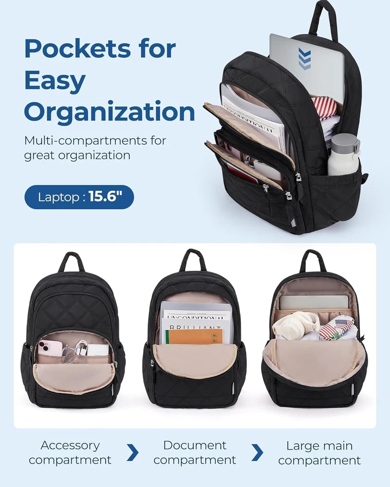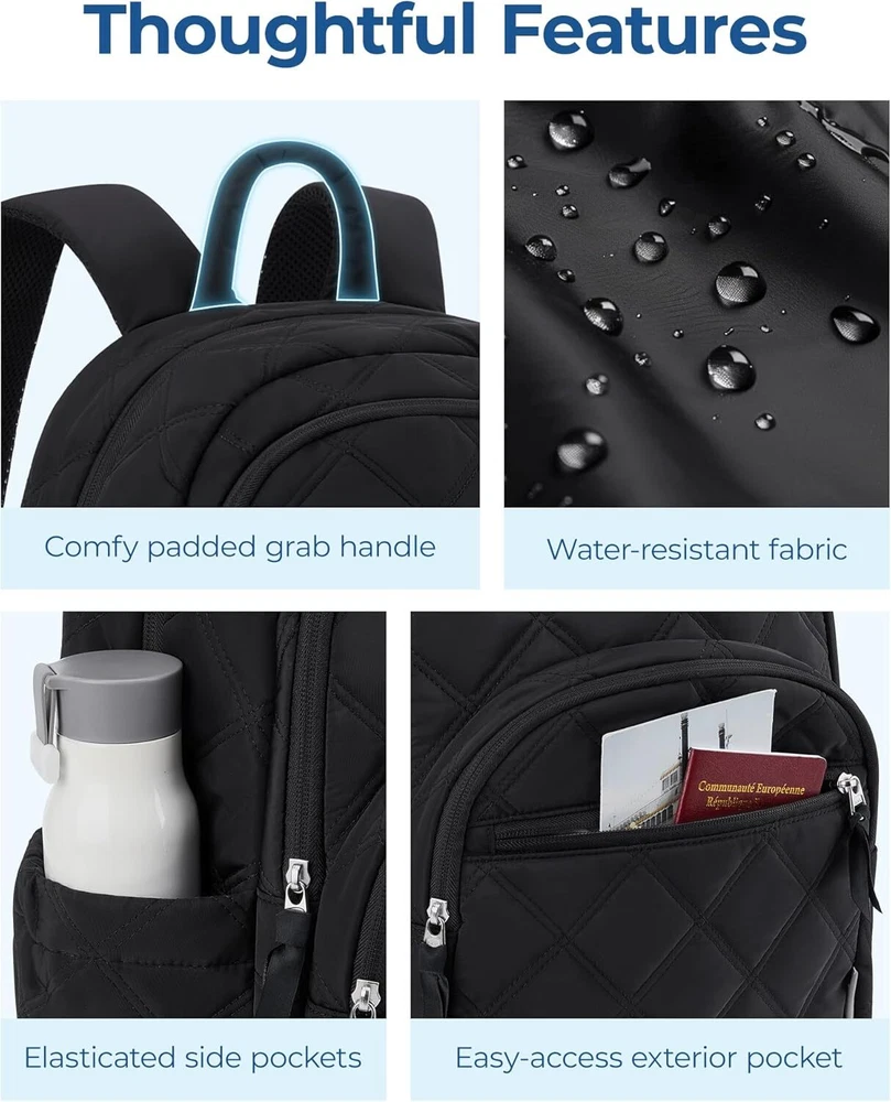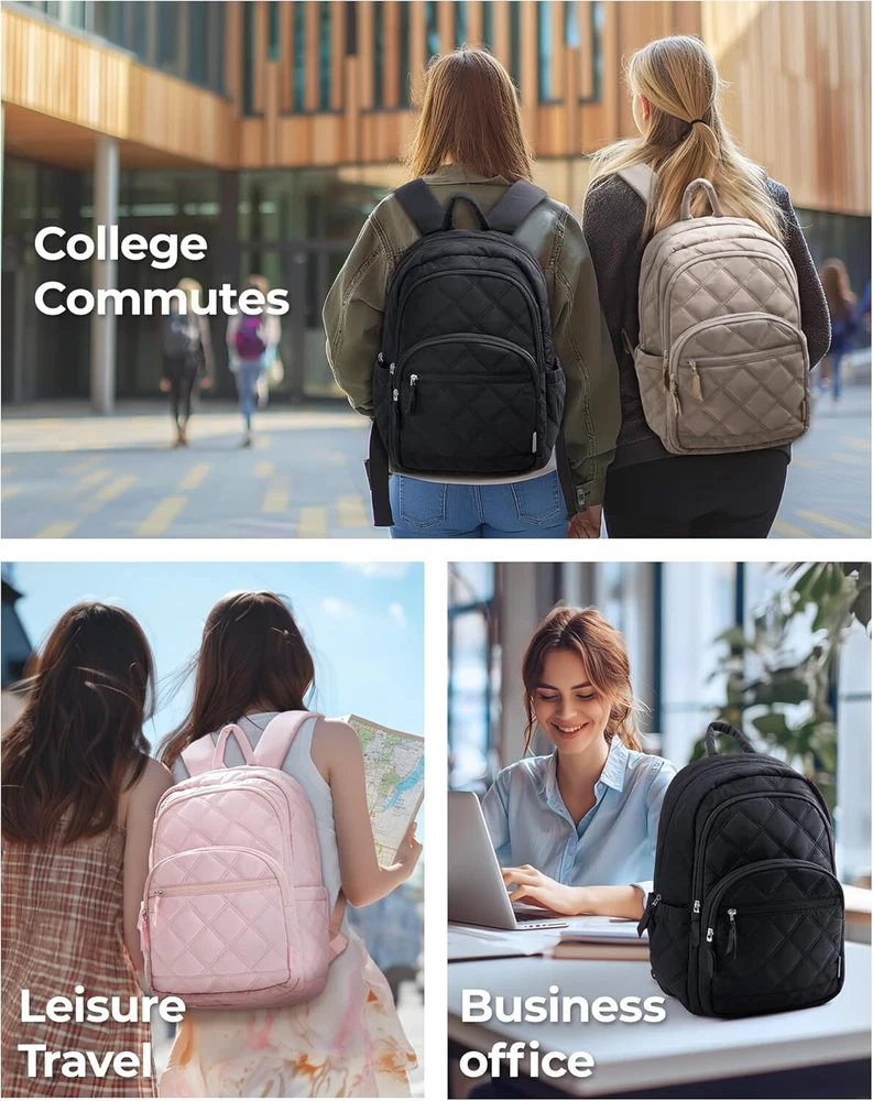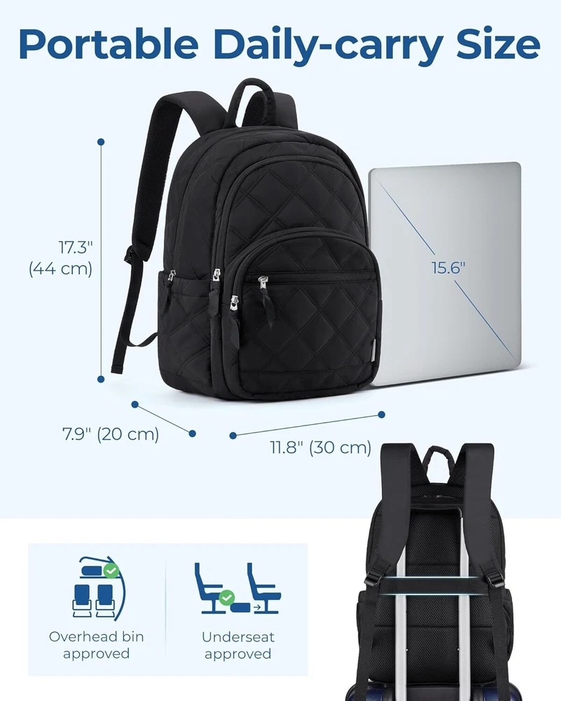 BAGSMAT Travel Laptop Backpack, Cute College Backpack for Women, Black Product Details Ample Storage Capacity: Organize effortlessly with the BAGSMART Laptop women Backpack's spacious compartments. Equipped with 1 large main compartment for books and essentials, a dedicated 15.6" laptop sleeve, two exterior compartments pocket, and a convenient front access pocket for quick-grab items. Dimensions: 17.3×11.8×7.9 inches ensure you have room for everything you need Enhanced Comfort: Enjoy superior comfort on the move with padded, adjustable shoulder straps that distribute weight evenly. The breathable mesh back panel of cute backpack woman provides ergonomic support and keeps you cool during extended wear, ensuring a comfortable carrying experience whether you're loaded with books or traveling light Versatile Travel Companion: Designed for versatility, this travel backpack for women seamlessly integrates into your travel routine. TSA friendly with a back luggage strap for easy attachment to suitcase handles, it's ideal for trips, hikes, and daily commutes. A reliable choice for college, travelers, and adventurers alike Style Meets Practicality: Combining practicality with contemporary style, our small backpack for women allows you to showcase your personal flair without compromising on functionality. Perfect for daily use, work, or leisure, it's a must-have accessory that blends seamlessly into any lifestyle