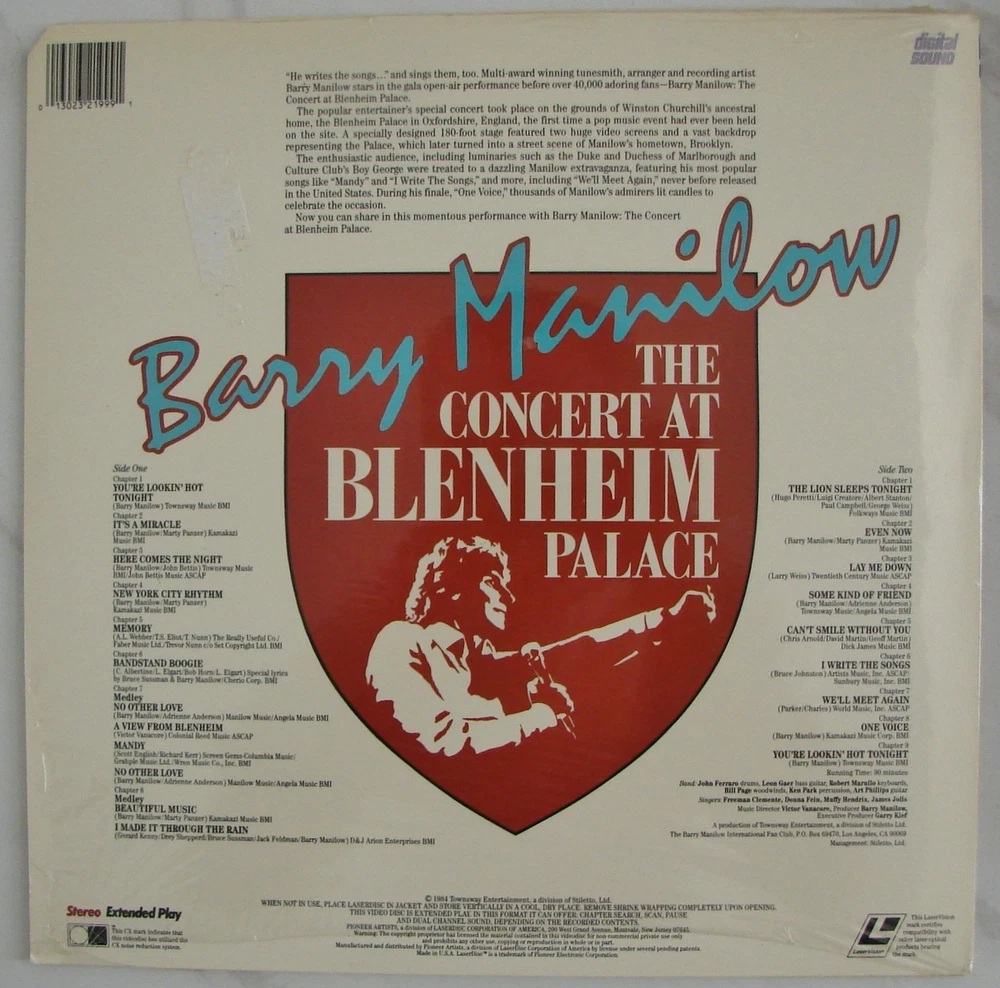 LASERDISC Edition BARRY MANILOW The CONCERT at BLENHEIM Palace ### This is a LaserDisc *** This is Not a DVD ** A Laserdisc needs to be played on a Laserdisc player ** It will not play on a DVD player ### Filmed live in Oxfordshire , England BARRY MANILOW The CONCERT at BLENHEIM Palace LASERDISC Edition Barry Manilow performs his greatest hits on the grounds of the historic Blenheim Palace in England The concert marks the first time a pop event has ever been held at the Churchill family landmark This Laserdisc version contains 4 songs that were not released on the DVD version Program includes : You're Lookin' Hot Tonight ~ It's A Miracle ~ Here Comes the Night ~ New York City Rhythm ~ Memory ~ Bandstand Boogie ~ Medley : No Other Love ~ A View from Blenheim ~ Mandy ~ No Other Love ~~ Medley : Beautiful Music ~ I Made it Through The Rain ~~ The Lion Sleeps Tonight ~ Even Now ~ Lay Me Down ~ Some Kind of Friend ~ Can't Smile without You ~ I Write the Songs ~ We'll Meet Again ~ One Voice ~ You're Lookin' Hot Tonight .................................................................................................................. Laserdisc in NTSC format , Extended Play , Chapters Encoded , Digital Sound , Running Time 90 Minutes Pioneer Artists - Catalog PA 87-181 Laserdisc is NEW - Sealed - Old stock Jacket still in original shrink wrap - never open -- but the Jacket does have a Clearance CUT-OUT Top Corner -- see pictures -- NO holes or other damages to the jacket Buyer pays for shipping costs Please see my other Ebay listings I will combine shipping with other Laserdiscs , when possible , to save you some $$ on shipping costs I will NOT accept returns for wrong purchases I will be No Responsible for Damaged Items during Shipping , Please ask for Insurance if Interested !! Thank You for looking