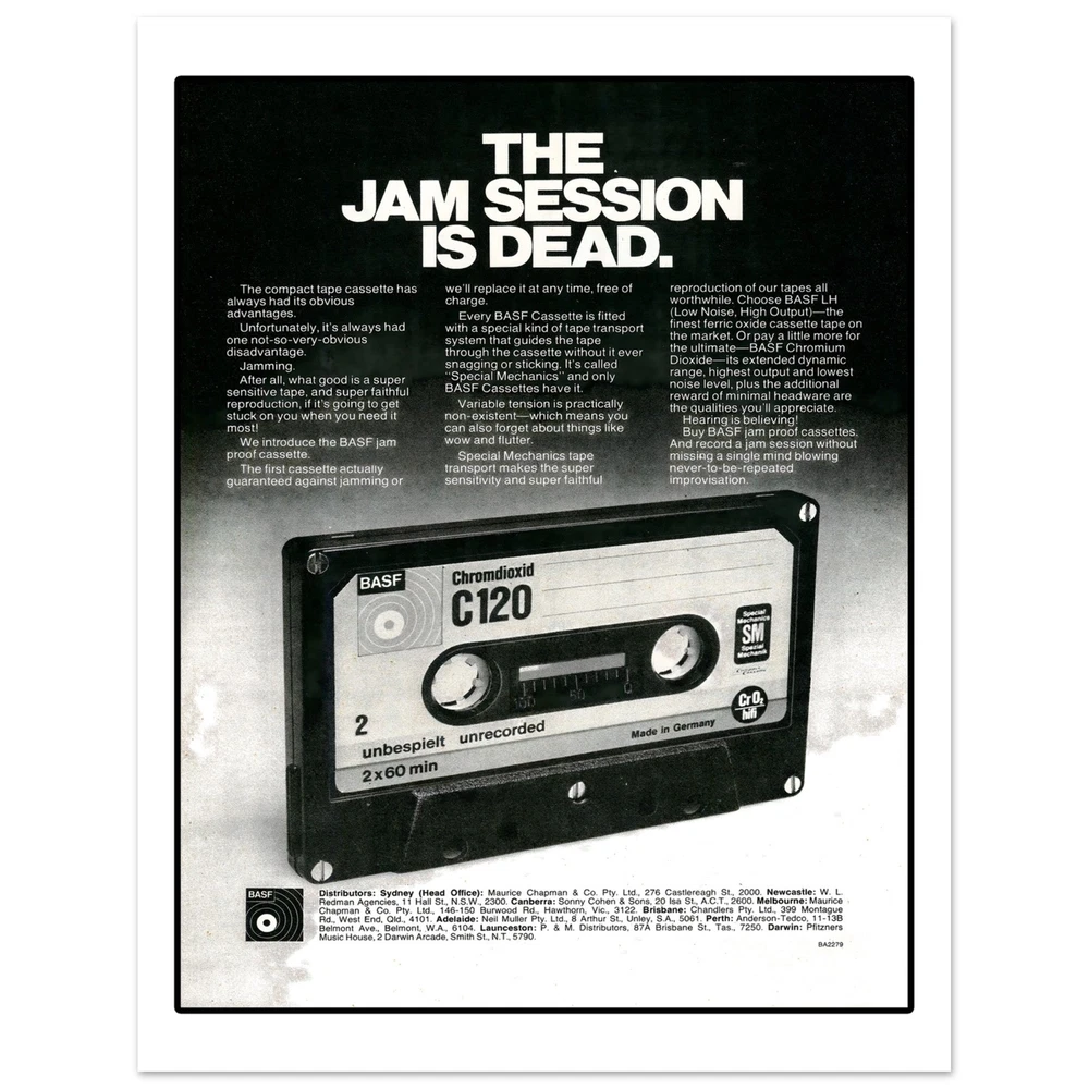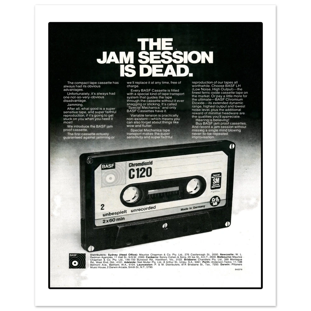 BASF Cassette Tape Eighties Retro Advertisement Art Print Poster All retro advertising prints are created using scans of the original ad. As a result, prints may show signs of age and/or wear or other imperfections. • Digitally Printed.• Sizes available: 8x10, in. 11x14 in, 12x16 in, 16x20 in 18x24 in.• 16x20 in, 18x24 in• Printed with a matte finish on heavy duty archival paper.• 200 GSM heavy weight paper BASF Cassette Tape Eighties Retro Advertisement Art Print Poster All retro advertising prints are created using scans of the original ad. As a result, prints may show signs of age and/or wear or other imperfections. • Digitally Printed. • Sizes available: 8x10, in. 11x14 in, 12x16 in, 16x20 in 18x24 in. • 16x20 in, 18x24 in • Printed with a matte finish on heavy duty archival paper. • 200 GSM heavy weight paper × Shipping info Click the Shipping & Payments tab above the listing description for more info FREE Shipping See more... USPS First Class - $0.00 USPS Priority Mail - $9.95 Click the Shipping & Payments tab above the listing description for more info! Additional delivery notes PICK UP OPTION Sorry, our items are NOT available for pick-up. PAYMENT Immediate payment is required upon selecting "Buy It Now" or upon checking out through the cart. We accept payment via U.S. PayPal accounts and all Major Credit Cards, Debit Cards & Google Pay. We are legally required to collect sales tax in those states and localities where we maintain a physical presence (nexus). The applicable amount of sales tax charged to an order will be calculated based on the shipment destination's state and local sales tax laws. Thank you for shopping with us on eBay! Additional Information No additional information at this time Ask seller a question You might also like Peaches Records & Tapes Est. 1975 Record Shop Music Store Men's Unisex T Shirt T Elmore Elmo James 78 RPM Mississippi Delta Blues Trumpet Record Label Men's T Sh Howlin' Wolf Chicago Blues Men's T Shirt Tee Opryland USA Amusement Park Nashville Retro Unisex T-Shirt Tee Contact To contact our Customer Service Team, simply click the button here and our Customer Service team will be happy to assist. Ask seller a question © Mad Apple Shop Shipping & Payments Shipping is FREE for this item Payment Accepted Payment Methods Immediate payment is required upon selecting "Buy It Now" or upon checking out through the cart. We accept payment via U.S. PayPal accounts and all Major Credit Cards, Debit Cards & Google Pay. We are legally required to collect sales tax in those states and localities where we maintain a physical presence (nexus). The applicable amount of sales tax charged to an order will be calculated based on the shipment destination's state and local sales tax laws. Thank you for shopping with us on eBay! Returns Returns are accepted Items must be returned within 30 days of the auction ending Buyer will pay for return shipping. eBay integration by