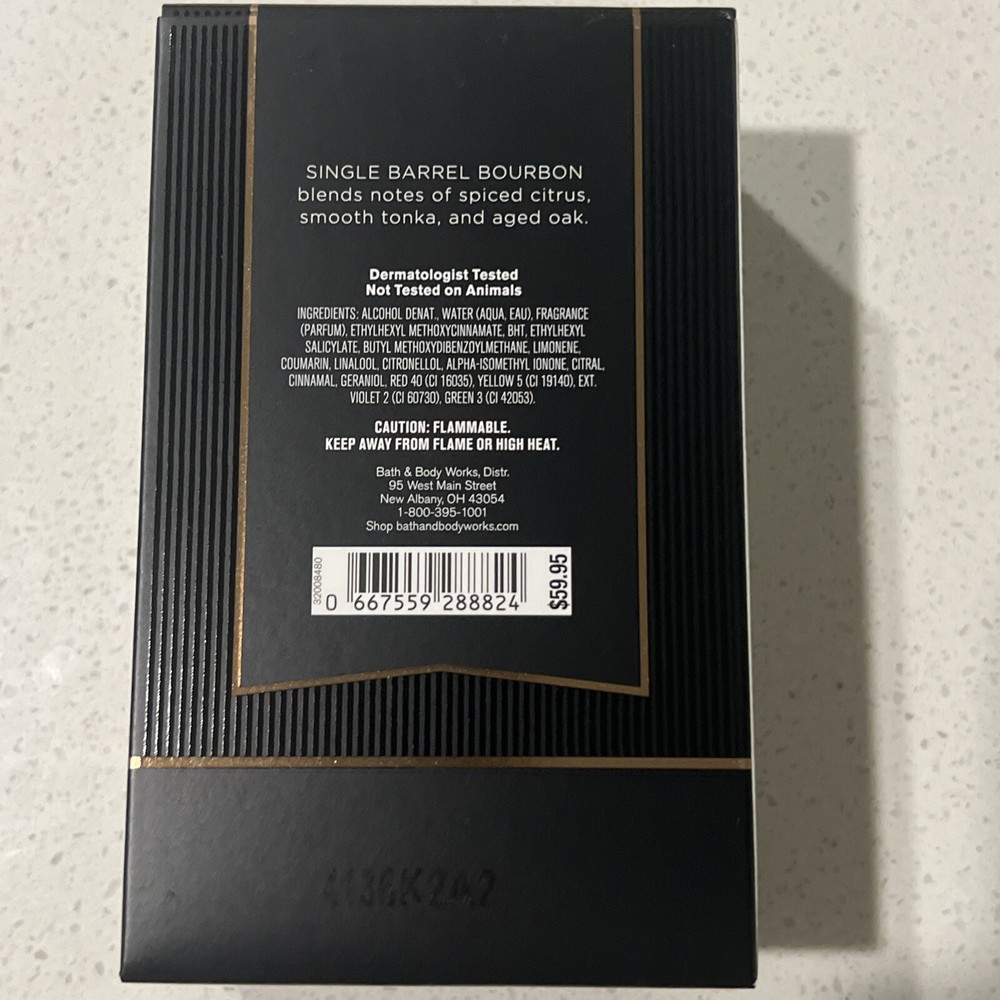 Volume:~ 3.4 OZ ~Modified Item:Nogtin13:Does not applyBrand:~ BATH & BODY WORKS ~UPC:Does not applyNon-Domestic Product:NoMPN:~ COLOGNE ~Custom Bundle:NoFragrance Name:~ SINGLE BARREL BOURBON MEN'S COLLECTION COLOGNE ~Type:~ SINGLE BARREL BOURBON MEN'S COLLECTION COLOGNE ~