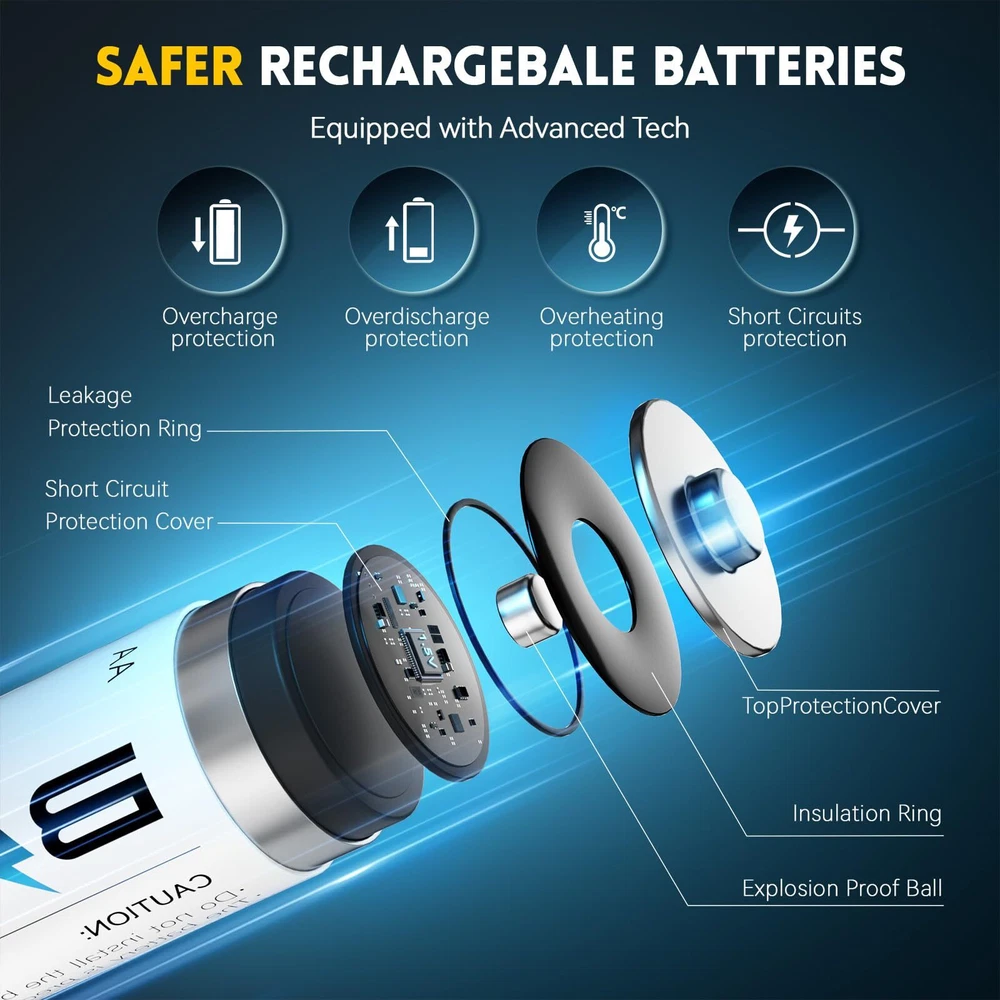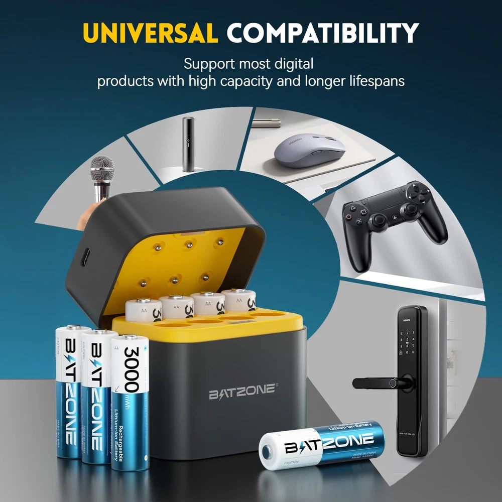 【Ultra-high Capacity and 1.5v Voltage Output】BATZONE rechargeable lithium aa batteries with a high capacity of 3000mWh and higher energy density,which allows for a high number of charge/discharge cycles and a long lifespan.Constant output of 1.5V for the entire process until the power is completely depleted, keeping your device in top condition at all times. 【1600 Times Long Cycle Life】With no memory effect and a very low self-discharge rate, our double a rechargeable lithium batteries have more than 1600 rechargeable cycles, which can save you a lot of money.Overall, rechargeable Lithium AA batteries are a convenient power source,providing a reliable and long-lasting energy supply for everyday use. 【Integrated Charging and Storage】With 8 independent charging slots, the lithium battery charger adopts a magnetic design, allowing the battery charging and storage as one, making the battery storage and carrying more convenient, supporting 1-8 AA lithium batteries in any combination of charging. 【2.5H Fast Charging Technology】2.5 hours quick charge for 1-8pcs aa lithium batteries, reduce your waiting time.Type-C charging port is suitable for all kinds of interface input, you could use a laptop, car charger,power bank,adapters etc. to charge the battery,make the charging more flexible.(Recommended: 5V/3A) 【A Popular Choice for Portable Electronics】BATZONE rechargeable lithium aa batteries with charger feature 3000mWh and 1.5V constant voltage output, ideal for high power consumption devices,such as Gamepad, VR Grip, Doorbell, Camera, Flash, Door Lock, Microphone, Radio, Children's Toys, Alarm Clock, Scale, Blood Pressure Monitor and so on.(Also Suitable for blink camera )