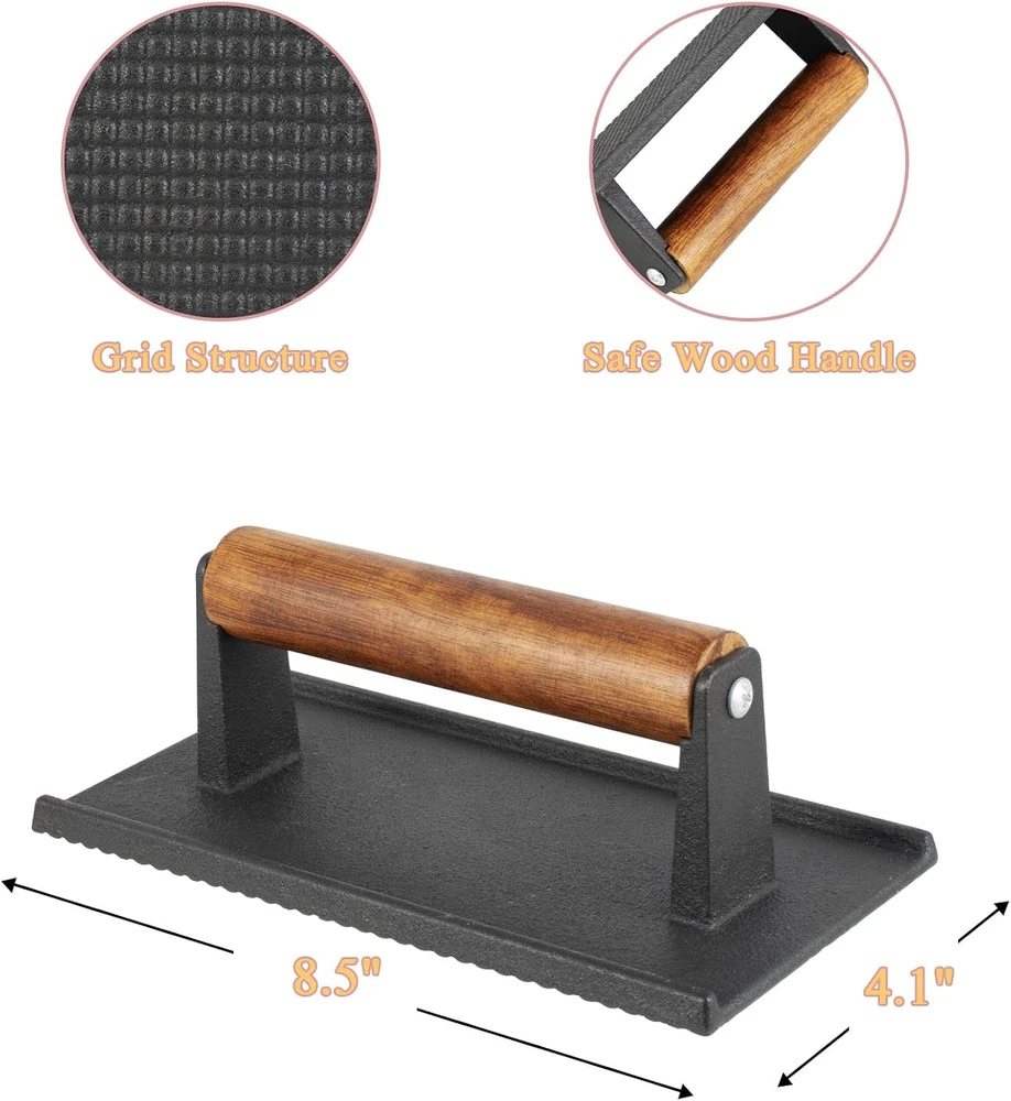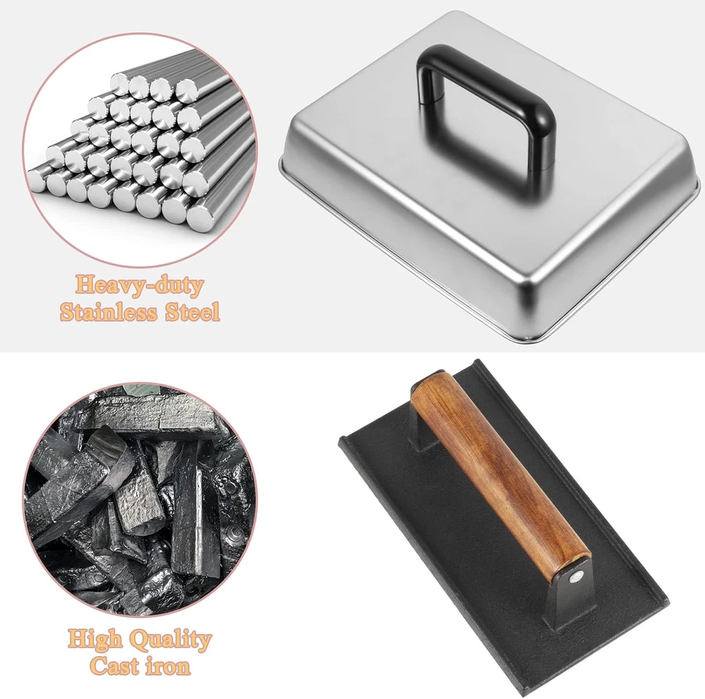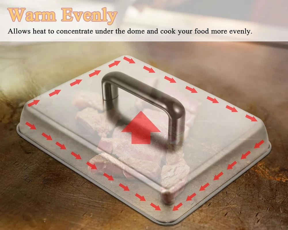 BBQ Melting Dome Basting Cover Grill Press Barbecue Weight Kit for Blackstone Packing include:1*Rectangular Basting Cover and 1* heavy duty cast iron grill press. Rectangular Basting Cover Size: 13 x 9.8 Inch. Heavy duty cast iron grill press size: 8.5 x 4.1 inch This square Rectangular Basting Cover is made from high quality stainless steel, cast iron grill press is made from heavy duty cast iron for a compact and sturdy construction that is built to last, making it ideal for everyday outdoor barbecues and more Heavy-duty cast iron grill press with raised bottom grain to leave attractive grill marks on the grill features a premium wood handle that you can just grip in your hand for use The excellent material makes the grill accessories heat and corrosion resistant and durable. The set is easy to clean, you just need to use soapy water to clean it easily. Reduce the stress of your housework The grill accessory set is perfect for indoor cooking, outdoor grilling, outdoor camping and restaurants. Works with any grill for cooking burgers, meats, buns, fajitas, eggs and more We are always committed to the quality of our products and services, if you have any questions about this, please feel free to cont us, we will provide you with solutions as soon as possible Product Description Rectangular Melting Dome and Grill Press Melting Dome: Measure: 13 x 9.8 inch (L x W) Material: Stainless Steel Grill Press: Measure: 8.5 x 4 inch (L x W) Material: Heavy-duty Cast Iron Feature Heat resistance Sturdy, not easy to deform Keep the flavor Non-stick oil Dishwasher safe Smash Burger Press Rough textured surface helps cook food quickly, add delicious and smoky barbecue flavor in your grills Rectangular Basting Cover Rectangular cheese melting dome is professional indoor and outdoor grill tools Keep the Flavor Perfect for burgers, bacon, beef, flatbreads, sandwiches, quesadillas, paninis, chops and steaks Fit for Blackstone grill accessories Fit for any bbq grills, such as flat top, gas, pellet, teppanyaki Fit for home kitchen, family bbq party, back yard, buffet, restaurant, indoor and outdoor Item model number 13 Inch Basting Cover & Grill Press Closure Type Lid Style Compact Is Microwaveable No Number of Pieces 1 Color silver Product Dimensions 13"L x 9"W Material Stainless Steel, Cast Iron Country of Origin China Is Dishwasher Safe Yes Item Weight 0.71 ounces Shape Rectangular Size 13" x 9" Shipping Fast shipping is very important for us. Our expedited US shipping service is FREE. Your order will be shipped within 2 business days upon full payment received. Your order will be delivered within 2-3 business days after the handling time. Warranty & Returns 30-Day FREE Return Policy offered for unsatisfactory items. Options include: Refund or Exchange for another item. Contact us Customer satisfaction is our top priority. If you encounter any issues with our product, please don't hesitate to reach out to us. We are committed to ensuring your satisfaction and will go above and beyond to assist you. Your happiness is our goal! Thank you for shopping at our store.