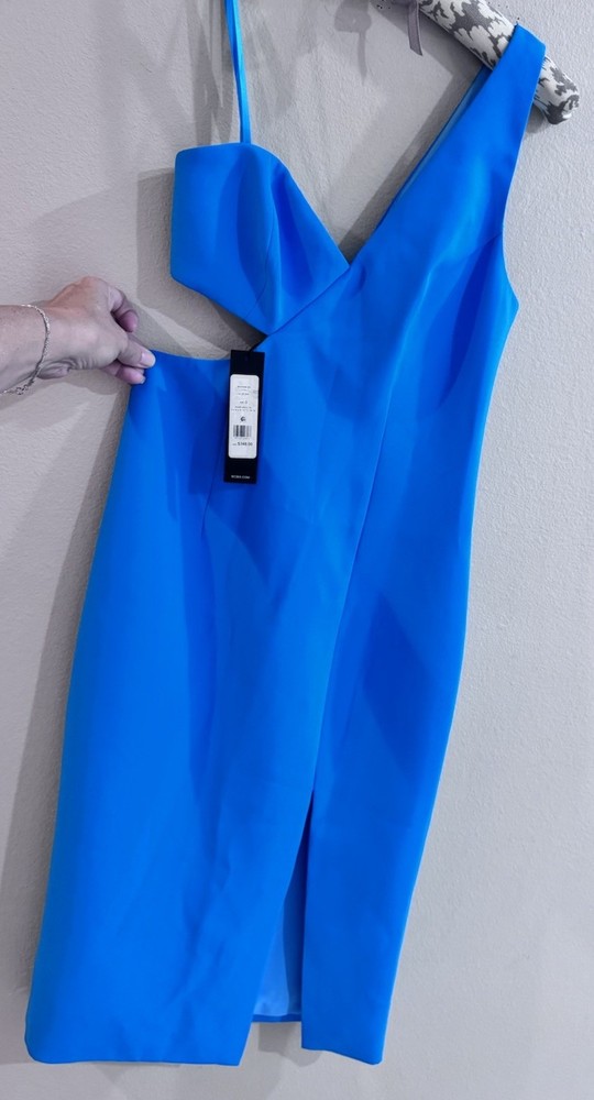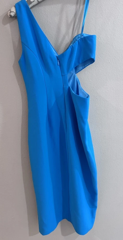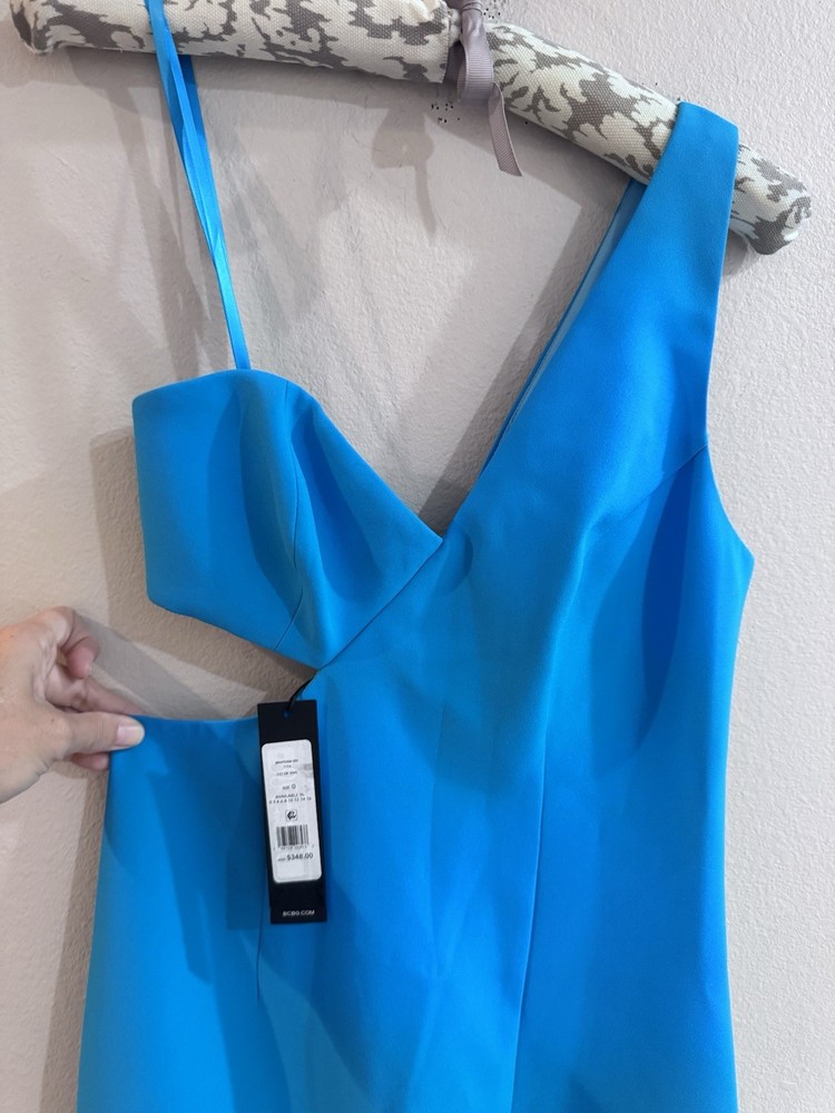 Turn heads in this BCBGMAXAZRIA cyan one-shoulder midi dress , a bold and sophisticated piece designed to flatter with its sleek bodycon silhouette . The asymmetrical neckline with a modern waist cutout adds striking contemporary glamour , while the thigh-high slit offers a touch of alluring elegance and effortless movement. Crafted from high-quality stretch fabric , it ensures both comfort and a secure, curve-hugging fit. Perfect for cocktail parties, evening soirées, weddings, or upscale nights out , this dress embodies vibrant chic, modern femme, and red carpet–inspired style . Pair it with minimalist heels and statement jewelry for a glamorous, show-stopping look that exudes confidence and sophistication .