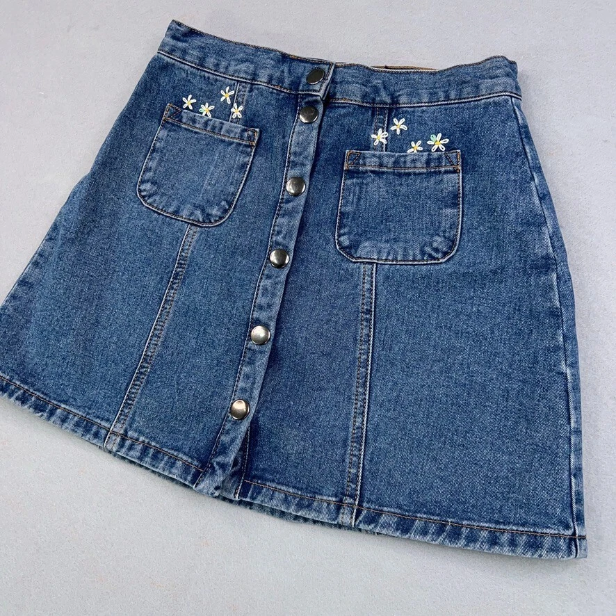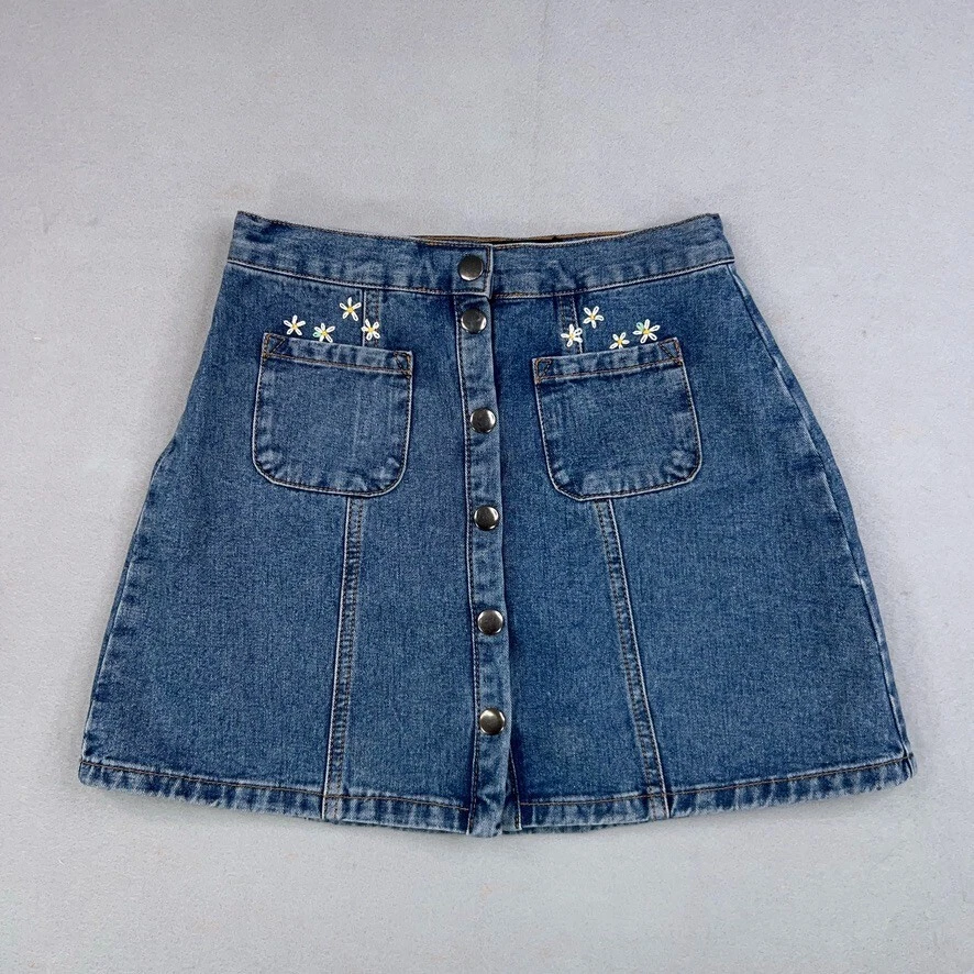 BDG Skirt Women Small Jean Denim Floral Embroidery Button Front Y2K Urban Outfit Condition: - Overall in good used condition. - No rips, stains, or tears. - Nice dainty embroidered flowers above the two front pockets. Size: - Womens small. Measurements: - Previous washings may change the sizing written on the tag. - Please refer to the photos above for all measurements. - Please compare our measurements to that of one of your favorite garments (from the back for tops only) - Please note, item measurements are approximate . All items are bagged and sealed after being photographed, then stored in a smoke free environment to ensure the item is exactly the same as when photographed. I carefully package and ship daily. Feel free to contact me with any questions. All items have been washed per eBay standards & policies.