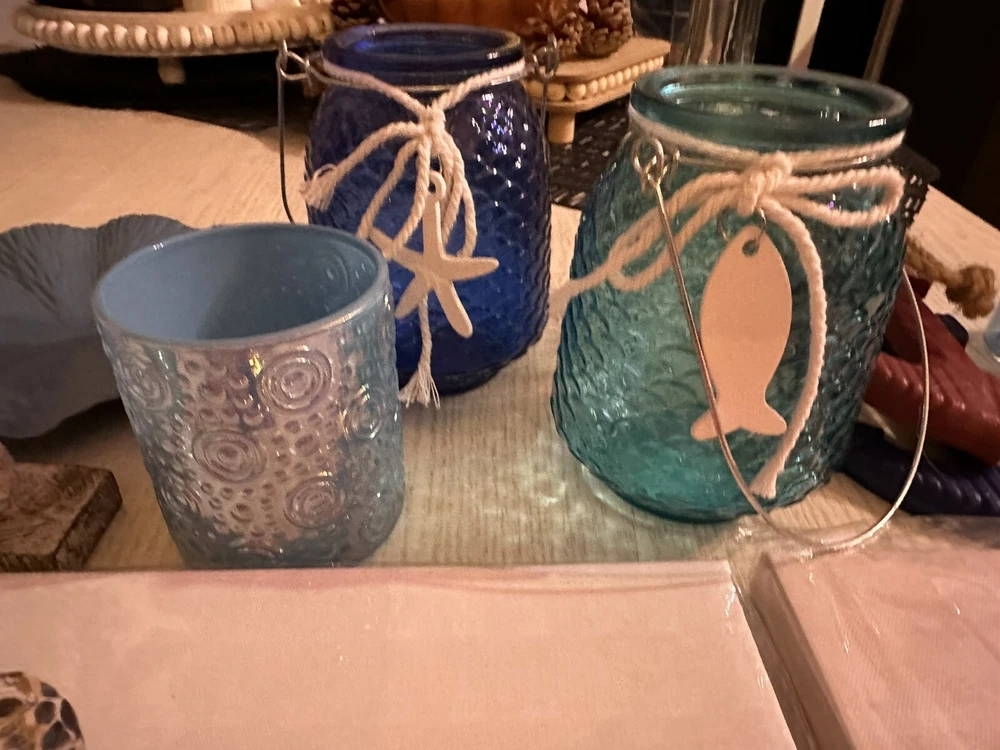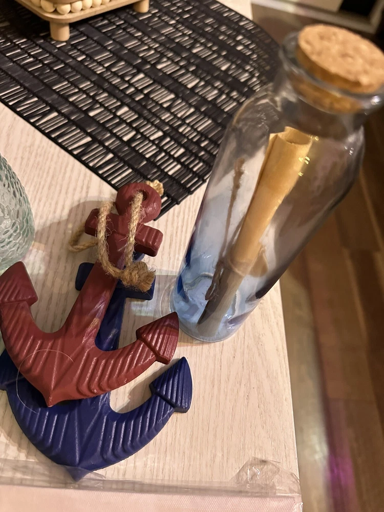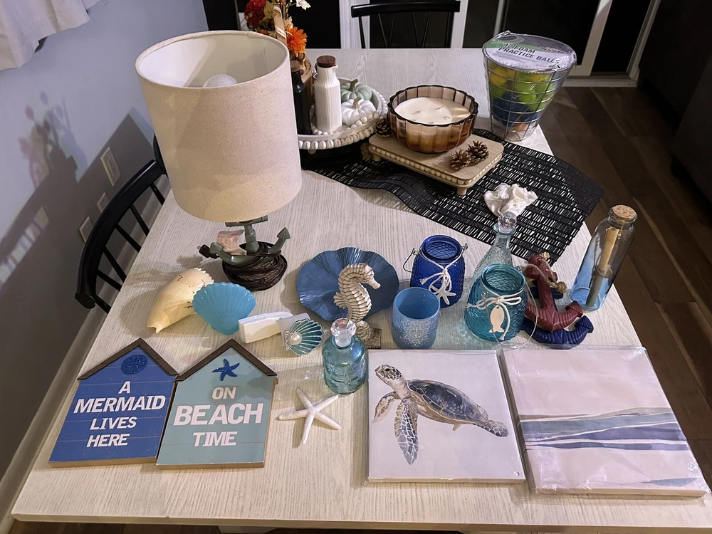 Includes 19 pieces: - [ ] One Anchor Lamp - [ ] 2 Sign Plaques (one says a mermaid lives here the second one says on beach time) - [ ] one Decor shell - [ ] one Blue Shell Light - [ ] one Bath and body works shell wall plug (used) - [ ] one Blue wall plaque - [ ] one Seahorse Decor Figurine - [ ] One Turtle Small Wall Art (New in Package) does have a small hole on bottom right corner - [ ] One Wave Small Wall Art - [ ] one Mini decor starfish - [ ] one Message in a bottle glass decor - [ ] one Blue candle holder - [ ] Two candle holders (one with fish, second one with starfish rope) - [ ] 2 decorative bottles - [ ] 2 Anchor Wall Decor