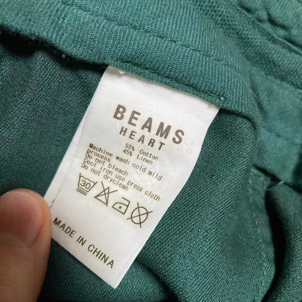 Fit: Slim Personalize: No Style: NA gtin13: Does not apply Product Line: NA Pattern: Floral MPN: NA Features: Pockets Rise: 12.5 in Material: Cotton, Linen Color: Green Accents: NA Size Type: Regular Model: NA Waist Size: 29.9 in Garment Care: NA Type: Pants Theme: NA Department: Men Occasion: Business, Casual, Travel Brand: Beams Handmade: No Season: Fall, Spring, Summer Vintage: No Pocket Type: NA Fabric Type: NA UPC: Does not apply Leg Style: Straight Closure: Button, Drawstring Size: S Inseam: 22.8 in Country/Region of Manufacture: China
