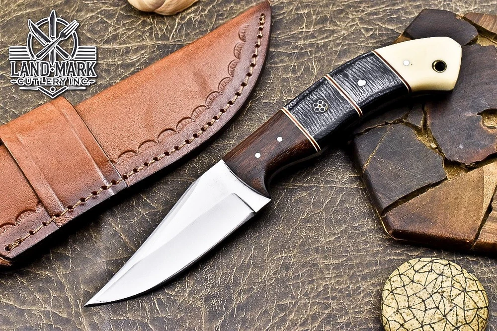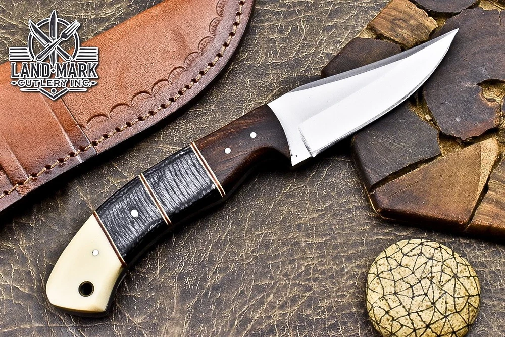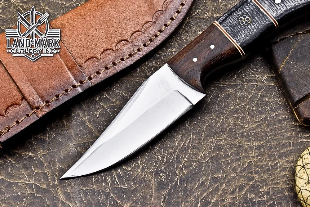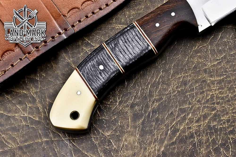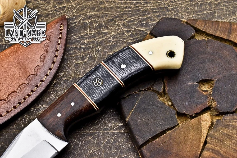 Custom Hand Made D2 STEEL HUNTING KNIFE WITH BEAUTIFUL HANDLE We offer a shipping discount for More then one purchased . And discount will be apply on combine invoice, Discount will not apply on separate payment. ITEM DETAILS OVER ALL LENGTH 8.0 inches long (Approx) HANDLE LENGTH 4.0 inches long (Approx) BLADE LENGTH 4.0 inches long (Approx) BLADE HARDNESS 58-60 HRC Which Holds The Sharp Edge For Long Time. HANDLE WOOD AND BONE COVER LEATHER SHEATH This Awesome custom made KNIFE has a nice hand forged with the combination of 4340 & 1080 steel. HOW OUR DAMASCUS IS MADE: All our Damascus is real and not just an acid etch. Damascus is a mixture of 1080HC and 4340 nickel carbon. You heat them up together and then fold the bar over and over to get the desired layers, ours are 396 layers. Then you burn the blade in acid, and it turns the nickel satin color and the high carbon turns blackish gray. This is how the layers are exposed to show the layers of the new steel created coined "Damascus". All Damascus is acid etched to show the layers. If you high polish the metal it will be shinny satin like all steels. Only after you burn the sides of the blade with acid do you see the layers of the two steels. Makes sense? After we make our knives we high polish the handles and put an edge on the blade. The high polishing buffs off the acid burned layer of the handle, and the blade edge is sharpened and the acid burned edge becomes satin. You can re-burn the tang of the blade near the handles and the edge of the blade and it will show the layers once more. All our knives are hand made, durable and unique ***** YOU WILL RECEIVED THE SAME KNIFE Qality Standards Our Damascus blades are made from high quality non-stainless steels which rival or exceed any Damascus blade made from the 10 series with 4340. Our Damascus combination has taken years to perfect and has been tested under a variety of application which will offer professional performance in categories of toughness, strength (lateral stress) and edge honing and holding ability. In a 5 spot Rockwell test our blades will average near or close to 58 which offers a perfect balances between its toughness and strength.Our blades due to carbon content need to be regularly treated with wax and/or 3 in 1 oil to maintain its superior quality. Questions if you have any question feel free to send us message we aim to answer all questions within 24 hours Feedback If you are not satisfied with our service please contact us before leaving any negative or natural feedback. We will resolve all issues as quickly as possible. Disclaimer We are not responsible for any injuries associated with the use of our tools. Our products are intended for legal use only by responsible buyers. Therefore, we will not sell our products to anyone under the age of 18. Before bidding please check your country laws as some countries Custom don't allow this. If your purchase is held by Custom Authorities in your country/State we will not be responsible for that and no refund will be issued Shipping We offer a 20% shipping discount for More then one purchased . And discount will be apply on combine invoice, Discount will not apply on separate payment We ship within 24 hours after receiving complete payment but this can be delayed due to week ends or Governments and Religious Festivals . . This is beyond our control and we apologize for this inconvenience. Precautions Our Tools are very sharp so open and use them very carefully We are not responsible for any injuries associated with the use of our tools Tips to Care knife 1. NEVER STORE YOUR KNIFE FOR LONG TIME IN LEATHER SHEATH. 2. LEATHER CAN ABSORB WATER, WHICH WILL RUST THE KNIFE. 3. ALWAYS CLEAN THE BLADE AFTER USING WITH OIL OR WAX
