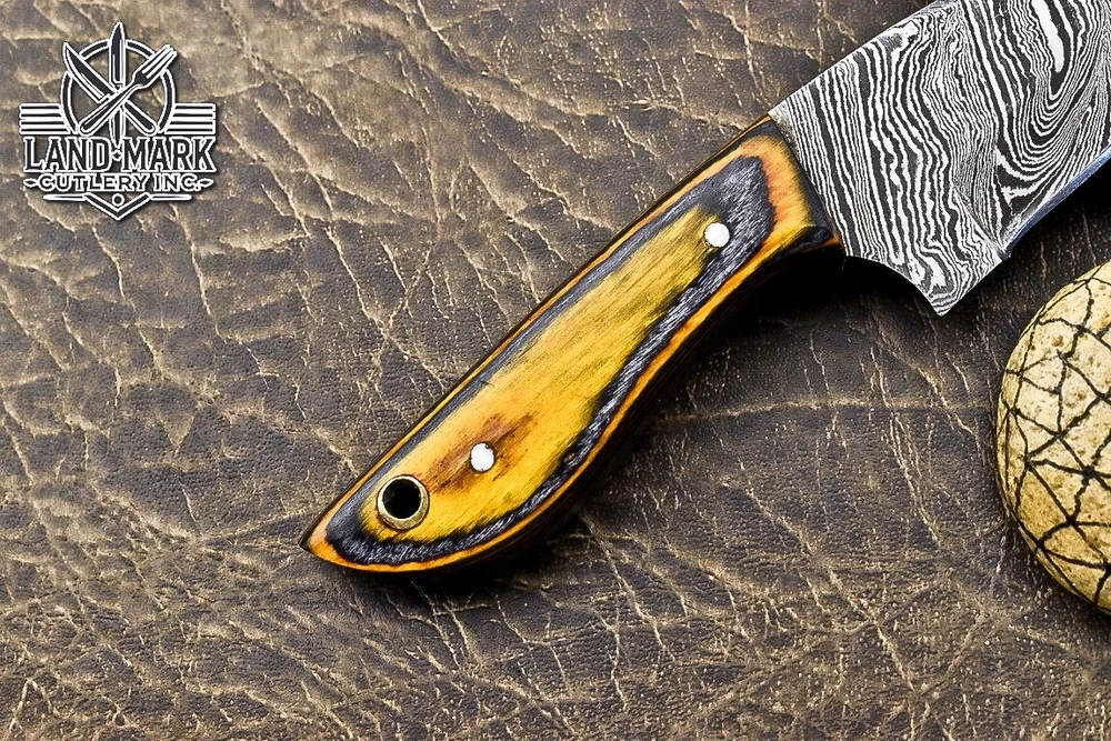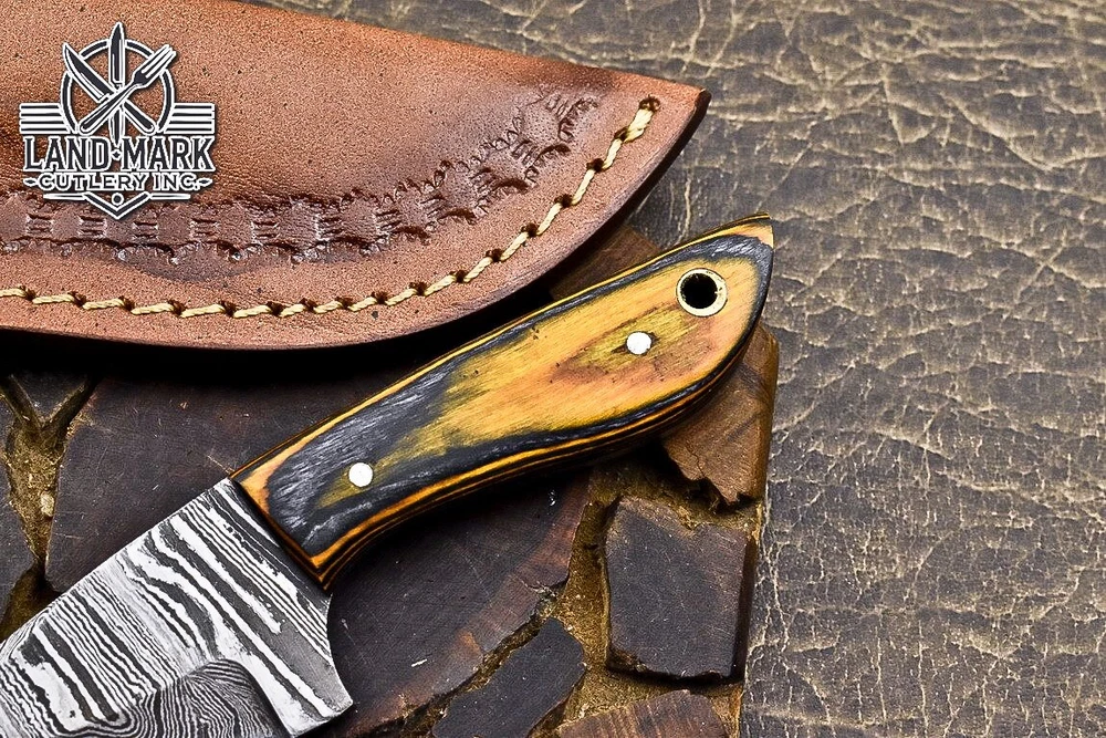 BEAUTIFUL DAMASCUS STEEL HUNTING MINATURE KNIFE WITH ORANGE PAKKA WOOD HANDLE