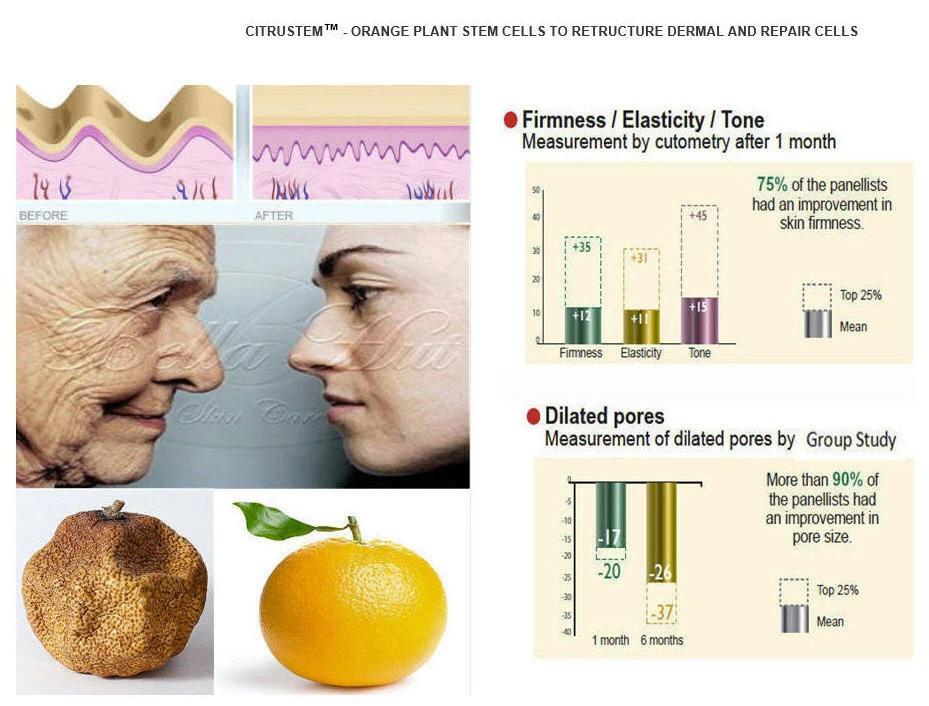 Hyaluronic Acid Cream ( N.A.S.H.A. ) with Lingostem™ and Citrustem ™ Photoaging Repair & Cellular Regeneration (NASHA = Non Animal Stabilized Hyaluronic Acid) The peptides in this HA cream are concentrated and formulated with pure NASHA grade hyaluronic acid for a dramatic filling and plumping effect. This cream stimulates cells to boost production of collagen and elastin. It also enables aged skin tissue to restore itself to a more youthful state while promoting deep tissue repair. The result is a significant reduction in the appearance of wrinkles. Best Used For : Cell repairing, cellular regeneration, builds collagen and restores elasticity. Key Ingredients : Citrustem™ And Lingostem™ Bellahut sells only the highest quality professional skin care products which are also used by a number of spas and treatment centers. Bellahut has been providing high quality skin care products for decades and our customers are our best form of advertisement. Be sure to check out all of their great reviews on our products. Get great quality, brilliant results and all at a fraction of the price here at Bellahut . Feel confident about the product you purchase and know that Bellahut Skin Care is here to provide you with high quality products that are delivered to your door with the greatest of care. Each package is hand packed and wrapped in the appropriate buffer packaging depending on the requirements of the product to make sure it arrives in perfect shape. Each item is inspected before being shipped. Key Ingredients LINGOSTEM ™ is a natural active ingredient based on plant stem cells obtained from the lingonberry. This peptide is designed to protect the skin against UV and IR radiation from the sun. Lingonberries are considered a super food and have benefits such as antioxidant as they contain both vitamin E and C respectively. Lingonberries are also high in compounds including anthocyanins and flavonoids . These compounds have been shown to have anti-inflammatory benefits. In tests 30 volunteers, between 30 and 60 years old. Active formula (1,5% lingostem ™ ) on one half of the face and placebo on the other. Two daily applications, 56 days maximum sun exposure season. Measurements at D0 and D28 . Eye Contour Wrinkles Repairing Effect 32 volunteers, between 40 and 60 years old with photo-aged skin signs. Active formula (1,5% lingostem ™ ) on one half of the face and a forearm, and placebo on the other part of the face and on the other forearm. Two daily applications, 28 days after maximum sun exposure season. Measurements at D0 and D28 . Clear improvement in skin density. SLEB improvement, the less black band, the better dermal matrix. Citrustem ™ is made from orange stem cells and works by organizing the inner structure of the skin for a younger appearance. In facial formulations, it organizes and re-densifies the dermis structure, repairs the extracellular matrix, and improves cellular adhesion. The result is skin that recovers the elasticity it had nearly a decade ago with a softer and more velvety complexion plus a younger appearance. Stem cells are undifferentiated cells found in all multi-cellular organisms. In plants, stem cells are capable of regenerating the entire plant. Hyaluronic acid is a naturally occurring acid found in the extracellular matrix of human tissue. Topically applied hyaluronic acid forms an air permeable layer and penetrates into the dermis thus boosting the elasticity by affecting the collagen levels and increasing hydration of the skin. The protective breathable barrier on the skin locks in moisture which gives the skin a youthful appearance. The cuticular layer of the skin normally contains 10-20% water, however as we age it can drop to below 10%. Hyaluronic acid comes to the rescue with its unique ability to hold more than 1000 ml of water per gram of hyaluronic acid, which is a key factor in allowing the skin to retain more water. Amazingly, hyaluronic acid adjusts its moisture absorption based on the relative humidity in the air. It is the ideal ingredient in skin care products as it adjusts to the skin’s need for a moisturizing effect depending on the relative humidity of seasons and climate of an area. Hyaluronic acid also protects the epidermis by scavenging reactive oxygen species generated by ultra violet light which would normally cause sunspots. Hyaluronic Acid is one of the most exciting ingredients on the market today. It was discovered by Karl Meyer in 1934 and has been successfully used in personal care and wound healing ever since. Until the 1990’s the only method of producing hyaluronic acid was extracting it from rooster combs. Currently there are two forms of hyaluronic acid on the market; one derived from rooster comb and the other derived by the fermentation of yeast. Bellahut only carries the 100% vegan approved material. INCI Purified water, Organic sunflower oil, Jojoba oil, Palm Kernel oil, Coconut oil, Isopropyl myristate , Stearic Acid, Cetyl alcohol ( a vegetable emulsifier ), Glyceryl stearate , Vegetable Glycerin, Phenoxyethanol ( microbe inhibitor ), Sodium stearyl lactylate ( a sugar based moisturizer for the skin ), Caprylyl glycol ( emollient and preservative booster ). Hyaluronic Acid, Glycerin, Lingostem ™, Citrustem ™ Paraben free Fragrance free Sulfate free No artificial fragrance and dyes No animal testing Application and Usage Step 1 : (Optional) Cleanse skin with Bellahut's Soothing Facial Cleanser. Step 2 : (Optional) Apply any of Bellahut's targeted hyaluronic acid serums to any areas that need additional attention. When applying, gently massage into the skin until product is evenly distributed and wait until it is absorbed before applying cream. Step 3 : Apply cream in the morning, evening or morning and evening to dry clean skin. Apply the cream by massaging a dab gently into the skin until absorbed. For external use only. Distributed by Bellahut California Made in U.S.A.