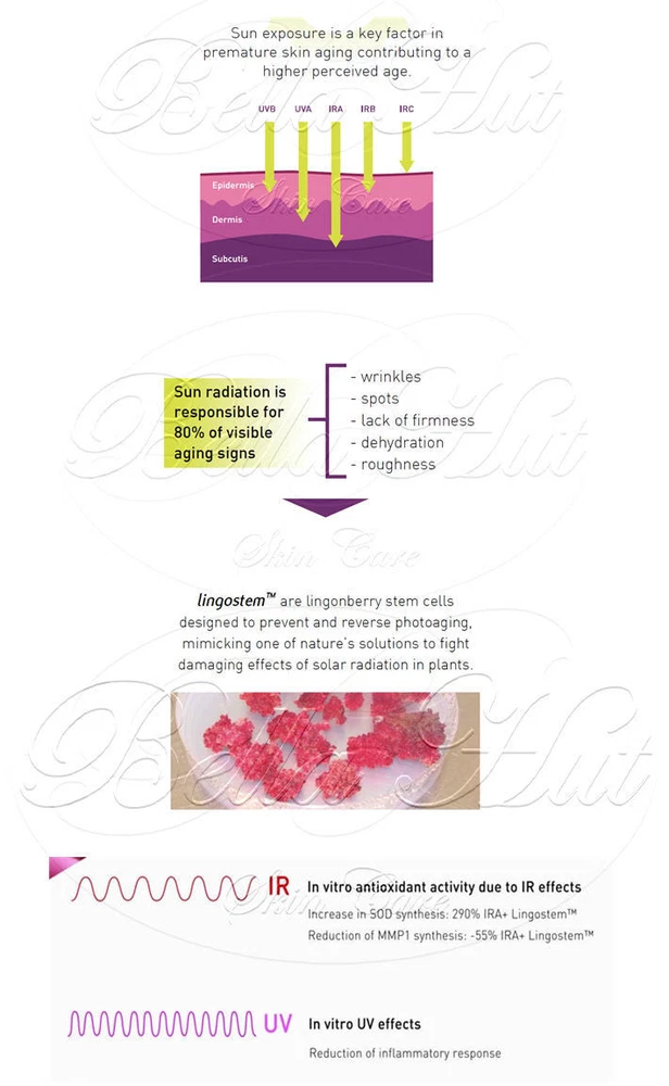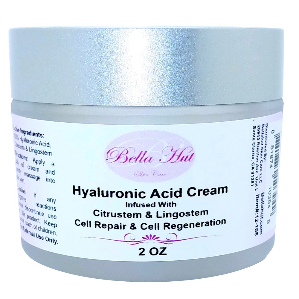 Hyaluronic Acid Cream ( N.A.S.H.A. ) with Lingostem™ and Citrustem ™ Photoaging Repair & Cellular Regeneration (NASHA = Non Animal Stabilized Hyaluronic Acid) The peptides in this HA cream are concentrated and formulated with pure NASHA grade hyaluronic acid for a dramatic filling and plumping effect. This cream stimulates cells to boost production of collagen and elastin. It also enables aged skin tissue to restore itself to a more youthful state while promoting deep tissue repair. The result is a significant reduction in the appearance of wrinkles. Best Used For : Cell repairing, cellular regeneration, builds collagen and restores elasticity. Key Ingredients : Citrustem™ And Lingostem™ Bellahut sells only the highest quality professional skin care products which are also used by a number of spas and treatment centers. Bellahut has been providing high quality skin care products for decades and our customers are our best form of advertisement. Be sure to check out all of their great reviews on our products. Get great quality, brilliant results and all at a fraction of the price here at Bellahut . Feel confident about the product you purchase and know that Bellahut Skin Care is here to provide you with high quality products that are delivered to your door with the greatest of care. Each package is hand packed and wrapped in the appropriate buffer packaging depending on the requirements of the product to make sure it arrives in perfect shape. Each item is inspected before being shipped. Key Ingredients LINGOSTEM ™ is a natural active ingredient based on plant stem cells obtained from the lingonberry. This peptide is designed to protect the skin against UV and IR radiation from the sun. Lingonberries are considered a super food and have benefits such as antioxidant as they contain both vitamin E and C respectively. Lingonberries are also high in compounds including anthocyanins and flavonoids . These compounds have been shown to have anti-inflammatory benefits. In tests 30 volunteers, between 30 and 60 years old. Active formula (1,5% lingostem ™ ) on one half of the face and placebo on the other. Two daily applications, 56 days maximum sun exposure season. Measurements at D0 and D28 . Eye Contour Wrinkles Repairing Effect 32 volunteers, between 40 and 60 years old with photo-aged skin signs. Active formula (1,5% lingostem ™ ) on one half of the face and a forearm, and placebo on the other part of the face and on the other forearm. Two daily applications, 28 days after maximum sun exposure season. Measurements at D0 and D28 . Clear improvement in skin density. SLEB improvement, the less black band, the better dermal matrix. Citrustem ™ is made from orange stem cells and works by organizing the inner structure of the skin for a younger appearance. In facial formulations, it organizes and re-densifies the dermis structure, repairs the extracellular matrix, and improves cellular adhesion. The result is skin that recovers the elasticity it had nearly a decade ago with a softer and more velvety complexion plus a younger appearance. Stem cells are undifferentiated cells found in all multi-cellular organisms. In plants, stem cells are capable of regenerating the entire plant. Hyaluronic acid is a naturally occurring acid found in the extracellular matrix of human tissue. Topically applied hyaluronic acid forms an air permeable layer and penetrates into the dermis thus boosting the elasticity by affecting the collagen levels and increasing hydration of the skin. The protective breathable barrier on the skin locks in moisture which gives the skin a youthful appearance. The cuticular layer of the skin normally contains 10-20% water, however as we age it can drop to below 10%. Hyaluronic acid comes to the rescue with its unique ability to hold more than 1000 ml of water per gram of hyaluronic acid, which is a key factor in allowing the skin to retain more water. Amazingly, hyaluronic acid adjusts its moisture absorption based on the relative humidity in the air. It is the ideal ingredient in skin care products as it adjusts to the skin’s need for a moisturizing effect depending on the relative humidity of seasons and climate of an area. Hyaluronic acid also protects the epidermis by scavenging reactive oxygen species generated by ultra violet light which would normally cause sunspots. Hyaluronic Acid is one of the most exciting ingredients on the market today. It was discovered by Karl Meyer in 1934 and has been successfully used in personal care and wound healing ever since. Until the 1990’s the only method of producing hyaluronic acid was extracting it from rooster combs. Currently there are two forms of hyaluronic acid on the market; one derived from rooster comb and the other derived by the fermentation of yeast. Bellahut only carries the 100% vegan approved material. INCI Purified water, Organic sunflower oil, Jojoba oil, Palm Kernel oil, Coconut oil, Isopropyl myristate , Stearic Acid, Cetyl alcohol ( a vegetable emulsifier ), Glyceryl stearate , Vegetable Glycerin, Phenoxyethanol ( microbe inhibitor ), Sodium stearyl lactylate ( a sugar based moisturizer for the skin ), Caprylyl glycol ( emollient and preservative booster ). Hyaluronic Acid, Glycerin, Lingostem ™, Citrustem ™ Paraben free Fragrance free Sulfate free No artificial fragrance and dyes No animal testing Application and Usage Step 1 : (Optional) Cleanse skin with Bellahut's Soothing Facial Cleanser. Step 2 : (Optional) Apply any of Bellahut's targeted hyaluronic acid serums to any areas that need additional attention. When applying, gently massage into the skin until product is evenly distributed and wait until it is absorbed before applying cream. Step 3 : Apply cream in the morning, evening or morning and evening to dry clean skin. Apply the cream by massaging a dab gently into the skin until absorbed. For external use only. Distributed by Bellahut California Made in U.S.A.