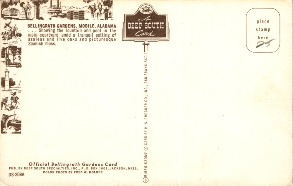 Bellingrath Gardens is located in Mobile, Alabama, and is known for its picturesque beauty and serene atmosphere. The postcard features a fountain and pool in the main courtyard surrounded by azaleas, live oaks, and Spanish moss. The gardens are a popular tourist attraction and cover 65 acres of land.