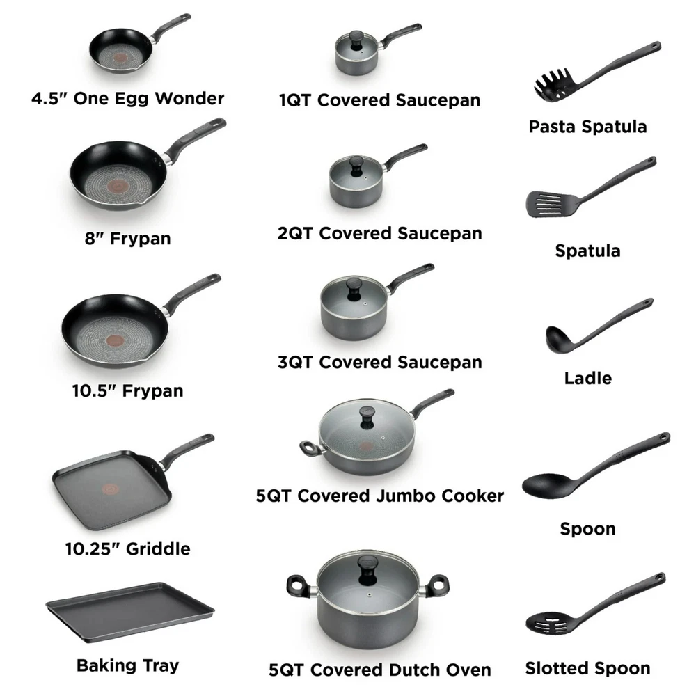 Product details Cooking and cleaning made easy with T-fal Easy Care Nonstick 20-Piece Set, ensuring reliable results when preparing meals for the whole family. Includes 4.5" One Egg Wonder, 8" fry pan with pouring spouts, 10.5" fry pan with pouring spouts, 10.25" griddle, 5QT jumbo cooker with glass lid, 1QT saucepan with glass lid, 2QT saucepan with glass lid, 3QT saucepan with glass lid, 5QT stewpot with glass lid, baking tray, pasta spatula, spatula, ladle, spoon, and slotted spoon. Pro-Glide non-stick interior ensures easy food release, and enables healthy cooking with little to no oil. Thermo-Spot heat indicator shows when T-fal pans are perfectly preheated to start cooking, and the even heat base allows for no hot spots. Features comfortable handles and vented tempered glass lids. Dishwasher and oven safe up to 350°F; all cook tops compatibility excluding Induction; limited lifetime warranty. Proglide Nonstick Interior: Easy release and cleanup Thermo-Spot Technology: Turns solid red to indicate when the pan is properly preheated Comfortable Handle: Sturdy and secure grip Measuring Marks: No need for a measuring cup Vented Glass Lid: Maintain visibility while trapping heat and moisture Dishwasher and Oven Safe: Up to 350°F All Cooktops Compatibility: Excluding Induction LIMITED LIFETIME WARRANTY This 20 Pcs PTFE Non-Stick Cookware Set includes 4.7" Frypan, 8" Frypan, 10.5" Frypan, 1QT Saucepan with lid, 2QT Saucepan with lid, 3QT Sautepan with lid, 5QT Jumbo Cooker with lid, 5QT Stewpot with lid, 10.25" Square Griddle, 13" x 9" Baking Tray, 5 tools Brand T-fal Collection Easy Care Nonstick Piece Count 20 Material Aluminum Pan Material Nonstick Handle Finish Plastic Items Included 4.5" One Egg Wonder, 8" fry pan with pouring spouts, 10.5" fry pan with pouring spouts, 10.25" griddle, 5QT jumbo cooker with glass lid, 1QT saucepan with glass lid, 2QT saucepan with glass lid, 3QT saucepan with glass lid, 5QT stewpot with glass lid, baking tray, pasta spatula, spatula, ladle, spoon, and slotted spoon Color Gray Nonstick Y Features Nonstick, Oven Safe Cleaning, Care & Maintenance Dishwasher safe Manufacturer Groupe SEB Manufacturer Part Number B087SKDW Model B087SKDW Assembled Product Dimensions (L x W x H) 25.20 x 12.60 x 15.94 Inches