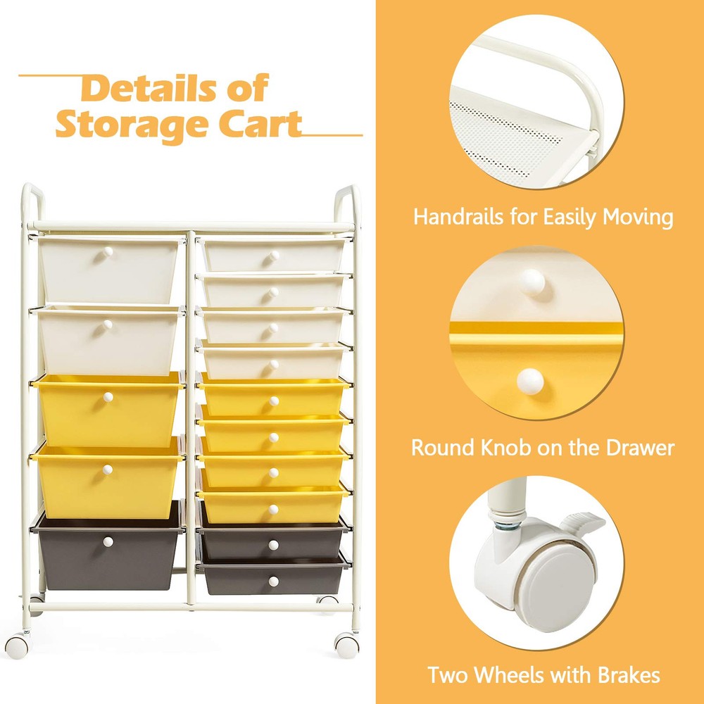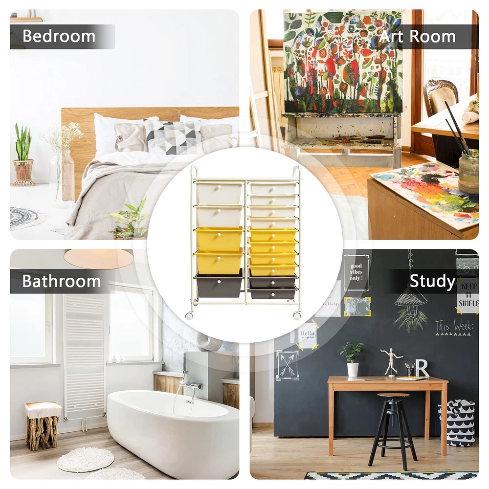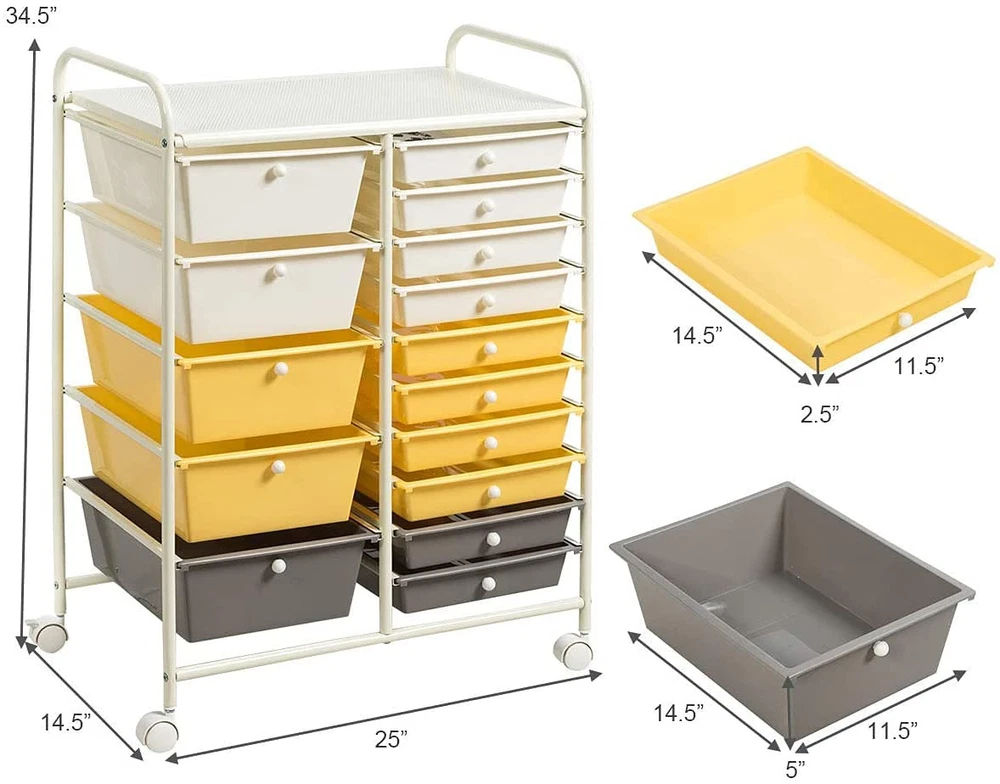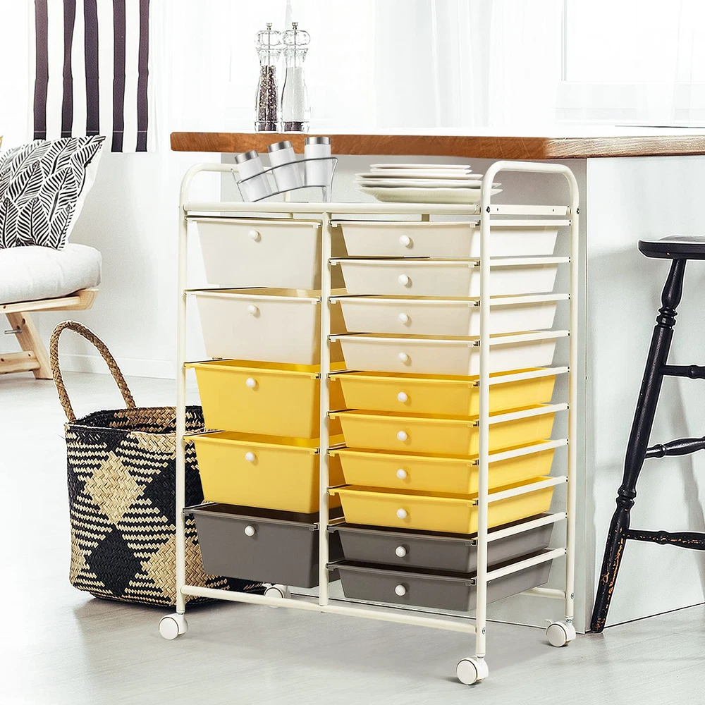 Description: This 15-drawer rolling storage cart features a vertical design that provides ample space for office supplies such as notepads, pens, staples and paper clips, while saving floor space. At the same time, each drawer is equipped with metal knobs for easy pulling. The cart is made of high-strength galvanized iron pipe, which is very durable for long-term use. There are 4 wheels underneath, which makes it easy for you to move it to any place. Better yet, there are multiple colors for you to choose, so you can put it in your office, home, garage or wherever you need to organize it according to your preference and the style of the room. Features: 15 removable drawers for classified storage Metal frame and plastic drawers, sturdy and durable 4 universal wheels (2 with lock) for easy movement and fixation Drawers slide through metal channels with no resistance Drawer with metal knob for easy closing and opening Easy to pull or push the cart with 2 handles on the top Spacious storage space on the top of the cart Ideal drawer storage cart for home, office, garage and school Drawers are easy to clean with a damp cloth Easy to assemble in short time according to instruction Specifications: Materials: Steel Frame, Plastic Drawers Overall Dimensions: 24.6” x 14.5” x 34.2” (L x W x H) Inner Size of Big Drawer: 13.5” x 9” x 4.5” (L x W x D) Inner Size of Small Drawer: 13.5” x 9” x 2” (L x W x D) Diameter of Wheel: 1.5” Package Includes: 1 X 15 Drawers Rolling Cart 1 X User’s Manual 【Large Storage Space w/ 2 Types of Drawers】15 removable drawers on metal rails provide you with a large space for keeping your home office supplies tidy and close. Offering sizes of drawers, this mobile organizer provides flexible storage solution to organize makeup and cosmetics, storing arts and crafts supplies, and arranging tools for use in the garage. It is easy to find something after you keep them in order. 【Stable Vertical Frame w/Chrome】The whole frame is made of chrome steel, which is very strong enough to support all the things you put inside. And the cart is not easily deformed or cracked, providing long time service. And 15 drawers are made of high-quality plastic. Even better, the vertical design also saves space greatly. 【Easy to Move w/Universal Wheel】360-degree rotating casters are able to change the direction of movement freely. In addition, if you want it to stay in a certain place, the lockable brake design ensures its stability. Plus, the casters will not scratch the ground when moving. 【Thoughtful Design w/ Handles & Mesh Top】This multipurpose storage cart is equipped with 2 top handles, which bring great convenience to moving the drawer cart. Meanwhile, the mesh top can be used as a perfect table top for storing or displaying anything you want. 【Eye-catching Drawers for Various Place】This 15-drawer Organizer with five different colors look attractive and eye-catching. The cart is perfectly to be placed in office, home, living room, entryway, bathroom, school, garage etc.