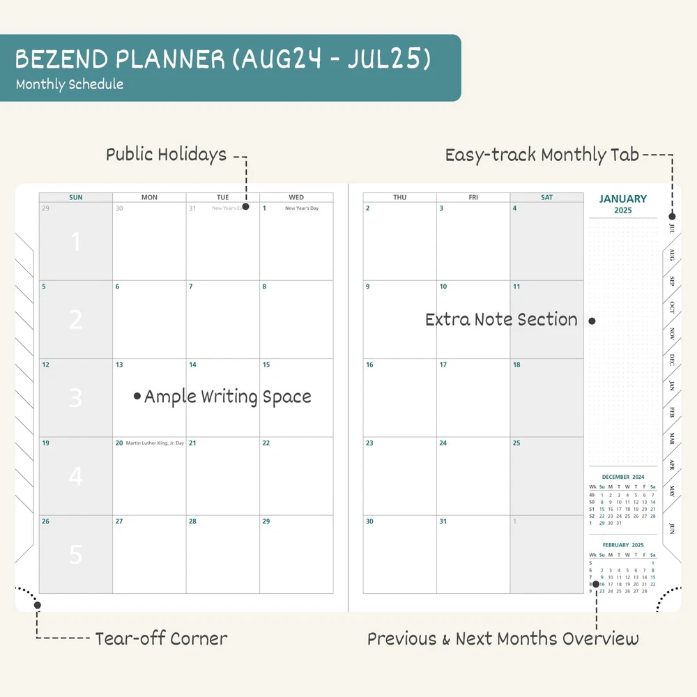 BEZEND Planner 2024-2025, Large Size 8.5" x 11" Weekly Notebook Academic Calender-120 GSM Thick Paper-12 Months (July 24 - June 25) Daily Weekly and Monthly with Tabs, Inner Pocket, Hard Cover (Night Blue) US-NEW-AP280C01NH-25-NB planner 2024-2025 ✅ UPCOMING ACADEMIC YEAR - Covering the whole academic year (12 months JULY 2024-JUNE 2025), our weekly/monthly/yearly planner is all about setting you up to succeed at school and in life with a better grasp on time management ✅ WEEKLY / MONTHLY PLANNING – Double-page monthly spread with previous and next month reference allows long-term planning. One-page weekly section then displayed with a dotted page helps with more detailed and personalized planning. ✅ ENHANCED ORGANIZATION - Public holidays and multiple dotted note pages tailored for your scheduling needs and free writing. ✅ UNIQUE DESIGN - 2 Ribbon Markers | Elastic Closure Strap | Inner Pocket | Easy-track Perforated Corners | Pen Holder | Public Holidays | Dotted Note Pages ✅ GUARANTEED QUALITY - Our exquisite large-size planner measures 8.5 x 11 inch. Durable high-quality hardcover and 120 g/m² FSC-certified ecological paper enable constant use. A lovely gift for all the planners out there. Shipping from the USA All of our products are shipped from the USA, ensuring quick delivery to your destination. Payment We offer the following payment methods: PayPal, credit card, bank transfer, and eBay's secure payment system. Free Shipping & Free Returns Shipping within the USA is FREE. Additionally, any return is absolutely free for you. Risk-Free Purchase You have the option to return an item within 30 days without any justification. We cover the return shipping costs! Fast Shipping We ship immediately upon receipt of payment. Generally, the package is delivered within 2-3 days in the USA. If it takes longer, we will contact you. Quality and Costs Made in Europe, USA, China No customs fees or additional charges Total satisfaction guarantee Invoice with declared VAT available upon request in .pdf format Feedback Your feedback is very important to us. After you pay for your purchase, you will automatically receive positive feedback from us.