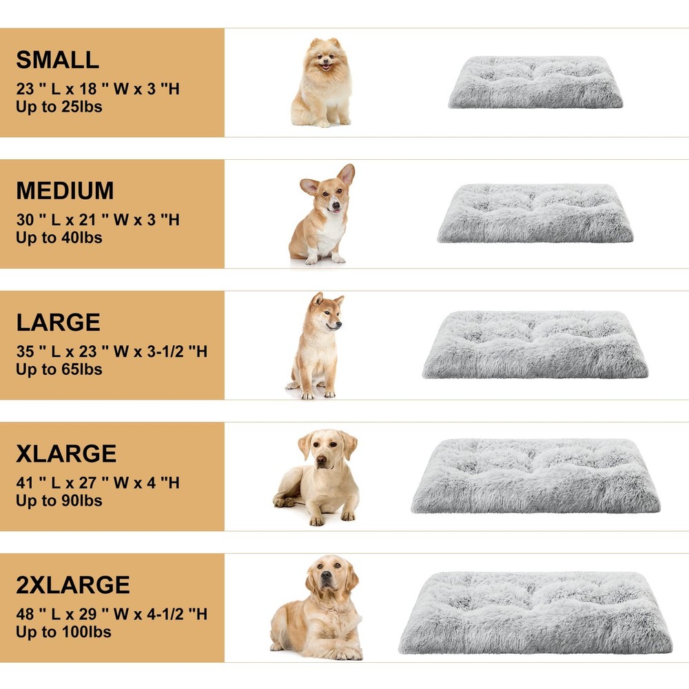 Ultra Soft Fluffy Plush Surface: adopt fluffy and smooth faux fur plush material, soft,cozy and not easy to shedding.The calming dog bed to ensure your dog surrounded by love & warmth, help them anti anxiety and sleep well. Durable Padding Support: the crate bed filled with thick premium inner through 6 keyhole fixation,soft and durable, designed to provide therapeutic support and stress relief to pets with joint pain, hip dysplasia and arthritis. Non-Slip Bottom: the dog crate bed equipped with waterproof anti-slip bottom,prevents your dog kennel pad from moving when your pet steps on or off, they will feel secure and happy. Multi Size: the large dog crate mat measures 35 " L x 23 " W x 4 "H, for dogs up to 60lbs. The pet bed arrives as a vacuum packed bed in a box, just shake and pat it or let it inflate for about 24 hours before use. Easy Care: the 6 keyhole fixation design helps hold up filler,so the dog bed can fully washabe and remain shape after times washes. Machine wash, gentle cycle, drying, low heat. Ideal dogs furniture pet bed for crate bed, dog pillow, kennel bed, cage bed, crate pad even as a dog travels bed in a car or truck.