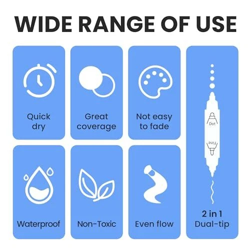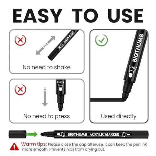 Permanent Markers Black Set: BIGTHUMB black markers are made with the highest-quality non-toxic, acid-free, no odor, no-leakage water-based acrylic ink that is waterproof, quick dry, long-lasting, and smooth ink flow. Each fat permanent marker conforms to ASTM d-4236 and EN-71 safety standards. The 6 Count Permanent Black Markers feature a Dual NIB design ( Extra-fine and Dot ). Different tips switching can be completed by changing the pen holding direction. The black marker tip is not only durable but also allows the marker paint pen to produce smooth and even ink, hardly skipping or breaking lines The black marker with a dual tip ensures extensive coverage, making these black markers ideal for scale projects and intricate designs. The high-quality black poster marker features a pump-action design for easy ink control, perfect for artists and crafters who demand excellence Multi-Surface Compatibility: These permanent poster markers are versatile enough to be used on a variety of surfaces, ideal for posters, signs, canvas, wood, paper, rock, and various surfaces. These black poster markers bring your artistic vision to life. The durable and reliable performance ensures that your creations maintain their brilliance over time The dual tip permanent marker black set is perfect for artists, art students, kids, teens, and adults to use on DIY designs, arts, and crafts, and painting projects. These black paint markers Great presents for Christmas, Birthday, Mother's Day, Easter Day, Valentine's Day, Halloween, Thanksgiving Day, Party, New Year, or a special holiday gift