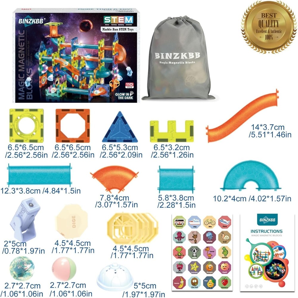 【Glow In The Dark】Deluxe set of 110 Piece pipe magnetic tiles, colourful shapes include pipelines , colorful balls, lighted balls, magnetic blocks, some funny stickers of number and Alphabet,to provide infinite creative combinations. ALL made of BPA-Free Non-Toxic ABS plastic conform to CPSIA, CE and EN71 standards. 【Fun Pipe Magnet Blocks】New upgrade design, magnetic tiles + marble pipes + colorful ball rolling up and down through the track quickly. Easy to assemble and take apart . kids can also build into some small 3D shape ,Explore endless possibilities. 【Great STEM Learning Toy】STEAM Science,Technology,Engineering,Art and Math,all in one!Your little one’s would acquire strong sense of color,geometrical shapes, creativity,color and shape recognition,spatial imagination ability,patience and problem-solving skills.Glow in the dark Magnetic Building Blocks 110pc set are fun and creative,perfect educational presents for school age children that will never go out of style. 【Family Game And Great Gift】Educational Magnetic Toy is an effective interactive way between parents and preschool kids. Entertaining for single or multiple parties and feel the sense of achievement together. Great gifts for any occasion. Best birthday gift ,Christmas, present toy for 3 4 5 6 7 8 9 10 11 12 years old boys girls. 【Customer First】We believe customer first.If you have any suggestions about your purchase or about the product by, please feel free to contact us through the order page and we will help you as soon as possible.