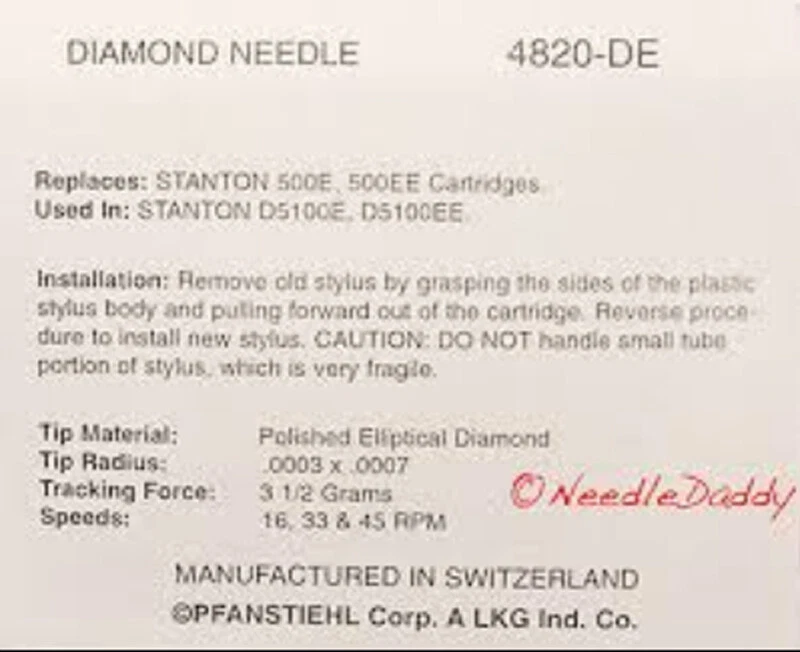 Brand new in box Pfanstiehl 4820-De precision elliptical diamond needle stylus for Stanton cartridges. Manufactured in Switzerland. REPLACES THE FOLLOWING NEEDLES: STANTON D5100EE, STANTON D50 SERIES, STANTON D1507 SERIES, STANTON D5100 SERIES, D5200 SERIES,STANTON D5107 SERIES, 820-DE, 4820-DE, 820-D7, 820-D7AL. ALSO REPLACES PICKERING PD07C AND ALL OTHER PICKERING V15, NP/AC NEEDLES. USED IN THE FOLLOWING CARTRIDGES: STANTON 500 BROADCAST SERIES: STANTON 500A, 820. STANTON 500A, STANTON 500 MKII, STANTON 500AL, STANTON 500EL, STANTON 500E, STANTON 500E, 500.v3, CRAZE. FITS ALL STANTON 500 BROADCAST SERIES AND PICKERING V15 CARTRIDGES. .7 MIL x .3 elliptical DIAMOND TIP PLAYS 33 AND 45 RPM. 3 GRAMS FORCE. 820 THIS SALE IS FOR 1EA. NEW IN BOX NEEDLE. Need help? Attach a picture of your old needle to an ebay message and i will find your new needle. Search my store for your needle, cartridge or other turntable accessories. Email me for help. Delivery confirmation in the United States is included in the shipping price. The confirmation number will be sent to the buyer when the item/items ship, usually within 24 hours. Check out my other items ! TERMS OF SALE: Using "Buy it now" or bidding on an auction item the buyer or bidder agrees to the following terms; The item descriptions or item titles may or MAY NOT be correct in regards to which needle fits a cartridge or fits a particular model turntable. If the original cartridge has been replaced by the owner with a different manufacturer’s cartridge this needle or cartridge won’t fit. Match your old needle to the picture of the needle within this item description. IF YOU DON'T HAVE AN OLD NEEDLE TO COMPARE TO THE PICTURE IN THE ITEM DESCRIPTION DO NOT MAKE A PURCHASE. Many needles were manufactured in a variety of colors so disregard color when making your comparisons. If you don’t have the old needle then lower the cartridge from the tonearm (leave the wiring attached) and take the number that is located on the top and simply match it to the numbers within the list of compatible cartridges above. Hit the contact seller button to email me for help if you need it. SHIPPING; items ship to the shipping address in the buyers paypal account. NO EXCEPTIONS. CHECK THE SHIPPING ADDRESS IN YOUR PAYPAL ACCOUNT FOR ACCURACY BEFORE MAKING A PURCHASE. All items ship USPS first class mail unless otherwise specified in the item descriptions. USPS first class mail is usually delivered within 3 to 5 days. Ebay's estimated shipping times are an EBAY estimate. USPS Delays occur and buyers are urged to be patient. Delivery confirmation is provided and will be emailed to the buyer when the postage label is generated. Items purchased Monday through Saturday before 8am EST ship same day. Items purchased after 8am EST ship the following morning. Items purchased after 8am Saturday and Sunday ship 9am Monday morning. RETURN SHIPPING Return shipping costs for any return regardless of the reason for the return is to be paid by the buyer. NO EXCEPTIONS. PRICING AND DISCOUNTS: There are no discounts for multiple purchases. Prices are firm. Email requests for discounts are deleted without a reply. If you have any questions at all please contact me so We can determine the correct needle or cartridge for your model.