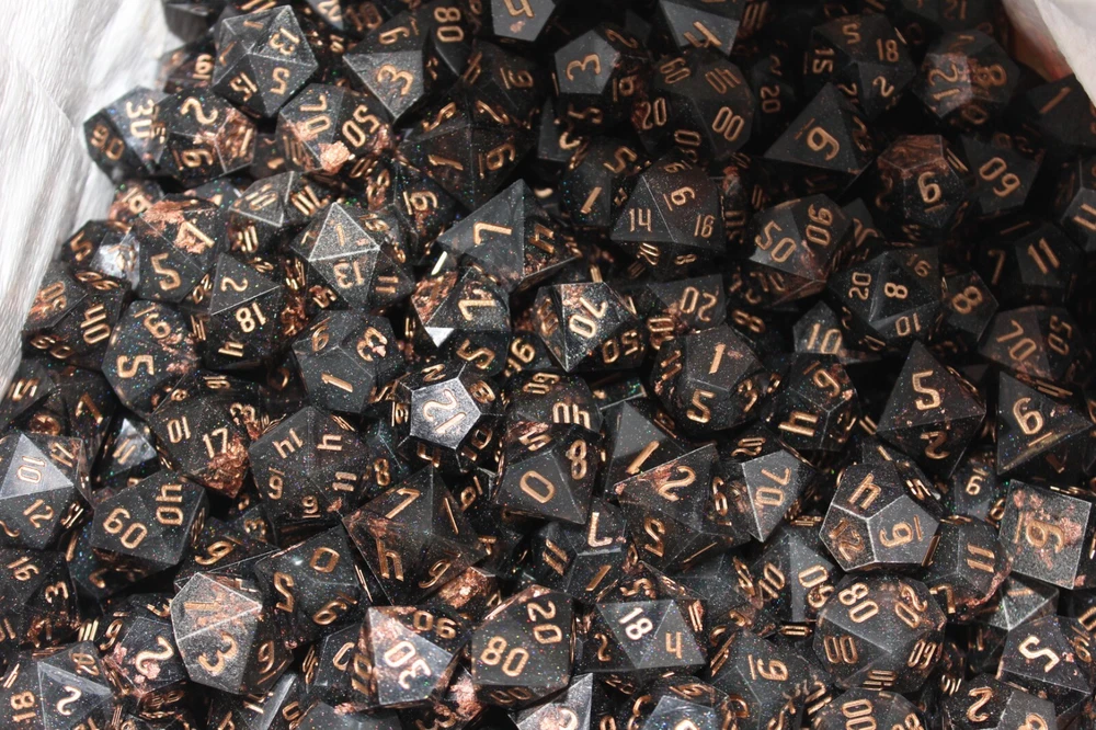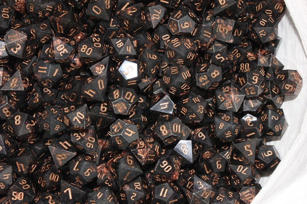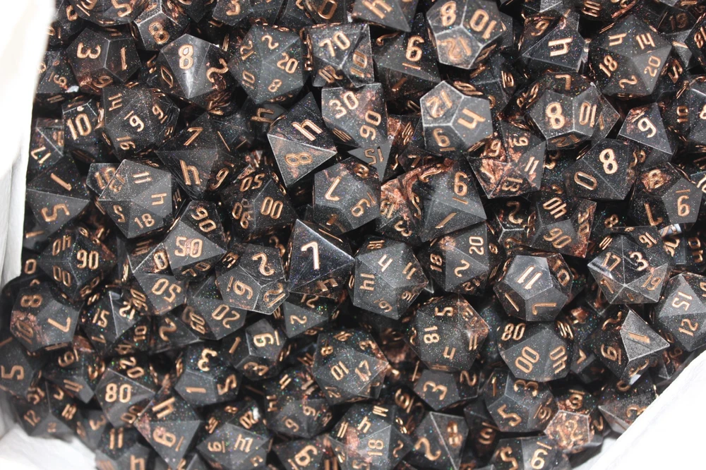 Check out my eBay store for more great items! BLACK & GOLD RPG DICE RANDOM LOT OF 10 DICE ARE BLACK WITH GOLD NUMBERS, GOLD COLOR FLAKES AND MICRO RAINBOW GLITTER. UNKNOW MANUFACTURER. I BELIEVE THERE ARE NO d4 OR d6 IN THE MIX BUT COULD STILL APPEAR. Check out my eBay store for more great items! SHIPPING US: ALL ITEMS SHIPPED WITH DELIVERY CONFIRMATION. I TRY MY BEST TO ONLY CHARGE ACTUAL SHIPPING COSTS. NO HANDLING FEES. YOUR ITEM USUALLY SHIPS OUT WITHIN 24 HOURS OF PAYMENT. SHIPPING INTERNATIONAL: BUYER IS RESPONSIBLE FOR ANY POSSIBLE FEES, TAXES OR DUTIES ASSOCIATED WITH IMPORT OF THE ITEM. I WILL NOT MARK THE ITEM AS A GIFT OR LOWER THE VALUE OF THE ITEM SO PLEASE DO NOT ASK. IT IS BUYERS RESPONSIBILITY TO MAKE SURE THE ITEM BEING PURCHASED IS ABLE TO BE IMPORTED. RETURN POLICY: I WILL GLADLY ACCEPT A RETURN OF ANY ITEM I SELL. BUYER IS TO CONTACT ME WITHIN 14 DAYS TO ARRANGE RETURN. ITEM MUST BE SENT BACK IN THE SAME CONDITION AS IT WAS SENT TO YOU INCLUDING ALL PARTS. OTHER: FEEDBACK IS LEFT AUTOMATICALLY AFTER IT HAS BEEN LEFT FOR ME. PAYMENT IS TO BE MADE WITHIN 4 DAYS OR THE ORDER WILL BE CANCELLED AND RELISTED. A PACKING LIST OR INVOICE WILL NOT BE AUTOMATICALLY ADDED TO YOUR SHIPMENT TO SAVE ON PAPER WASTE. IF ONE IS REQUIRED PLEASE LEAVE A NOTE WITH PAYMENT REQUESTING ONE. Check out my eBay store for more great items!