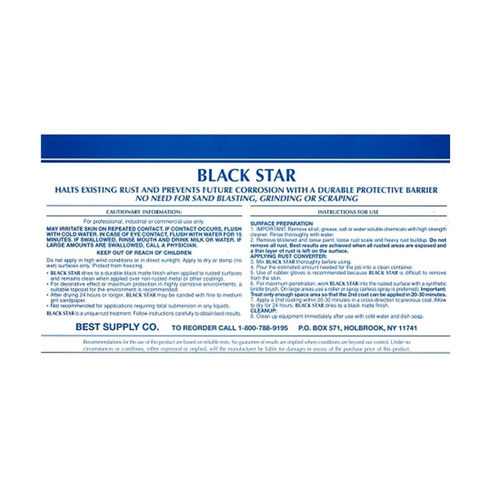 BLACK STAR Rust Converter - Converts Rust on Any Steel Surface - 1 Gallon Description Stop rust in its tracks with Black Star Rust Converter. This advanced formula transforms rust into a slick polymer resin coating that looks incredible on its own or can be easily painted. Best of all, this polymer resin coating is rust-proof, which means you can save your metal equipment while keeping it from further rusting. Whether you have rust on your vehicle, building, roof, fence, tank, trailer, or rust on your equipment, Black Star Rust Converter transforms any iron or steel surface by stopping rust in its tracks. A must- have for farmers, ranchers, automotive shop owners, car enthusiasts, city highway departments, fleet workers, steel workers, workshops, and commercial painters, Black Star Rust Converter is a must have for anyone working with metal and dealing with rust. And it's so easy to use! Just spray, brush or roll Black Star on and allow the product to do its work. Rust is easily converted into a black, hard, corrosion and abrasion resistant polymer resin coating. No more sanding, scraping, or blasting trying to remove rust—those days are over with Black Star Rust Converter. Features: Black Star Rust Converter No more sanding, blasting, scraping, or etching. Instead, our 21st century technology converts and transforms rust into a slick polymer resin coating. A phenomenal rust treatment, Black Star rust converter stops more rust from forming. Wont Re-Rust After converting your rust into a beautiful, black, hard, corrosion-resistant polymer resin that seals out moisture, the treated rust will never reoxidize. Instead of being just a harsh rust remover, Black Star is also a rust inhibitor and chemically reacts with the rust to convert it into a useful primer or final coating. Unlimited uses If it rusts, Black Star goes to work! Used everywhere from oil rigs to farm equipment. From fences, metal roofs, bridges, marine applications and steel sheds to grain bins, cars, trucks, trailers, and tools, rust is simply no match. Paint primer Rust is difficult to paint over, and paint wont stop your metal from re-rusting. Black Star not only acts as a rust converter and stopper, but also is a phenomenal primer for painting your metal and achieving a vivid, smooth color. Easy to Use No more difficult rust removing! Instead of damaging the metal trying to remove rust, just spray, brush, or roll on Black Star Rust Converter and improve the integrity of your metal without worrying about stripping, wire wheeling, grinding or sand blasting. Product Details: Brand: BLACK STAR Color: White Finish Type: Semi-Gloss Size: 1 Gallon Item Volume: 1 Gallons Special Feature: Rust Resistant Unit Count: 128.0 Fluid Ounces Item Form: Liquid UPC Manufacturer: MRO Chem Brand: BLACK STAR Color: White Finish Type: Semi-Gloss Size: 1 Gallon Item Volume: 1 Gallons Special Feature: Rust Resistant Unit Count: 128.0 Fluid Ounces Item Form: Liquid UPC: 193802256024 Manufacturer: MRO Chem Part Number: BlackStarRustConverter/1gallon Item Weight: 8 pounds Product Dimensions: 5.5 x 5.5 x 11.5 inches Item model number: 5823898652 Is Discontinued By Manufacturer: No Finish: Semi-Gloss Item Package Quantity: 1 Special Features: Rust Resistant Batteries Included?: No Batteries Required?: No Date First Available: July 21, 2015 Delivery We Do Not Ship Outside of the Continental US. Return Policy All items qualify for returns within 30 days of receipt. Seller is responsible for return shipping on any item that is not damaged. Feedback We take our reputation seriously, we buy and sell online, so we understand the value of trust. If you are unsatisfied with your order, please contact us and we will work with you to resolve it to your satisfaction.