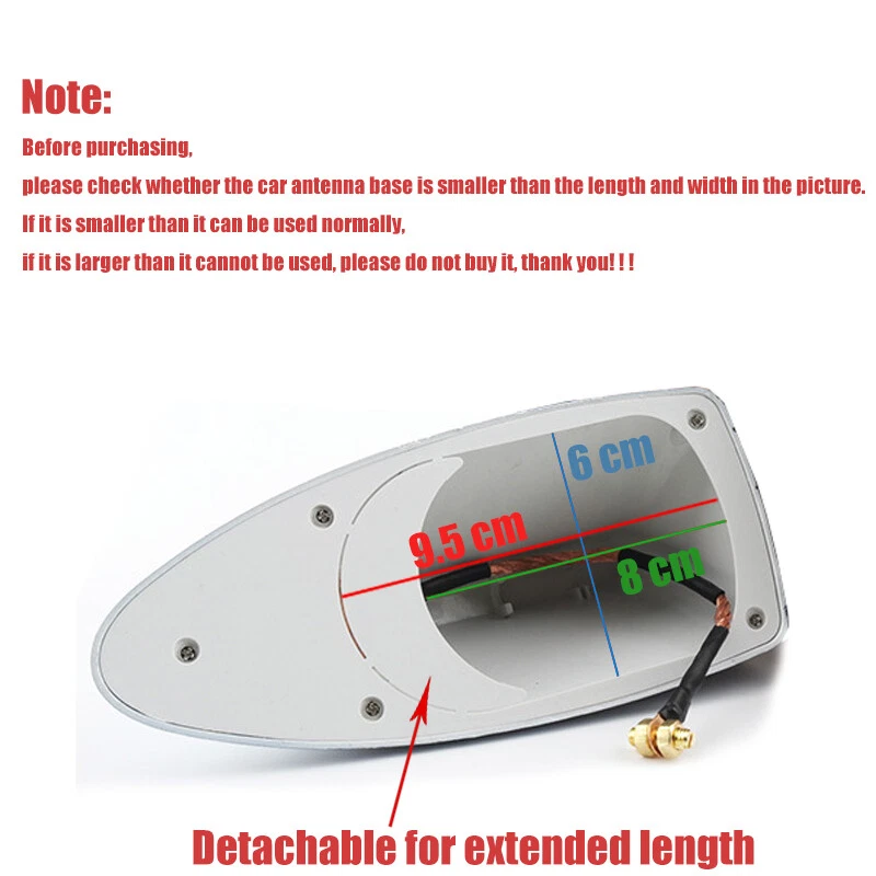Hello dear customer. thank you for your purchase. If you encounter product problems or operational problems and other problems, you can contact our customer service immediately, and we will solve the problem for you within 24 hours. Please be sure to contact our customer service. I wish you a happy life! ! ! Note : Before purchasing, please check whether the car antenna base is smaller than the length and width in the picture. If it is smaller than it can be used normally,if it is larger than it cannot be used, please do not buy it, thank you! ! ! Features: 100% brand new and good quality A good replacement for your old/broke car roof antenna It can enhance the signal and achieve the purpose of decoration, let your car more brilliant Easy installation, No Drilling Required With FM/AM connection cable inside Concision and modern design, make your car cool and distinctive Durable, classic, handy and beautiful Style: Shark fin (Streamlined design makes the car more beautiful) Specification: Fitment: Universal fit for cars Material: High quality ABS Materia Color: Black Fitment: Universal Fit for Cars NOTE: If the size of your original antenna's base is bigger than the below dimension, this shark antenna will not fit your car. Package includes: 1x Shark fin antenna