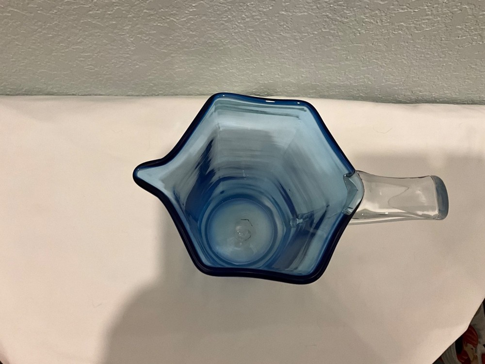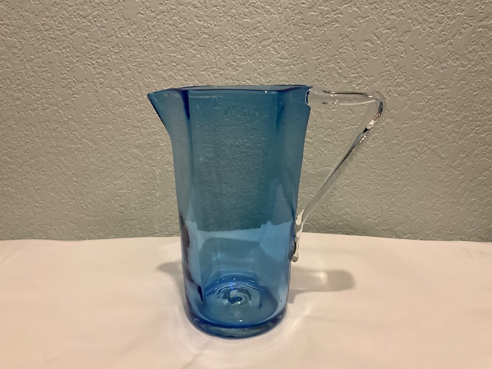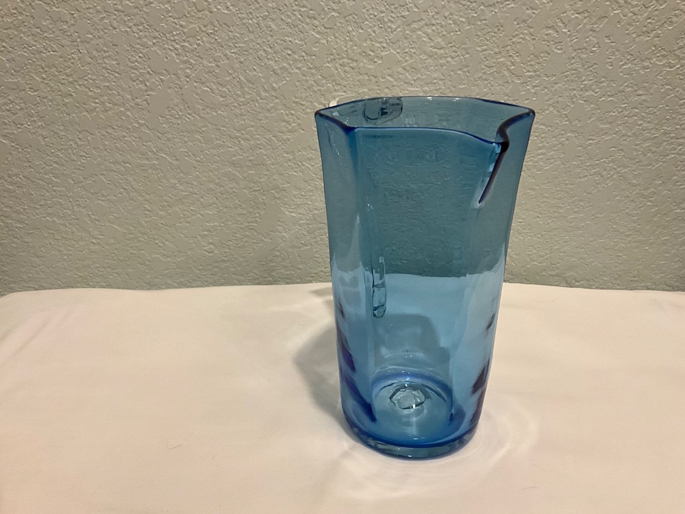 The BLENKO blue optic glass pitcher, measuring 8 inches in height and 7.5 inches in width, is a beautifully crafted piece of art glass. Hand-blown in the United States, this pitcher showcases the unique production style and technique of Blenko. Its vibrant blue color adds a touch of elegance to any table setting or room decor, making it a standout piece in any collection of decorative cookware or glassware. Perfect condition, no chips or cracks. The blue color is so vivid, it really catches your eye. Gorgeous pitcher!