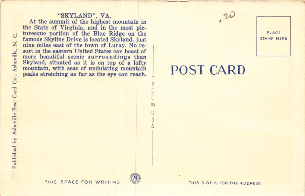 MAKE AN OFFER. THE MORE YOU BUY THE BETTER DEAL I WILL ACCEPT The postcard features a view of the Blue Ridge Mountains of Virginia at night, with a portion of Skyland visible to the right. Skyland is located at the summit of the highest mountain in Virginia, along the famous Skyline Drive, approximately nine miles east of Luray.