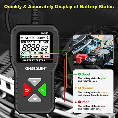 Return Policy Fast Delivery Trusted seller BM550 6V 12V 24V Car Battery Tester, 100-2000 CCA Voltage Tester 2Ah-220Ah Internal Resistance Tester Accurate Digital Auto Battery Analyzer for Cars Trucks SUV ATV Boats Motorcycles Vehicle Product Description 【6V 12V 24V Battery Tester】 BM550 battery tester can test all 6V 12V 24V 100-2000 CCA car batteries, support 2Ah-220Ah(need to enter the corresponding CCA value on the battery), including regular flooded(Regular battery), AGM flat plate(AGM tablet battery), AGM spiral(AGM winding battery), GEL and EFB batteries, battery analyzer for cars trucks etc.( Not suitable for deep cycle batteries ) 【Practical Car Battery Analyzer】BM550 car battery analyzer can quickly and accurately display multiple data of the car battery. It can test the SOH (state of health) and SOC (state of charge) of the battery, easily test 100-2000 CCA, internal resistance test and voltage test. With our battery tester, you can easily grasp the current state of your car battery and avoid accidents. 【Simple Operation & Accurate Data】The results of the battery test are based on the CCA standard, which can be quickly and accurately displayed on the 1.8-inch HD screen, allowing you to quickly know the status of the battery.You can test the batteries both in-vehicle and out-of-vehicle, which is very convenient. 【Safe design & Safe Use】The battery tester adopts Reverse Connection Protection. If you accidentally reverse the two wires, don't worry, the battery tester will not work at this time to prevent the internal circuit from burning, which can well protect the equipment and the long-term use of the car battery.(If the clip is not properly clamped,the screen will flicker) 【Plug and Play】It is simple to use, just connect the clip of the battery tester to the car battery correctly and it can start working, whether the battery is in vehicle or out of vehicle, or a dead battery can be tested.Simple and effective tool designed for DIY enthusiasts, car factories, garages, car battery manufacturers and more.Start your test now! Shipping Returns Payment Shipping Shipping is FREE to all addresses other than APO/PO boxes in the lower 48 states. All our stock ships from US-based warehouses. Shipped via USPS or UPS (depending on location and package weight) Unless stated otherwise, all orders will ship within 24-72 hours of your payment being processed. Check our feedback to see the great reviews of FAST shipping we offer. Returns Seller does not accept returns Payment We currently accept payment via eBay managed payments only. Once payment is cleared, we will dispatch your shipment within 1-3 business days. Please refer to the "Shipping" tab for more information regarding shipping speed to your destination.