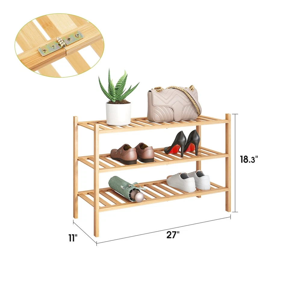 BMOSU stylish decorative shoe rack, convenient and Solid and practical, is a good helper for organizing the room and saving space. The shelf provides enough space for the shoes, which can be used indoors and outdoors. Please avoid strong sun exposure and prevent rain. Brand: BMOSU MATERIAL: BAMBOO COLOR: NATURAL COLOR Stackable design:When you want to get a high-rise shoe rack,You can use the round bar in the accessory to stack two shoe racks. Simple convenient Multiple Sizes: 3 lengths to fit your space needs, Small is 17 in long (2 pairs of shoes per tier), Medium is 27 in long (2-3 pairs of shoes per tier), Large is 33.3 in long (3-4 pairs of shoes per tier) Space saving:This shelf can You can use it in any space, so that you can maximize the use of space saving and keep the family clean and tidy, solid and practical Easy To Install:The shoe rack is equipped with instructions and required tools, and the shelf and the bracket are installed with anti-rust screws. You can install it in only 10 minutes Anti-slip mat:Anti-slip mat makes the product not easy to slide while avoiding scratches on your countertop or floor