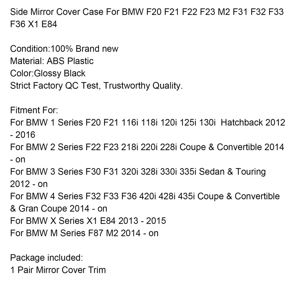 SAFE & SECURE SHOPPING 100% SATISFACTION GUARANTEED FAST SHIPPING Store Categories Store Categories Other eBay Motors Honda Toyota Ford Chevrolet Audi Mercedes-Benz Dodge Jeep You may also like Side Mirror Cover Case For BMW F20 F21 F22 F23 M2 F31 F32 F33 F36 X1 E84 Product Description Side Mirror Cover Case For BMW F20 F21 F22 F23 M2 F31 F32 F33 F36 X1 E84 Condition:100% Brand new Material: ABS Plastic Color:Glossy Black Strict Factory QC Test, Trustworthy Quality. Fitment For: For BMW 1 Series F20 F21 116i 118i 120i 125i 130i Hatchback 2012 - 2016 For BMW 2 Series F22 F23 218i 220i 228i Coupe & Convertible 2014 - on For BMW 3 Series F30 F31 320i 328i 330i 335i Sedan & Touring 2012 - on For BMW 4 Series F32 F33 F36 420i 428i 435i Coupe & Convertible & Gran Coupe 2014 - on For BMW X Series X1 E84 2013 - 2015 For BMW M Series F87 M2 2014 - on Package included: 1 Pair Mirror Cover Trim About Us Shipping Terms Returns Contact Us About Us VIPIH is one of the international leading distributors specialized in distribution of auto spare parts of the world’s prime auto part suppliers on a global scale with the full responsibility in procurement, shipping, sales and marketing and after sales service. VIPIH fulfills all needs of its clients completely and on a timely basis with the know-how it has built up since it was established and the comprehension knowledge of the sectors standards. The perfectionist approach in product quality, high service availability, strict principle of business follow-up, reliability and the good reputation which has gained strength as a result of customer satisfaction are the most striking components of VIPIH ’ s success. VIPIH is presently capable of supplying all demands for auto parts from the gear box to turbo hoses in a wide range. Free delivery with worldwide shipping options available. If can not locate what you need then please get in touch! Shipping United States Buyers Parcel will via USPS or UPS from us United States warehouse Shipping Time Usually ,Parcel will be delivered 2-7 working day include Handling time. Sometimes shiping time may has a little delay, such as Bad wether,Holidays Terms We stand behind everything that we sell and will do everything possible to assure you are satisfied. When you receive your purchase if you are not 100% satisfied, please sent me ebay message and we will do our best to make you happy. If you still want to return your purchase, simply ship the item(s) back to us and we will refund your original purchase price and the original shipping charge. Buyers are responsible for the postal cost of returning the items. We must be notified of the intent to return your item within 30 days of receiving the item. Items returned must be in the same condition that they were received. How to return 1,Please ask us for return address . 2,Shipping back the package . The RMA#(Return Merchant Authorization Number = Your ebay ID) must be clearly written on the return package ,Otherwise the package will be refused. 3,Sent us the return tracking number. 4,All returns will be inspected prior to a credit being issued. Returns 1:Returns are accepted within 60 days of purchase. 2:All returned items MUST BE in the original packaging. 3:We will be happy to assist you if if any item needs to be returned or replaced 4:Please don't open a return request before contacting us first to solve, many thanks. Contact Us If you have any questions, our Customer Service staffs welcome you to sent me ebay message. We strive to answer all questions and resolve any problems as quickly as possible. Business Hours: Monday-Saturday 9:00-17:00 Copyright © 2022 Tongtool