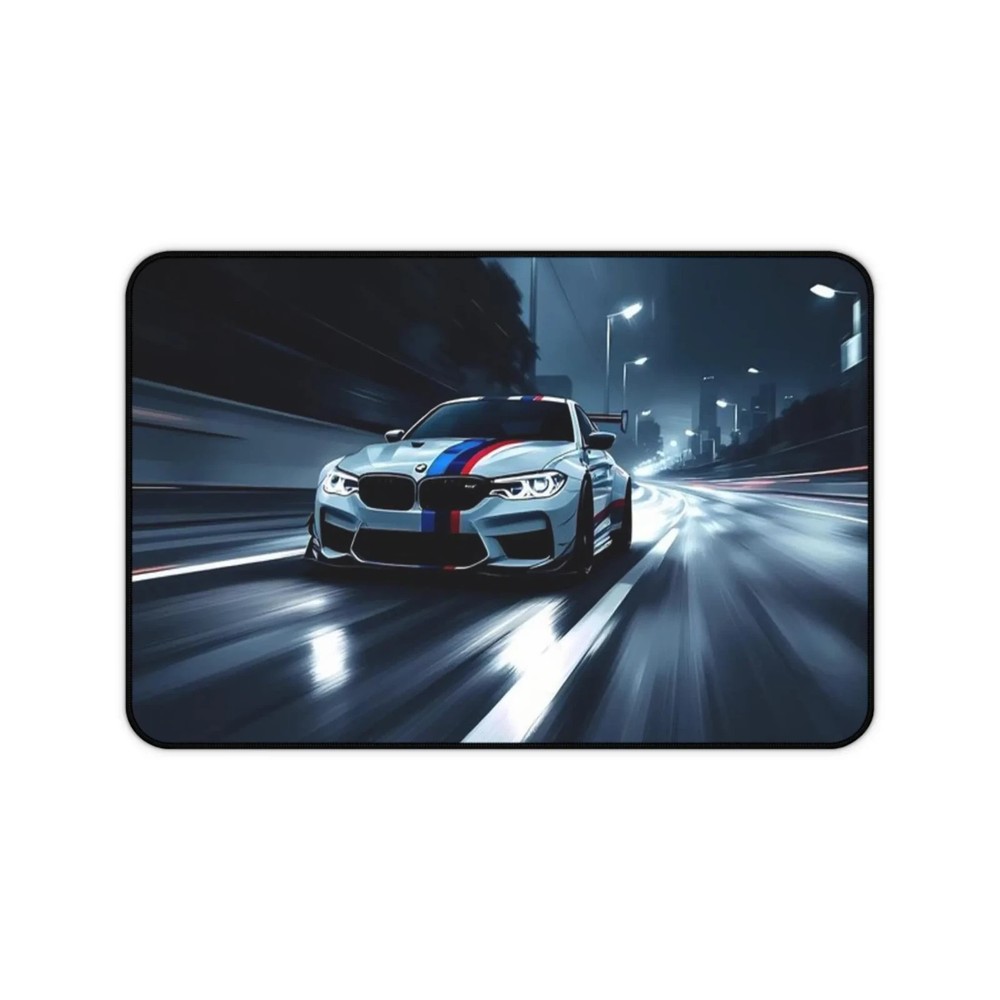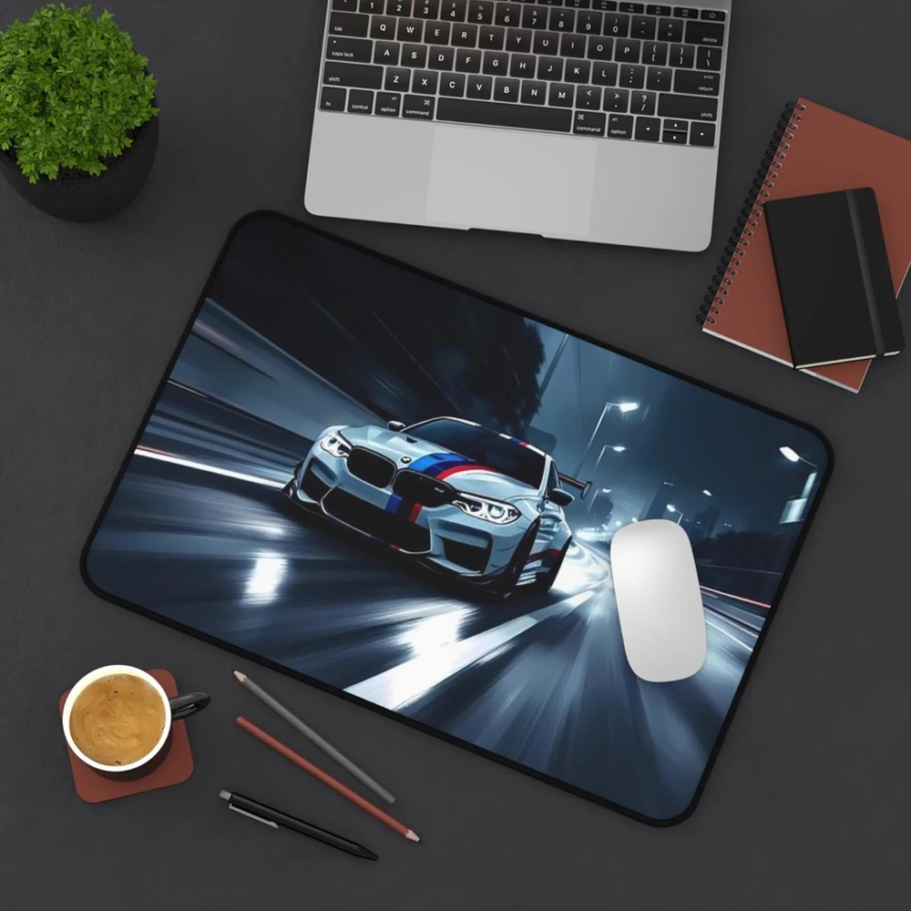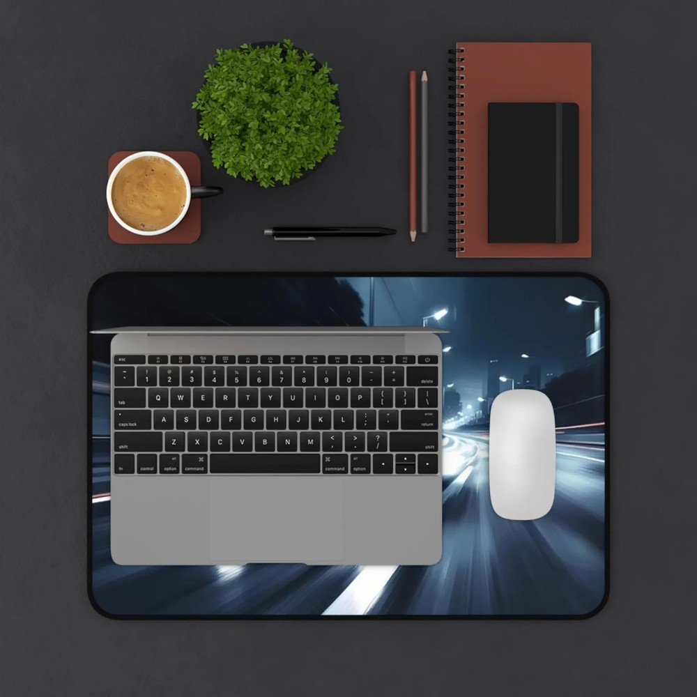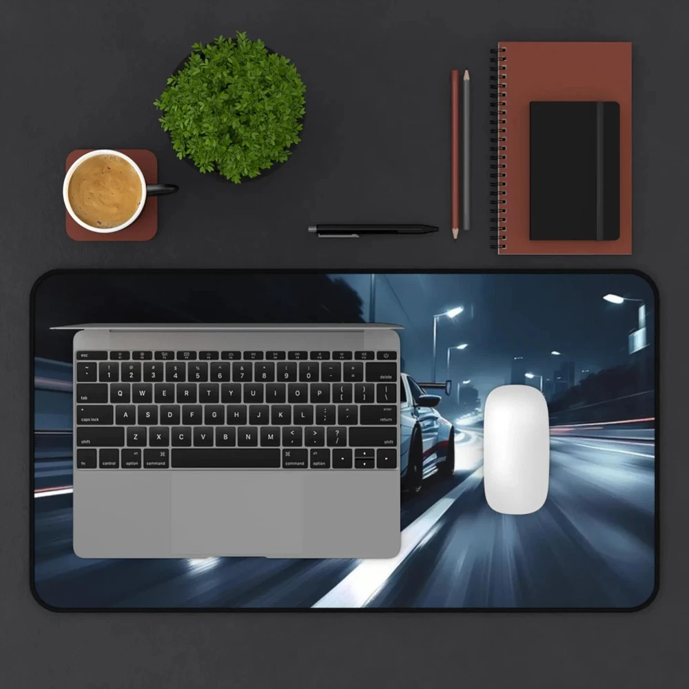 Slide into focus with a desk mat that brings the rush of night driving to your workspace. The high-contrast racing scene—sleek car, wet asphalt, neon-lit streets—adds motion and energy without shouting. Soft neoprene underfoot gives a cushioned, supportive surface for typing, sketching, or spreading out tools. Hemmed edges hold up to daily use and the textured anti-slip backing keeps everything steady during intense work sessions or late-night gaming runs. Available in three sizes to fit a compact laptop setup or a full racing-station layout. Product features - Non-slip/anti-slip neoprene backing for stable placement - Vibrant, high-definition print with crisp colors - Durable hemmed edges to prevent fraying - Comfortable, supportive 100% neoprene surface - Available in three sizes for different desk setups Care instructions - Use warm water and dish soap to clean spots off your pad. It's not necessary to soak the whole pad. For hard-to-clean spots use a soft-bristled brush.