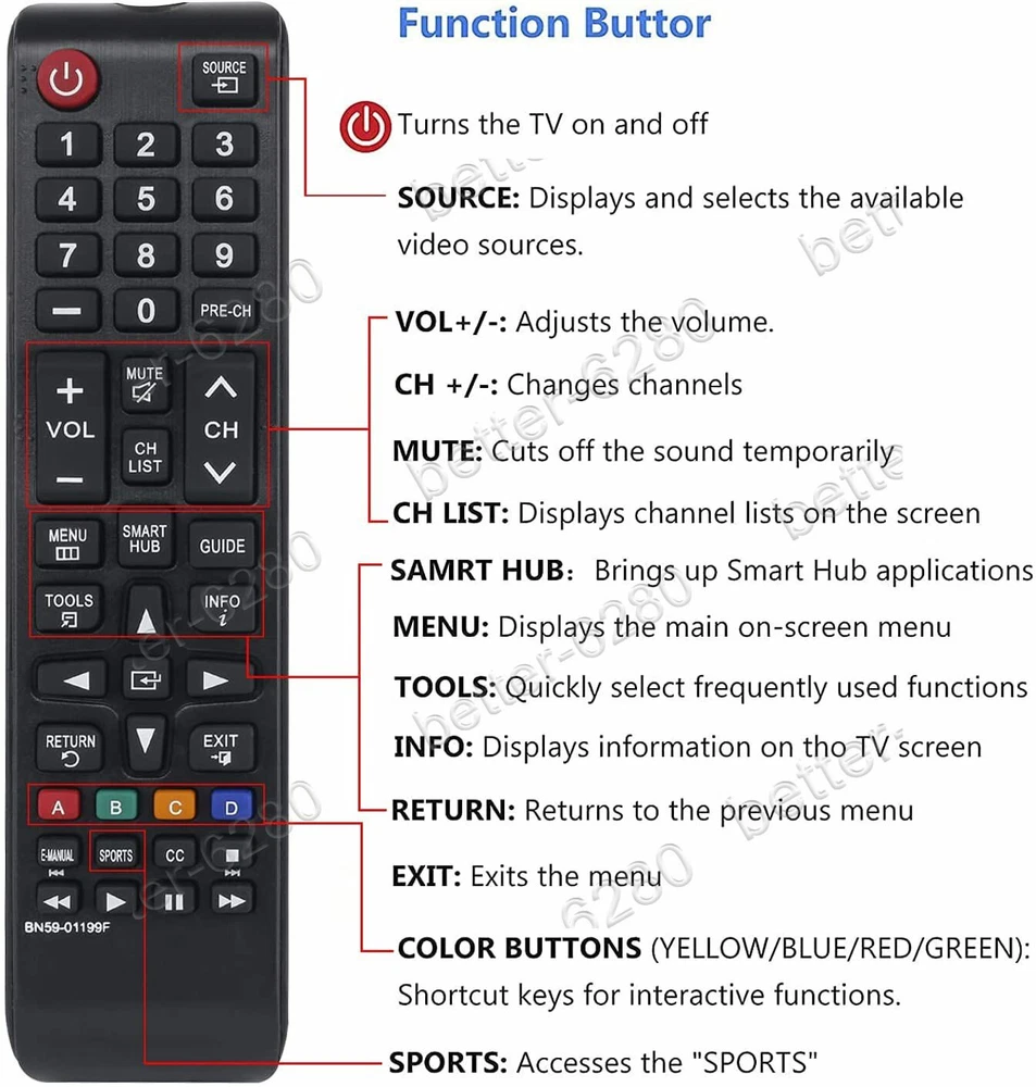 SHIP ALL ITEMS WITHIN 24 HOURS USPS FIRST CLASS WITH TRACKING NUMBER SERVICE Welcome Retail, Wholesale & Drop-Shipping! Description: 100% Brand New & High Quality & Fast Ship No programming required, just put batteries in and work Compatible with all SAMSUNG TVs Replace the lost or broken 2 AAA Batteries are included This is a Replacement Remote Not ORIGINAL Samsung Control Compatible Model: Samsung's BN59-01199F BN59-01301A UN40MU6300FXZA UN40MU7000FXZA UN43MU6300FXZA UN43MU630D UN49MU6500FXZA UN49MU7000FXZA UN49MU7500FXZA UN49MU8000FXZA UN50MU6300FXZA UN50MU630D UN55MU6300FXZA UN55MU630D UN55MU6500FXZA UN55MU650D UN55MU7000FXZA UN55MU700D UN55MU7500FXZA UN55MU8000FXZA UN55MU800D UN55MU9000FXZA UN65MU6300FXZA UN65MU630D UN65MU6500FXZA UN65MU650D UN65MU7000FXZA UN65MU700D UN65MU7500FXZA UN65MU8000FXZA UN65MU800D UN65MU850D UN65MU9000FXZA UN75MU6300FXZA UN75MU630D UN75MU8000FXZA UN75MU9000FXZA UN40MU6300F UN40MU7000F UN43MU6300F UN49MU6500F UN49MU7000F UN49MU7500F UN49MU7600F UN49MU8000F UN50MU6300F UN55MU6300F UN55MU6500F UN55MU7000F UN55MU7500F UN55MU7600F UN55MU8000F UN55MU8500F UN55MU850DF UN55MU9000F UN65MU6300F UN65MU6500F UN65MU7000F UN65MU7500F UN65MU7600F UN65MU8000F UN65MU8500F UN65MU850DF UN65MU9000F UN75MU8000FQN55Q7CAMF QN55Q7CAMFXZA QN55Q7FAMF QN55Q7FAMFXZA QN55Q8CAMF QN55Q8CAMFXZA QN65Q7CAMF QN65Q7CAMFXZA QN65Q7FAMF QN65Q7FAMFXZA QN65Q8CAMF QN65Q8CAMFXZA QN65Q9FAMF QN65Q9FAMFXZA QN75Q7FAMF QN75Q7FAMFXZA QN75Q8CAMF QN75Q8CAMFXZA QN75Q9FAMF QN75Q9FAMFXZA Package included: 1 x New Remote Replacement 2 x AAA Batteries Delivery Payment Return & Exchange Contact us About us Delivery We will ship out the item in 1-2 working day From Monday to Saturday. We offer USPS First Class with Free Tracking no. service to ensure your package arrive fast and safely. Usually the delivery takes 2-5 business days. If you don't receive the items after 10 days, please feel free to Contact us Please Make sure your shipping address is correct and includes your Apt#, Box# or Unit# if any. We are off on weekend, all orders from weekend will ship in next Monday. Payment We accept payment via PayPal. You can pay with any major credit card, your paypal balance or linked bank account. Return & Exchange We offer 30 days refund or exchange policy on defective or wrong items since you receive the item. For any return, please feel free to Contact us first, we will offer return shipping label for the defective or wrong items. Contact us Any inquires or issues incurred, please feel free to Contact us via eBay message, we are always here ready for help. DO NOT open return request or leave negative feedback without asking for help. Highly appreciated your POSITIVE feedback & 5 stars DSR. About us We always try to offer the best quality items, the fasttracking delivery and best service to our Customers. If you have any inquire or problem before buy or after buy, please feel free to Contact us via eBay Messages, thanks.