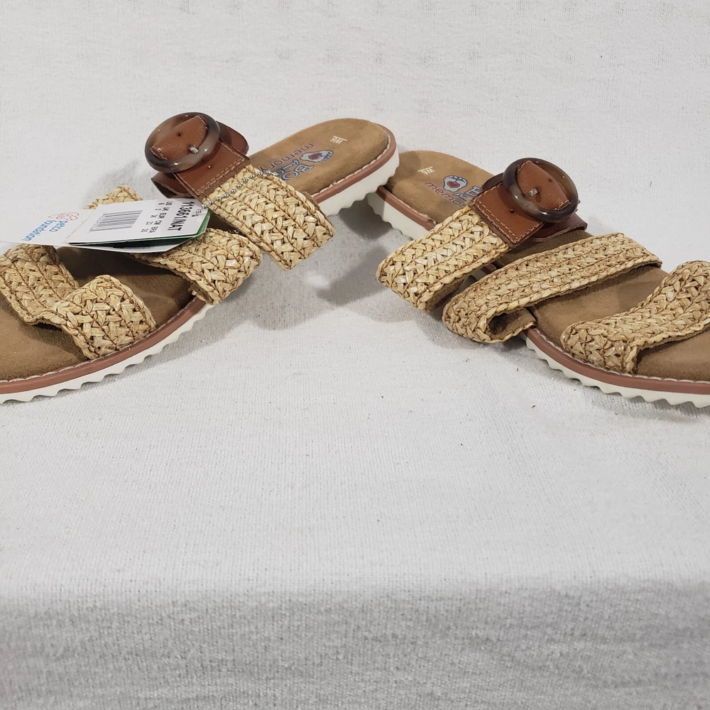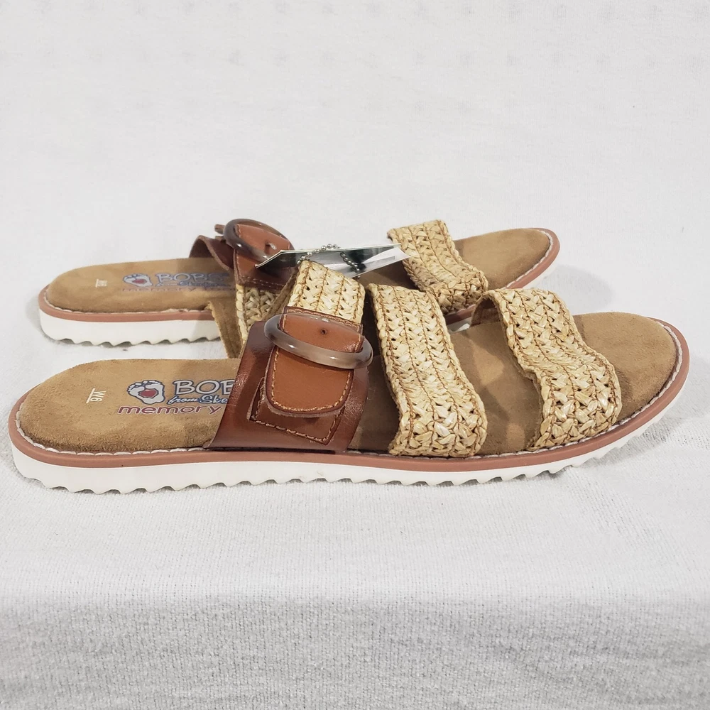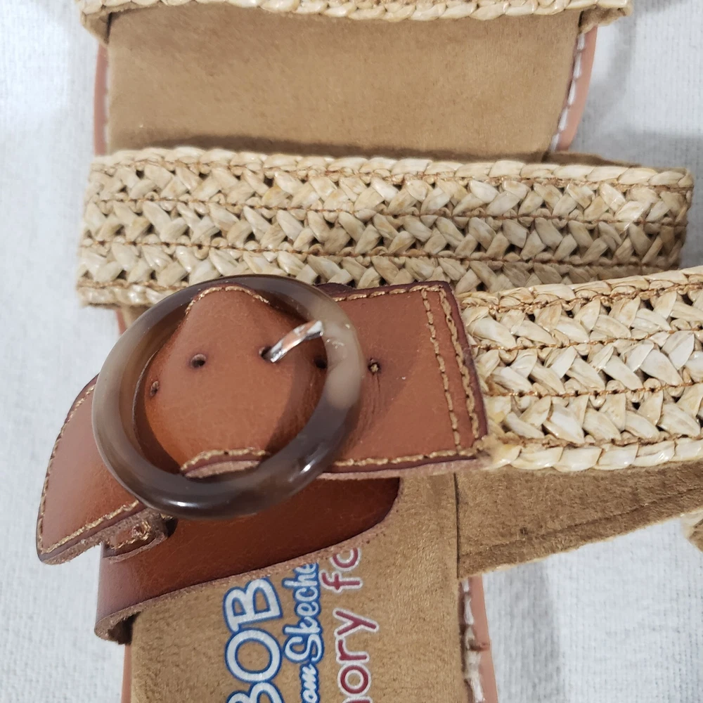 Bobs from Skechers womens slip on flat sandals Size 6 Tan, white Man made materials Rattan straw straps Buckles Open round toe Memory foam comfort Casual, travel, vacation, summer, beach, poolside, cruise New without box, with tags **Offers are welcome **Ship within 1-2 days **Smoke free environment