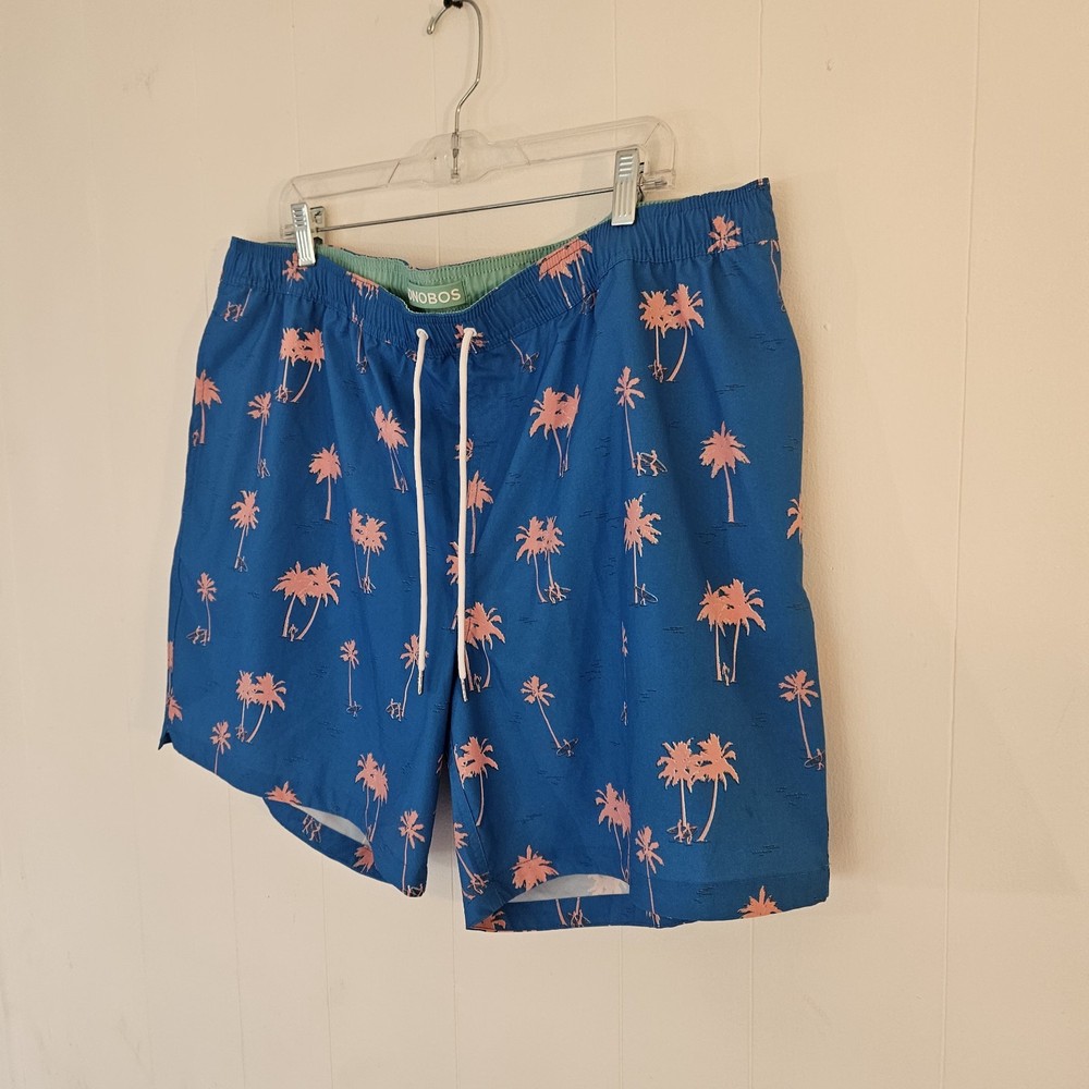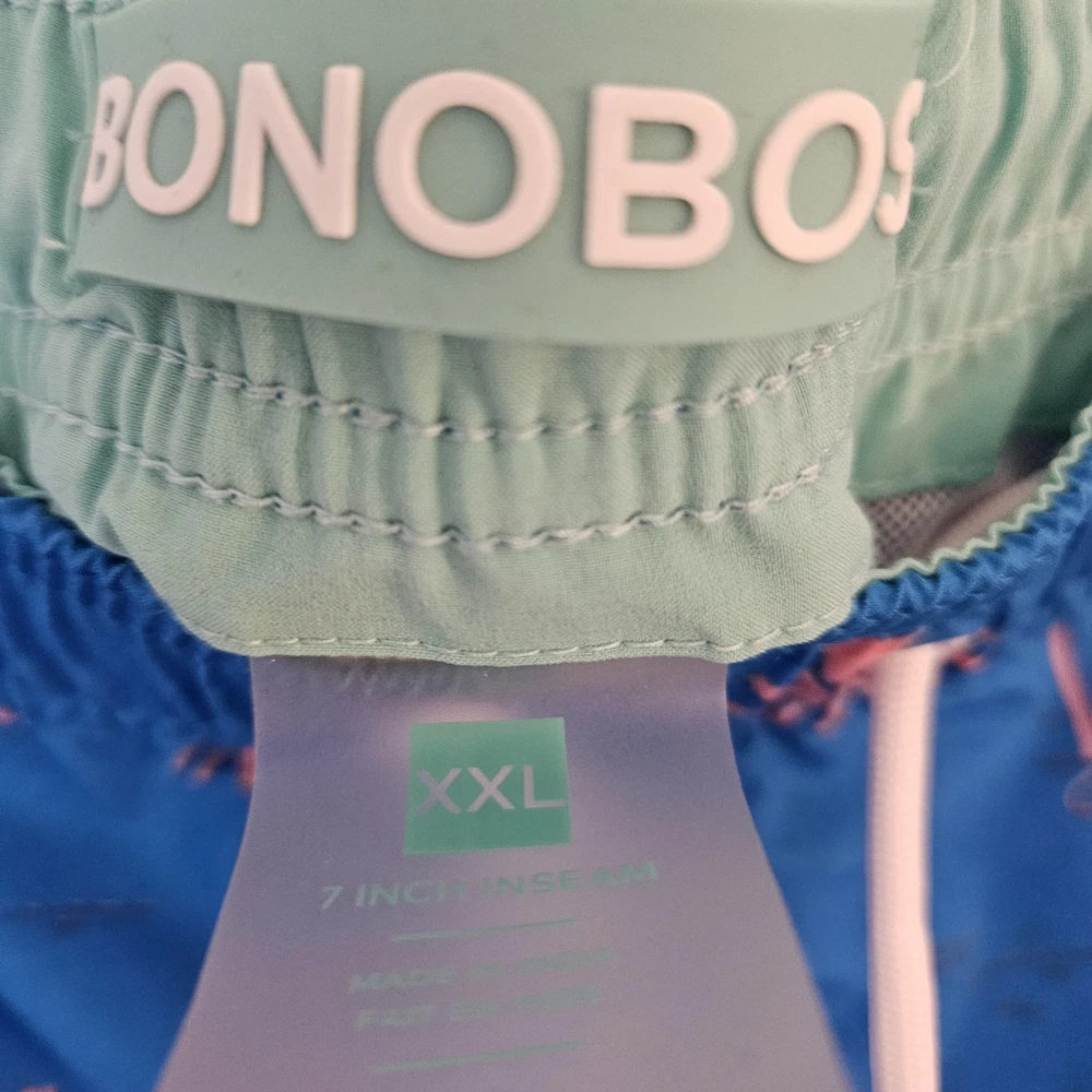 BONOBOS Swim Trunks – Men’s XXL – Blue with Pink Palm Trees Make a statement at the beach or pool with these stylish BONOBOS men’s swim trunks in size XXL. Featuring a vibrant blue background with bold pink palm tree graphics, these shorts deliver a fun tropical look perfect for warm-weather days. Designed for both comfort and performance, they include a soft interior mesh lining and an elastic waistband for a secure, flexible fit. These swim trunks are equipped with convenient pockets, making them practical for everyday wear as well as swimwear. Lightweight and quick-drying, they’re ideal for swimming, vacations, or casual summer outings. Features: Brand: BONOBOS Size: Men’s XXL Color: Blue with pink palm tree print Built-in mesh lining Comfortable elastic waistband Functional side pockets Lightweight, quick-dry material Great for beach, pool, or resort wear Add a pop of tropical style to your summer wardrobe with these eye-catching BONOBOS swim shorts!