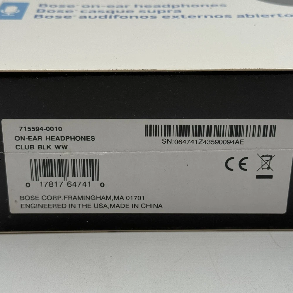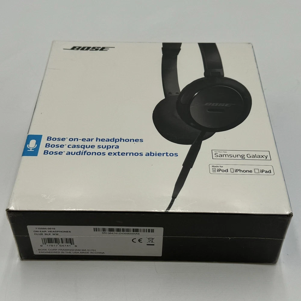 Country/Region of Manufacture: United States UPC: 017817647410 Type: Ear-Pad (On the Ear) MPN: 715594-0010 Color: Black Number of Earpieces: Double gtin13: 017817647410 Connectivity: 3.5mm Model: Bose on-ear headphones Microphone Type: On-Cable Form Factor: Headband Suitable For: DJ, Live Monitoring, Studio Monitoring, Casual, Travel Brand: Bose Personalize: No Features: Adjustable Headband, Detachable Cable, Inline control/mic, Factory Sealed, Made for Apple iPod, iPhone, iPad, Made for Samsung Galaxy, TriPort Technology, Soft ear cushions, Durable construction