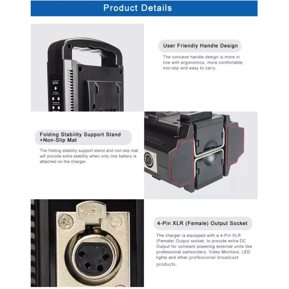 Product Description BP-2CH Dual Channel V-Mount/V Lock Li-Ion Battery Quick Charger W/ Power Supply Features: The BP-2CH charger is capable of charging 14.4V/14.8V V-mount lithium-ion batteries. There is no need to switch operation modes when the input voltage ranges from 100-240V. It offers quick charging for a single lithium-ion battery and sequential nominal charging for two lithium-ion batteries. Equipped with a DC output, the BP-2CH can be utilized as a DC power supply for cameras, portable Video Tape Recorders (VTR), and other Electronic News Gathering (ENG) equipment. In the absence of AC power, a fully charged lithium-ion battery can serve as a backup power source, providing continuous DC output through the XLP 4P connector. Controlled by a Micro Controller Unit (MCU), the BP-2CH charger employs a reliable and efficient charging method of constant current/constant voltage. Specifications: Model: BP-2CH Color: Black Input: 100-240V~50/60Hz 2A Max DC output: 16.5V--4.5A Battery charger: 16.8V--3A*1 (charging 1pcs battery), 16.8V--2A*2(charging 2pcs batteries) Operating ambient temperature: 0℃~40℃ Operating ambient humidity: 20%~90%RH Dimension: 225*141*100mm Package Included: 1pcs BP-2CH charger 1pcs AC power cable If you have any questions, please feel free to contact us via ebay. We usually respond within 24 hours. Payment Shipping Returns Contact Us We accept all verified payments from ebay. Orders will be shipped after receiving cleared payment. Payment due within 7 days after auction ends and for buy it now listings. We ship most of our orders within 24 hours, and may up to 48 hours for. If you want faster shipping way. Please contact us before making payment. Sometimes due to problems with our transportation company system, your shipping information may be delayed to update. We recommend that you try again after 3-4 days. If you still haven't checked the shipping information, you can contact us by ebay message. Always believe we can figure things out with communication, if it comes to return, the pacakge must be intact and the same as you receive. If you have any questions, please feel free to email our service specialists 24 Hours a Day, 7 Days a Week. We will reply you ASAP. Return/refund is accepted within 30 days after the buyer receives the item. NO exchange will be accepted after 30 days from the date when the item is received. Please contact us first before returning your product!!! If you have any questions, our Customer Service staffs welcome you to email us. We strive to answer all questions and resolve any problems as quickly as possible. You can contact us 7*24, we will reply at the first time, and we will surely solve your problems. Note: 1.We try our best to reply to your emails as soon as possible, however, due to high volume of daily incoming emails and time zone difference, we may not be able to reply your emails immediately. Please allow 1 business days for us to response. If you do not receive any reply from us, please check your email ensuring your mailbox has not reached full size. 2.Due to some ISP SPAM filter settings, you may not be able to receive our replies; if you have problems receiving our emails, you may need to use a different email account to contact us. 3.Please give us the opportunity to resolve any problem. We understand the concerns and frustrations you might have, and will try our best to resolve the issues. Please email us before leaving any negative feedback or open any dispute on PayPal. 4.We care about our valued customers, and will always try to help you. So if you have any problems, please e-mail us immediately. Payment We accept all verified payments from ebay. Orders will be shipped after receiving cleared payment. Payment due within 7 days after auction ends and for buy it now listings. Shipping We ship most of our orders within 24 hours, and may up to 48 hours for. If you want faster shipping way. Please contact us before making payment. Sometimes due to problems with our transportation company system, your shipping information may be delayed to update. We recommend that you try again after 3-4 days. If you still haven't checked the shipping information, you can contact us by ebay message. Returns Always believe we can figure things out with communication, if it comes to return, the pacakge must be intact and the same as you receive. If you have any questions, please feel free to email our service specialists 24 Hours a Day, 7 Days a Week. We will reply you ASAP. Return/refund is accepted within 30 days after the buyer receives the item. NO exchange will be accepted after 30 days from the date when the item is received. Please contact us first before returning your product!!! Contact Us If you have any questions, our Customer Service staffs welcome you to email us. We strive to answer all questions and resolve any problems as quickly as possible. You can contact us 7*24, we will reply at the first time, and we will surely solve your problems. Note: 1.We try our best to reply to your emails as soon as possible, however, due to high volume of daily incoming emails and time zone difference, we may not be able to reply your emails immediately. Please allow 1 business days for us to response. If you do not receive any reply from us, please check your email ensuring your mailbox has not reached full size. 2.Due to some ISP SPAM filter settings, you may not be able to receive our replies; if you have problems receiving our emails, you may need to use a different email account to contact us. 3.Please give us the opportunity to resolve any problem. We understand the concerns and frustrations you might have, and will try our best to resolve the issues. Please email us before leaving any negative feedback or open any dispute on PayPal. 4.We care about our valued customers, and will always try to help you. So if you have any problems, please e-mail us immediately. powered by