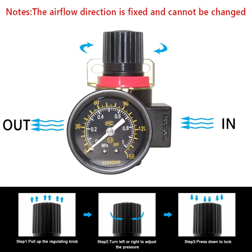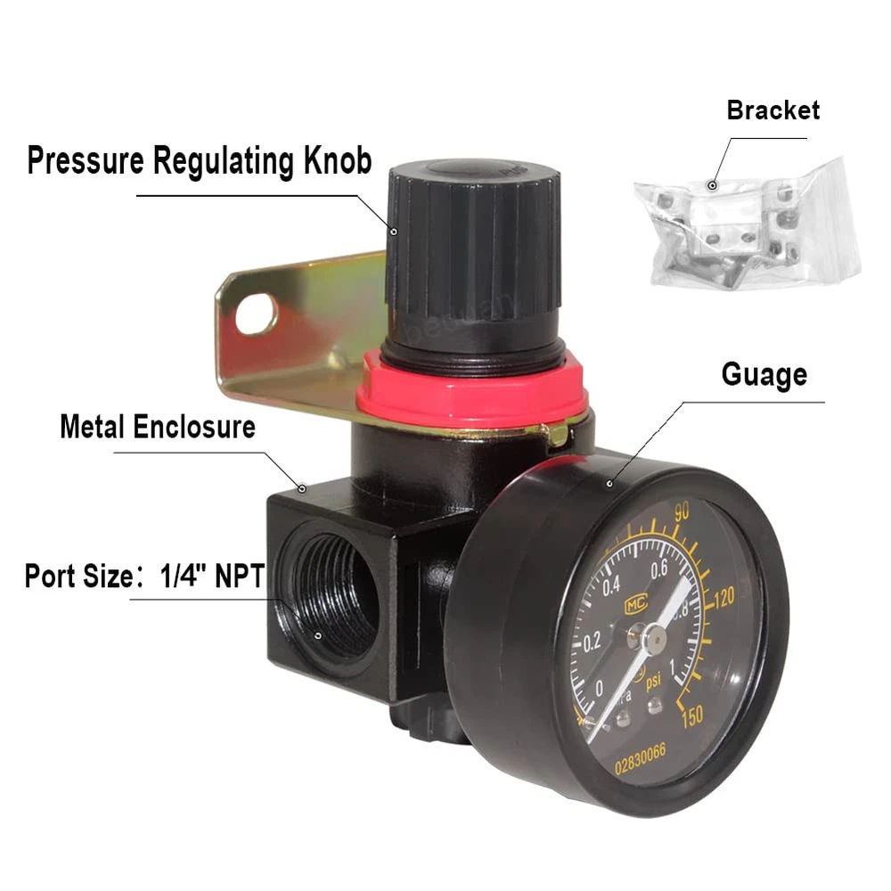 Inlet Size: 1/4” NPT Female Operating Pressure:0-145psi;MAX.working pressure 160psi environment temperature:40℉-140℉ Light weight air pressure Regulator, easy to install and remove. Using this regulator can precisely regulate and maintain constant air pressure to your tools.
