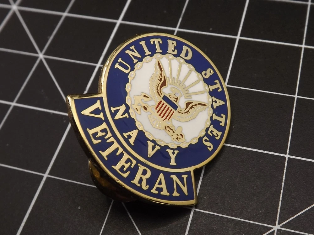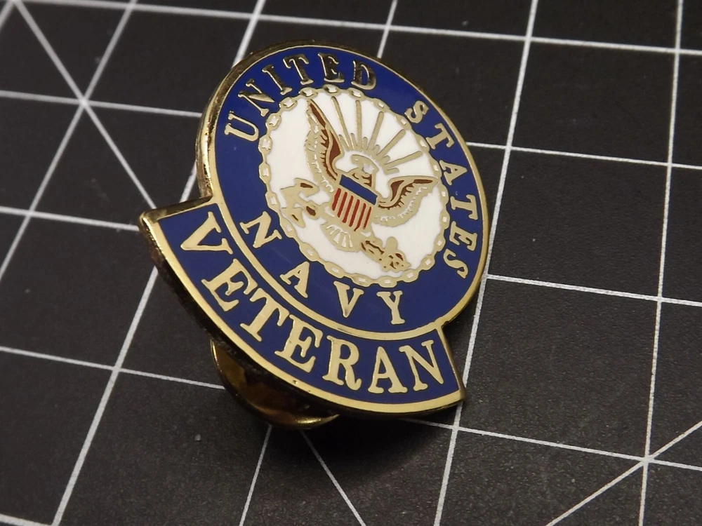 BRAND NEW Lapel Pin United States Navy VETERAN White & Blue Enamel 1-1/8" Lifetime Guarantee on Workmanship and Quality! All our Lapel/Hat pins come with a lifetime guarantee for workmanship and quality. Save on Shipping Costs! We offer combined shipping to save you money! If you want to purchase two or more items from us, please use the "offer" feature instead of the "buy it now" option. This way, we can consolidate all your items into one invoice, providing you with cost-effective shipping. Important Note: Please be aware that some backgrounds in the photos have one-inch squares to help you gauge the size. The blue background, when shown, is for photographic purposes only. Rest assured, we securely pack and ship the lapel pin only. Pinbacks (clutches) may be different than shown in photos, coming in either rubber or metal. Let us know if you have a preference. You may be interested in our other eBay listings .