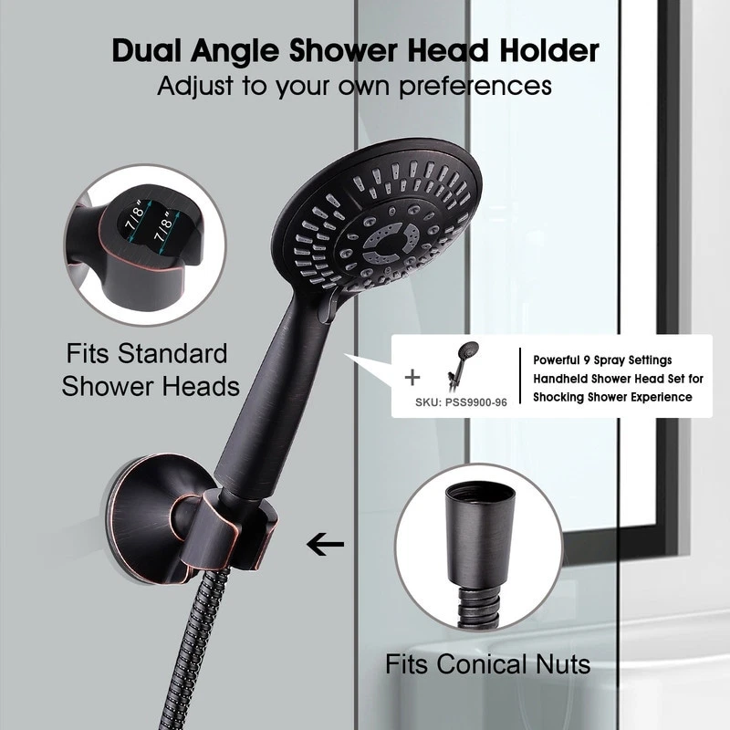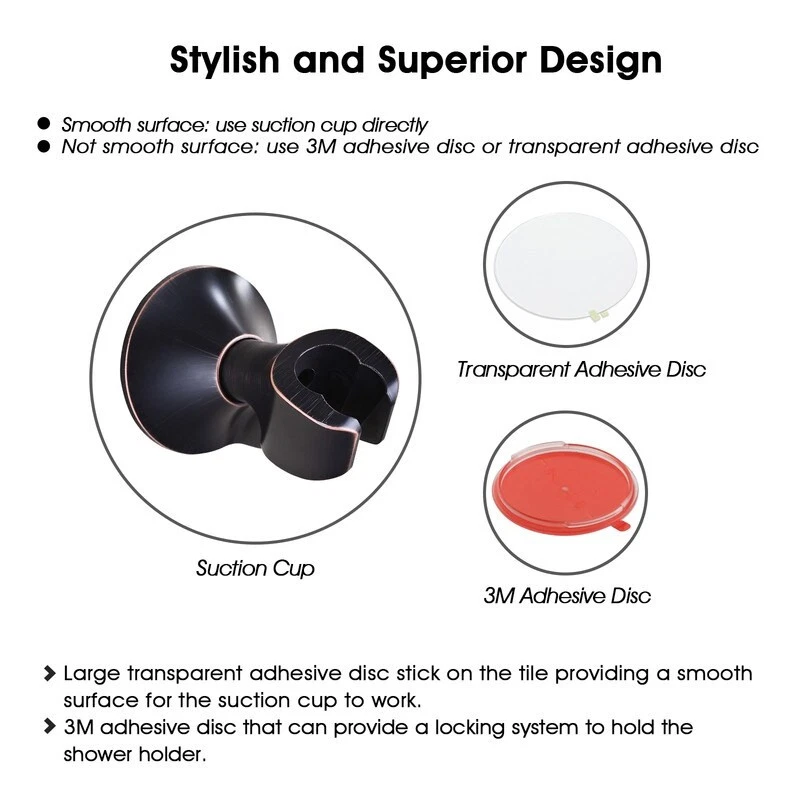 STRONG SUCTION SHOWER HEAD HOLDER: large super strong suction cup with good air tightness of the silicone material, gives it strong adsorption capacity, sturdy enough to hold up to 6.6lbs.EASY INSTALLATION: The wall bracket suction can be applied directly onto a clean, flat and smooth surface. For textured/rough surfaces, we have included a large transparent single side adhesive disc that can stick on the tile providing a smooth surface for the suction cup to work, and a 3M disc that can provide a locking system to hold the shower holder.NO TOOLS NEEDED: Mounts on most smooth surface without requiring any drills, nails or screws. Won't leave any holes on your walls and easier to remove or relocate compared to screw mounting.DUAL SHOWER ANGLE POSITIONS: 2 shower angle positions are Free Shipping Over $49.99* Details BRIGHT SHOWERS Handheld Shower Head Holder, Wall Suction Bracket Includes Product Description: STRONG SUCTION SHOWER HEAD HOLDER: large super strong suction cup with good air tightness of the silicone material, gives it strong adsorption capacity, sturdy enough to hold up to 6.6lbs. EASY INSTALLATION: The wall bracket suction can be applied directly onto a clean, flat and smooth surface. For textured/rough surfaces, we have included a large transparent single side adhesive disc that can stick on the tile providing a smooth surface for the suction cup to work, and a 3M disc that can provide a locking system to hold the shower holder. NO TOOLS NEEDED: Mounts on most smooth surface without requiring any drills, nails or screws. Won't leave any holes on your walls and easier to remove or relocate compared to screw mounting. DUAL SHOWER ANGLE POSITIONS 2 shower angle positions are convenient for you to choose the angle of showerhead as your preference. FITS STANDARD SHOWERHEADS This product will hold standard handheld shower heads. The slot diameter is 7/8" fits most standard handheld showerheads and shower hose nuts, but please mind and measure your shower hose nuts diameter before you order.