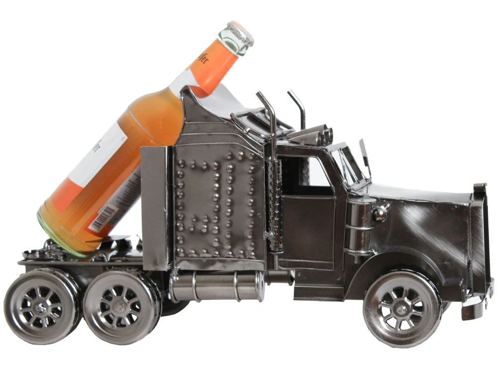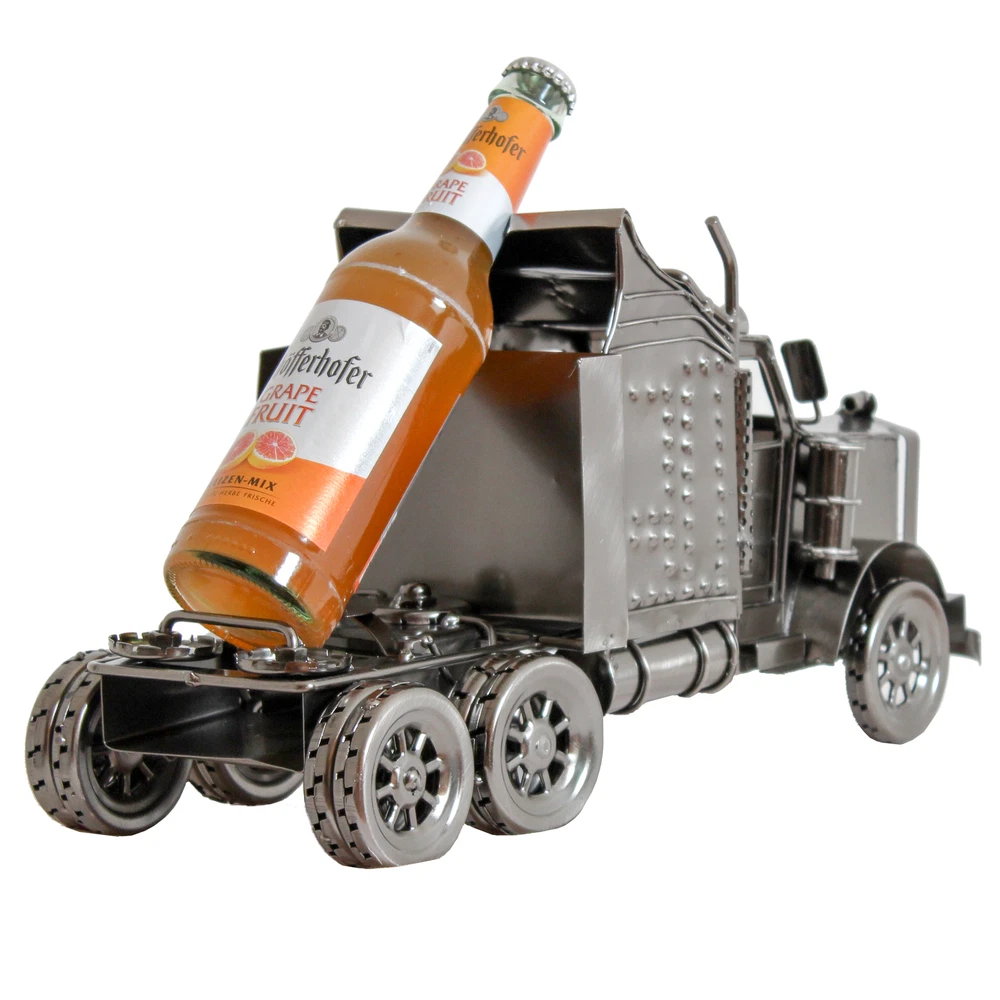 Handcrafted and welded from recycled metal Dimensions: 4.5"D x 15.35"W x 7.87"H Bottle Count: 1.00 Assembly Required: No Max. bottle diameter: 2.5" Truck comes WITHOUT bottle Cool and funky beer and wine bottle holder which truly is a work of art. Handcrafted and welded from recycled metal sheeting, nuts, screws, bolts etc. and polished to a warm smooth aged finish - each piece is an individual. This beer bottle american truck is an ideal conversation piece for dinner parties and you could add a bottle of your brew to make it an excellent gift for any occasion.
