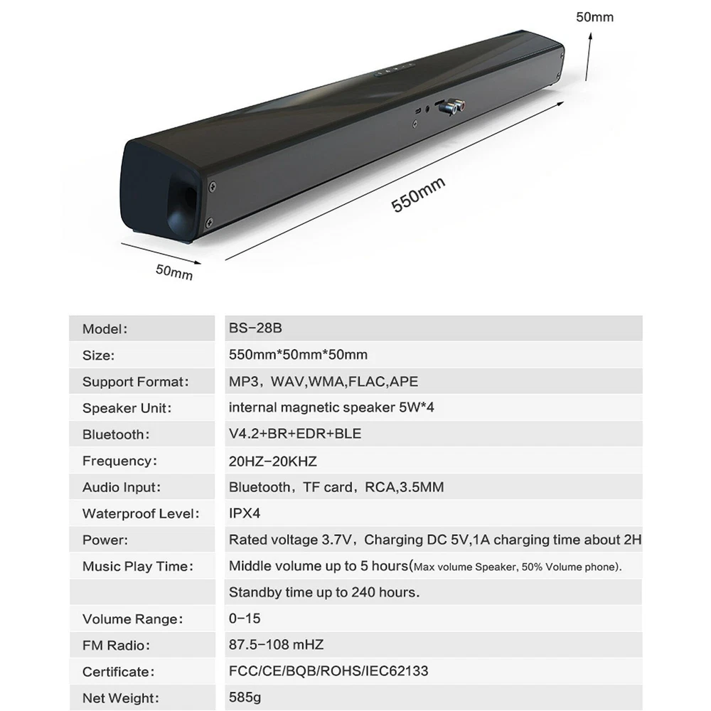 Product Description Surround Sound Bar 4 Speaker System Wireless BT Subwoofer TV Home Theater Remote Features: 1. Excellent Sound Performance : Completes your home theatre system with four full range high quality speakers 5W x 4 speakers, this sound bar could not only deliver clear sound in wide pitch range, but also provide 360°3D surround sound stereo for your sweet home theater. 2. Wired and Wireless Audio Streaming :Our high-quality soundbar for TV is powered with integrated inputs to bring all media in life with amplified audio. It can easily connect to your TV, pc or laptop via AUX, USB, coaxial. Features 5.1 Bluetooth with up to 10m range so you can stream with your mobile phone or tablets anywhere in the room with just a tap of a finger. 3. Buttons or Remote :Our high-quality soundbar for TV is powered with integrated inputs to bring all media in life with amplified audio. It can easily connect to your TV, pc or laptop via AUX, USB, coaxial. Features 5.1 Bluetooth with up to 10m range so you can stream with your mobile phone or tablets anywhere in the room with just a tap of a finger. 4. 22 Inch Portable Slim Design:The light-weight body allows you to take the great sound experience with you anywhere you go. However, the small body does not play games! Enjoy the sound at the maximum 10W output for 3-5 hours non-stop.With the sleek look, our soundbar is easily incorporated in your home with a fashionable take.Can be carried freely, wherever in backyard, outdoor activity, bedroom,car, garage and so on. Specifications: Channel:2.0 1. Bluetooth version: V5.0 2. Speaker: 5W×4 3. Bluetooth distance: 10M 4. Battery capacity: 2000mA 3.7V 5. Nominal voltage: DC 5V 6. Music playing time: about 5 hours. 7. Standby time: 240 hours. 8. 1A Charging time: about 2 hours. 9. Audio Input: Bluetooth, RCA , 3.5mm Aux, TF card 10.Dimension: 550 × 50 × 50mm / 21.65 inch × 1.97 inch × 1.97 inch 11.Net Weight: 860g 12.FM Radio Frequency: 87.5-108 13.Accessories: charging cable, 3.5MM-RCA cable, 3.5MM audio cable, manual 14.Support TV/PC/Phone/Tablet/Laptop/MP3/MP4/DVD player/TV Box Audio Package included: 1 x Speaker 1 x Remote Control 1 x USB Charging Cable 1 x RCA Audio Cable 1 x English Manual About Us Shipping Terms Returns Contact Us About Item All items sold by us are being described to the best of our abilities, as accurate as possible, and with utmost conscientiousness on our part. However, to avoid any potential oversights, I respectfully request your assistance in helping us to make this a mutually satisfactory transaction by THOROUGHLY reviewing item description and photos, and asking all questions PRIOR TO BIDDING. Customer Satisfactory 1.We back our commitment with superb service, 100% full money back and a customer satisfaction guarantee. 2.I am here and ready to assist you with any questions or concerns you might have before or after the purchase. 3.My goal is to make sure you are a happy customer and pleasant shopping with us. Feedback If you are satisfied with the purchase and our total service, your comment is very important in our business success. Please take a minute to leave us a positive feedback with an overall Detailed Selling Rating (DSR) of 5. Our eBay account setup auto feedback, so eBay system gives you automatically Positive feedback back after your positive feedback left. IF YOU PLAN TO GIVE US A NEUTRAL/NEGATIVE FEEDBACK OR OPEN EBAY/PAYPAL CASE, PLEASE WRITE TO US IMMEDIATELY SO THAT WE CAN DO OUR BEST TO RESOLVE YOUR PROBLEM. United States Buyers Same business day free shipping within United States All orders will be shipped through USPS First Class, UPS and Fedex depends on the weight of the items. Shipping Time Usually ,Parcel will be delivered 2-5 working day include Handling time. Sometimes shiping time may has a little delay, such as Bad wether,Holidays We stand behind everything that we sell and will do everything possible to assure you are satisfied. When you receive your purchase if you are not 100% satisfied, please sent me ebay message and we will do our best to make you happy. If you still want to return your purchase, simply ship the item(s) back to us and we will refund your original purchase price and the original shipping charge. Buyers are responsible for the postal cost of returning the items. We must be notified of the intent to return your item within 30 days of receiving the item. Items returned must be in the same condition that they were received. How to return 1,Please ask us for return address . 2,Shipping back the package . The RMA#(Return Merchant Authorization Number = Your ebay ID) must be clearly written on the return package ,Otherwise the package will be refused. 3,Sent us the return tracking number. 4,All returns will be inspected prior to a credit being issued. 1:Returns are accepted within 60 days of purchase. 2:All returned items MUST BE in the original packaging. 3:We will be happy to assist you if if any item needs to be returned or replaced 4:Please don't open a return request before contacting us first to solve, many thanks. Sent ebay message in English If you have any questions, our Customer Service staffs welcome you to sent me ebay message. We strive to answer all questions and resolve any problems as quickly as possible. Business Hours: Monday-Saturday 9:00-17:00 About Us About Item All items sold by us are being described to the best of our abilities, as accurate as possible, and with utmost conscientiousness on our part. However, to avoid any potential oversights, I respectfully request your assistance in helping us to make this a mutually satisfactory transaction by THOROUGHLY reviewing item description and photos, and asking all questions PRIOR TO BIDDING. Customer Satisfactory 1.We back our commitment with superb service, 100% full money back and a customer satisfaction guarantee. 2.I am here and ready to assist you with any questions or concerns you might have before or after the purchase. 3.My goal is to make sure 