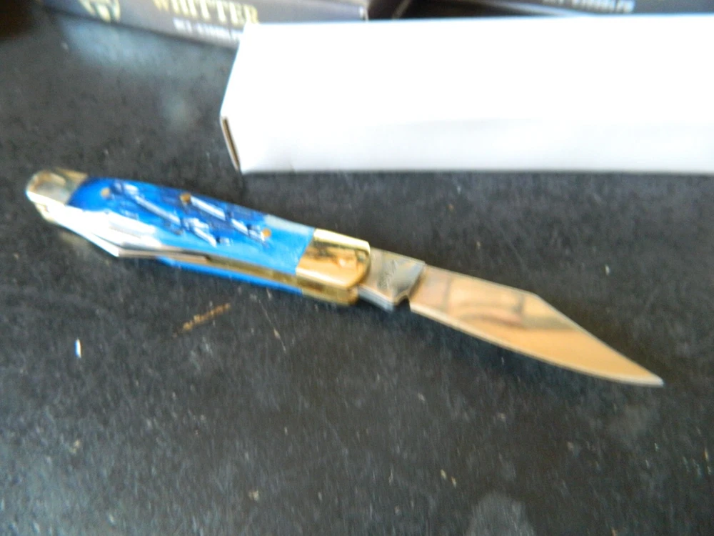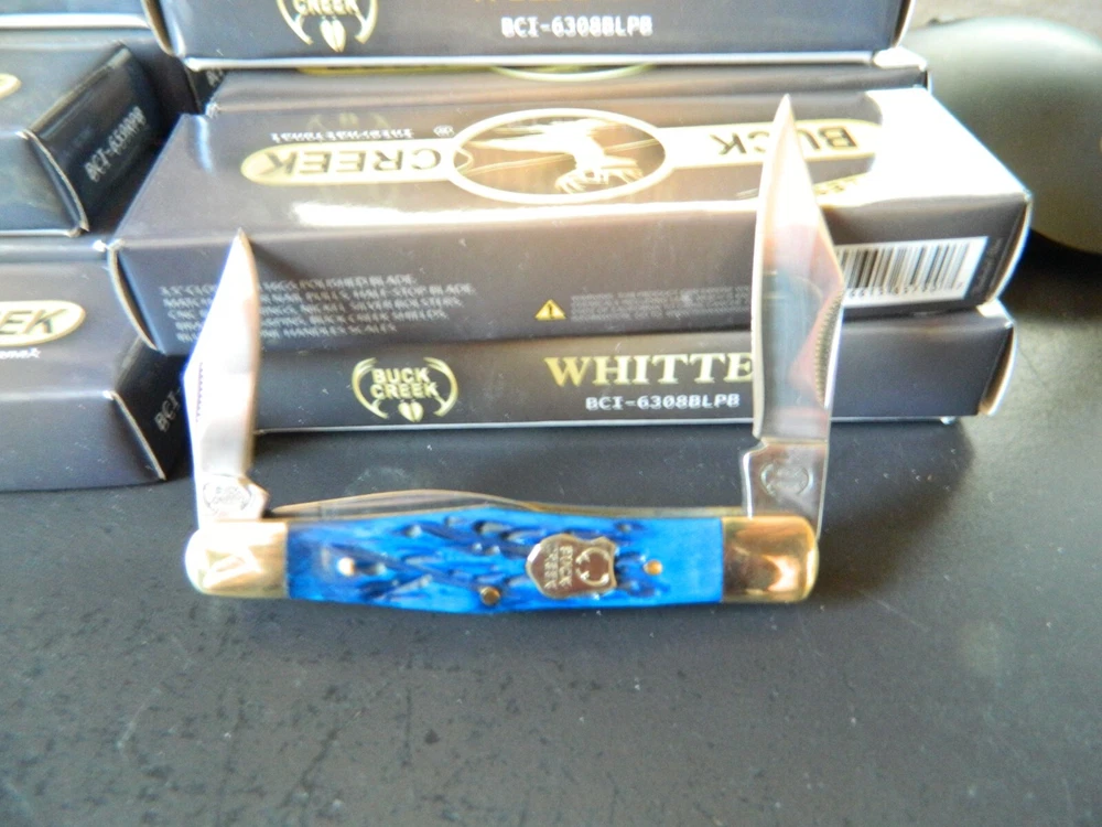 WE HAVE (6) WHITTLER 3 1/2" DARK BLUE JIGGED BONE HANDLES, some say it looks like a Coke Bottle design call it what you like. One thing that sticks out to me is it has two Clip Point Blades and one Spear Point or Pen, the large clip point is 2 1/2" with a 2 1/4" edge the small one 1 1/2" with 1 1/4" edge, and the Spear Point is the same 1 1/2" 1 1/4" This is the Limited Edition part of this knife along with the handle design both sides of the handle come to a point. Most Whittlers only have one side of the handle pointed, the bottom. BUCK CREEK CUTLERY of SOLINGEN GERMANY, LIMITED EDITION 3 1/2" CLOSED WHITTLER DESIGN POCKET KNIFE WITH A BLUE PICK BONE HANDLE, almost all companies have stopped making this design it's too costly and hard to get the Bone right. But the smaller companies like BUCK CREEK have the time and money to do this and do it right, they put two Clip Point style Blades and a Pen or Spear point blade on this handle made of 440HC Stainless steel (Rc) 56 to 58 hardness, Nickel Silver Bolsters, and Brass Pins and Liners. And the Back Springs are slammers so please be careful, and they put their Logo on an brass shield embed in the bone. Model # BC 6308BLPB Weighs 2.2oz. Buck Creek is in Solingen Germany, 39 years now in FEB. these are collectors grade knives We will give you $$$$$$$$$$$$$$$$$$$$$$ FREE SHIPPING $$$$$$$$$$$$$$$$$$$ WE THANK YOU AND GOD BLESS YOU. by adding my eBay Store to your Favorites, . - Sign up and receive our emails, why SALES that is the only email we will ever send to you. We are always trying to get different knives into your hands, so by saving you some money maybe you will try out a new brand. Plus every listing we have is put on sale from the highest to the lowest priced items, and lastly many times we put knives that there are only 1 or 2 left in our stock by receiving our email you will get first shot at these items, Thank you Greg