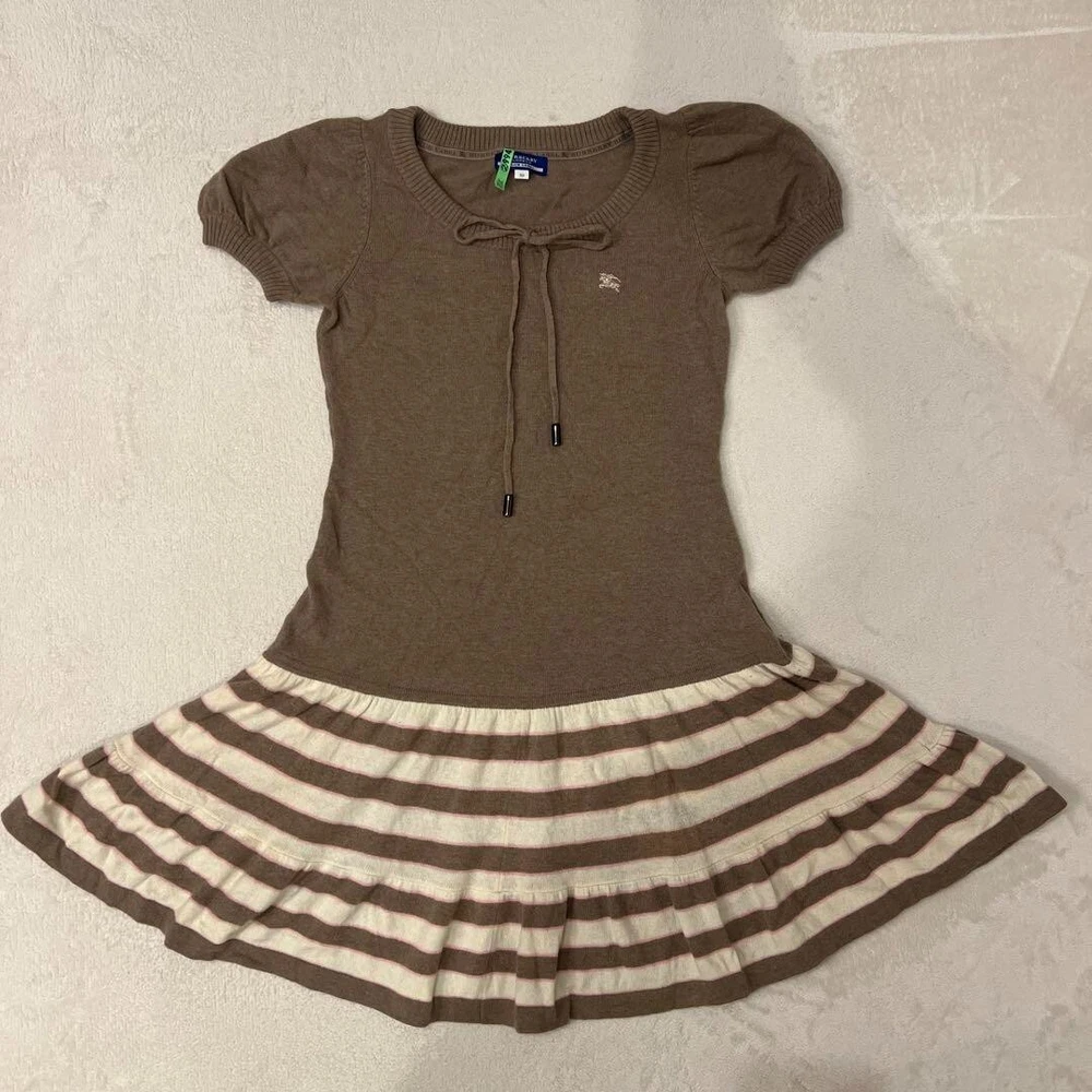 Department: Women Size Type: Regular Pattern: Border Color: Brown Character: NA gtin13: Does not apply Brand: Burberry Neckline: Crew Neck Personalize: No Garment Care: NA Dress Length: 28.3 in Material: Cashmere, Nylon, Rayon, Wool Country/Region of Manufacture: China Sleeve Length: Short Sleeve Theme: NA MPN: NA Handmade: No Occasion: Business, Casual, Travel Size: 38 Fabric Type: Knit Style: A-Line Sleeve Type: NA UPC: Does not apply Vintage: No Season: Fall, Spring, Winter Closure: Pullover