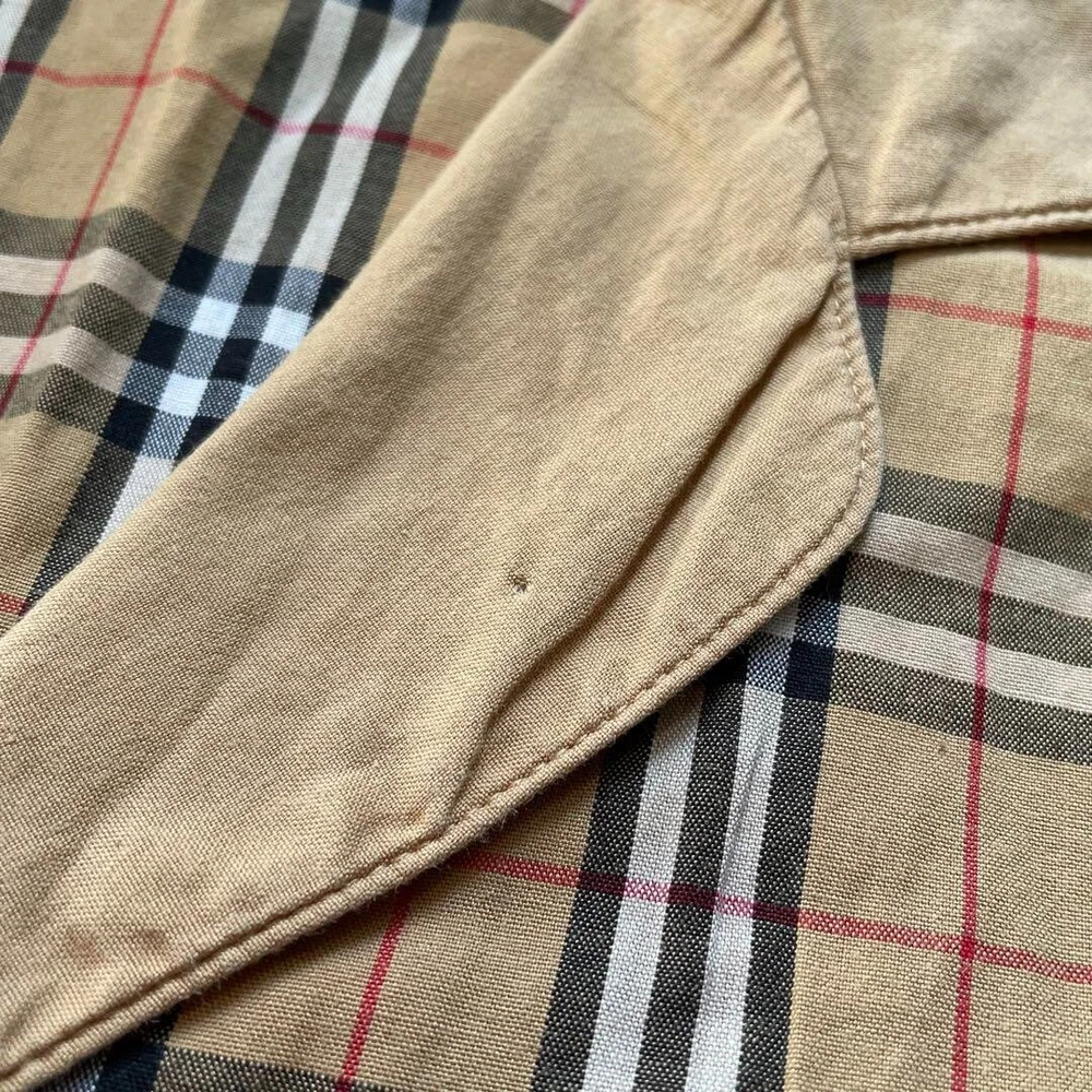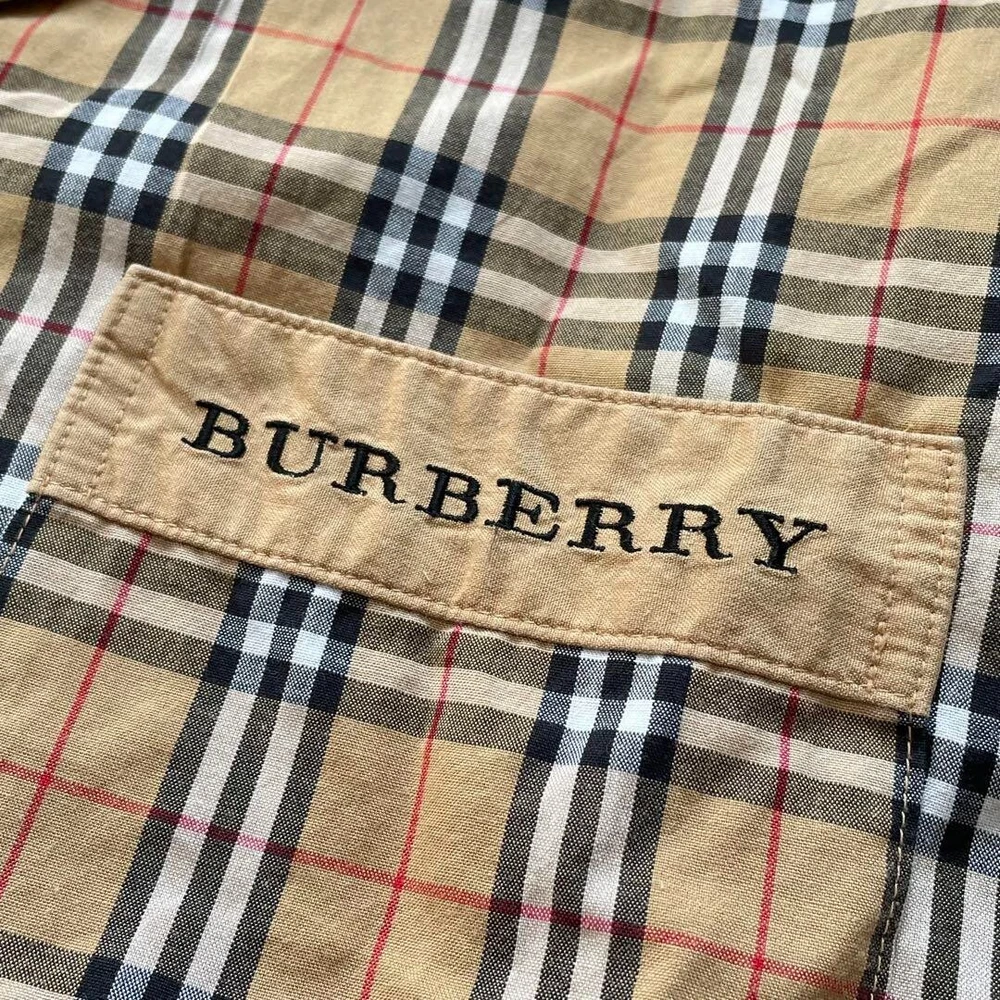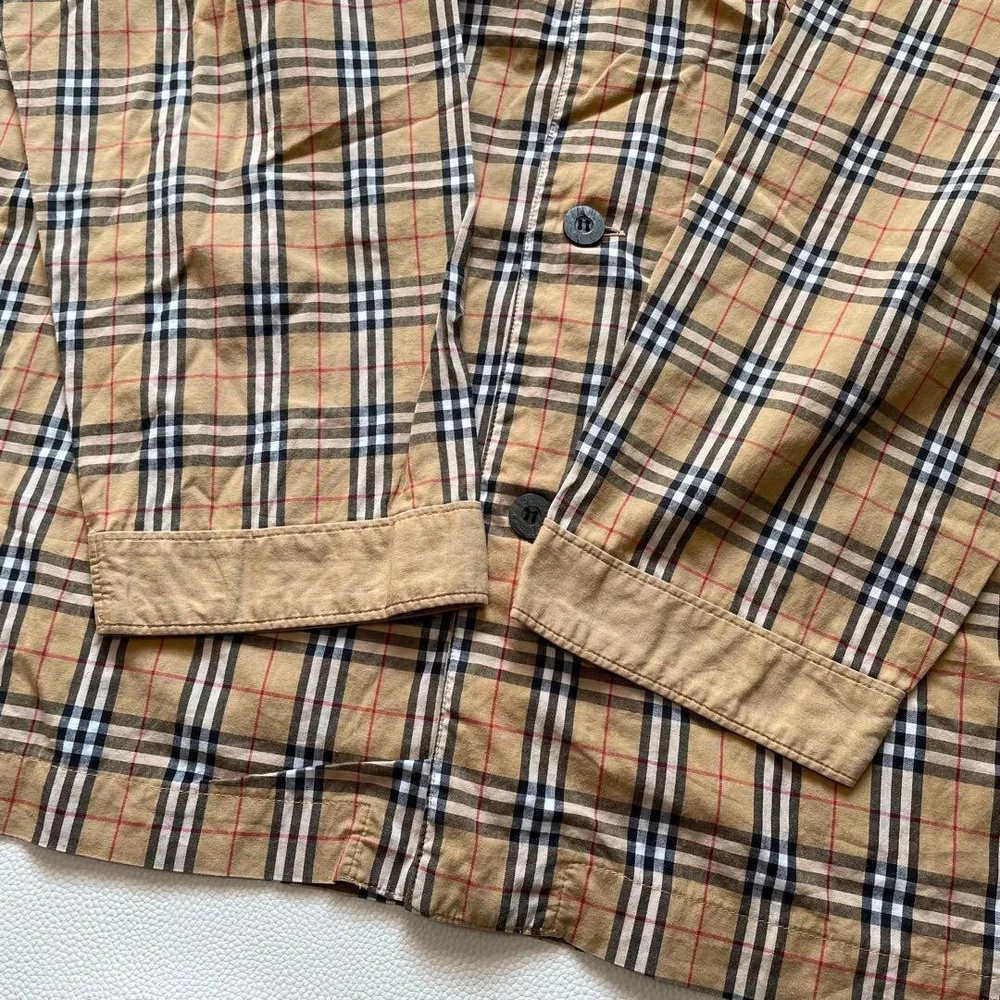 Theme: NA Material: Cotton Character: NA Size Type: Regular Fit: Slim Product Line: NA Accents: Button Size: M Closure: Button Personalize: No Brand: Burberry Department: Men UPC: Does not apply Pattern: Check Features: Pockets Neckline: Collared Occasion: Business, Casual, Travel Season: Fall, Spring, Winter MPN: NA Sleeve Length: Long Sleeve Type: Button-Up Color: Beige Fabric Type: NA Model: NA Chest Size: 40.9 in gtin13: Does not apply Handmade: No Country/Region of Manufacture: Japan Garment Care: NA Collar Style: NA Vintage: No
