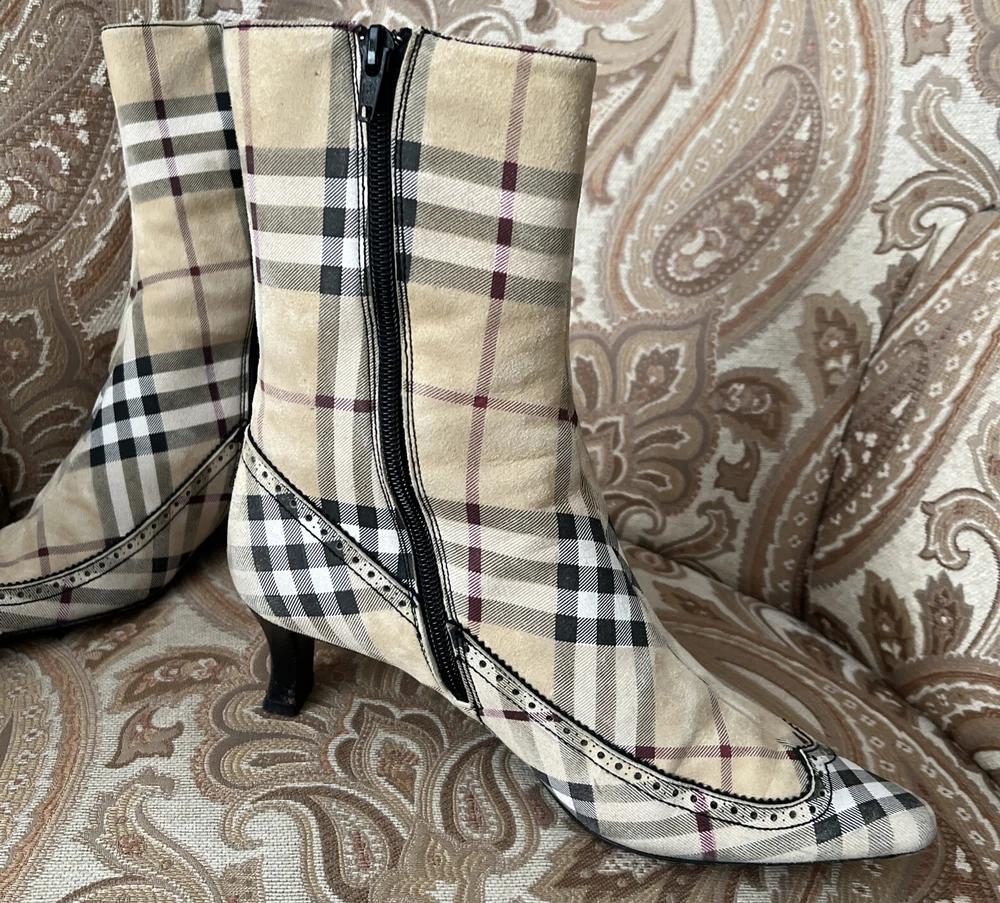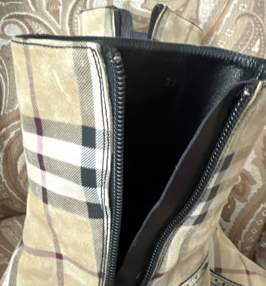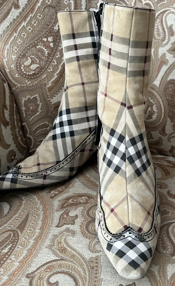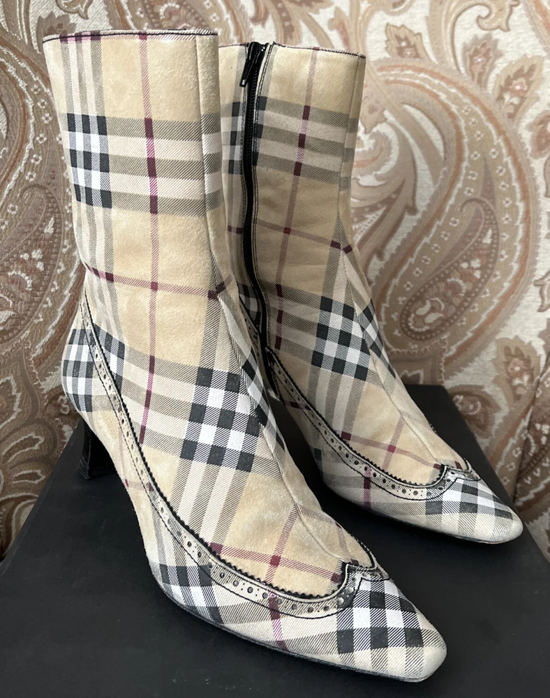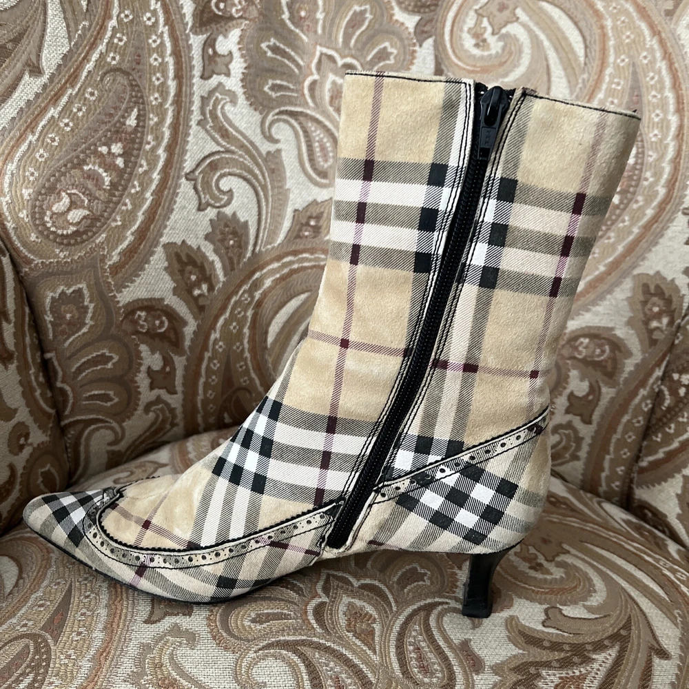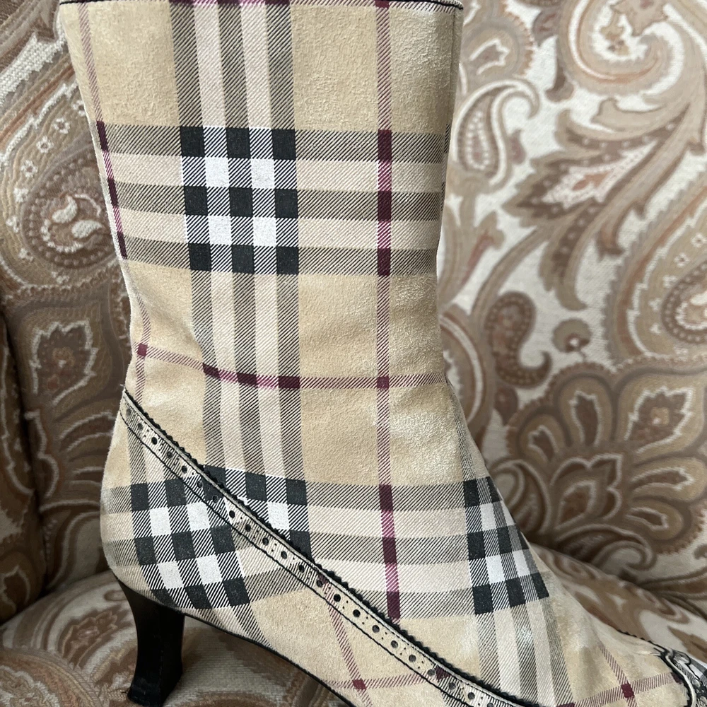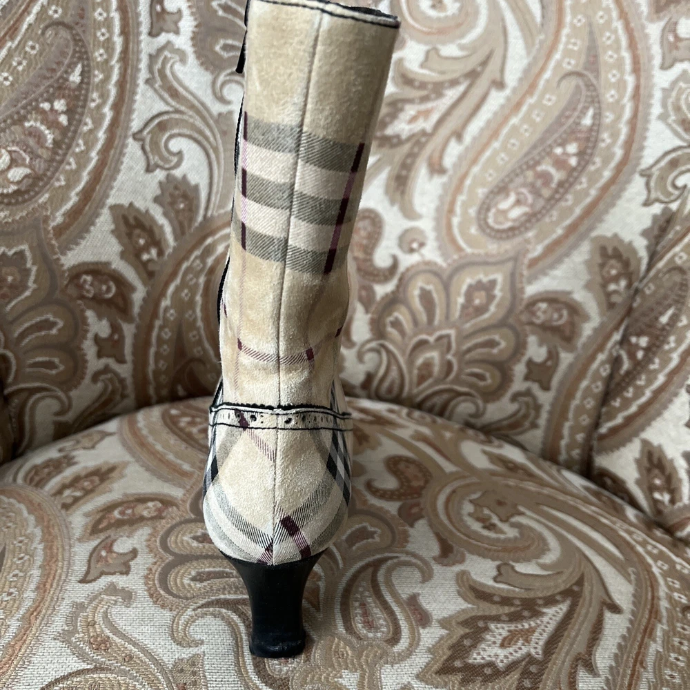 RARE BURBERRY Nova Check Suede, Kitten Heeled Boots Womans Size 37, US Size. These gently loved Burberry house check boots are from our personal collection and smoke free home. Zippers in perfect condition. Soles have a little wear. Burberry nova check suede exterior and leather interior. Kitten heals and cute detailing! Size 37 = US size 7 runs narrow and runs small. Please see photos as they are part of the description.