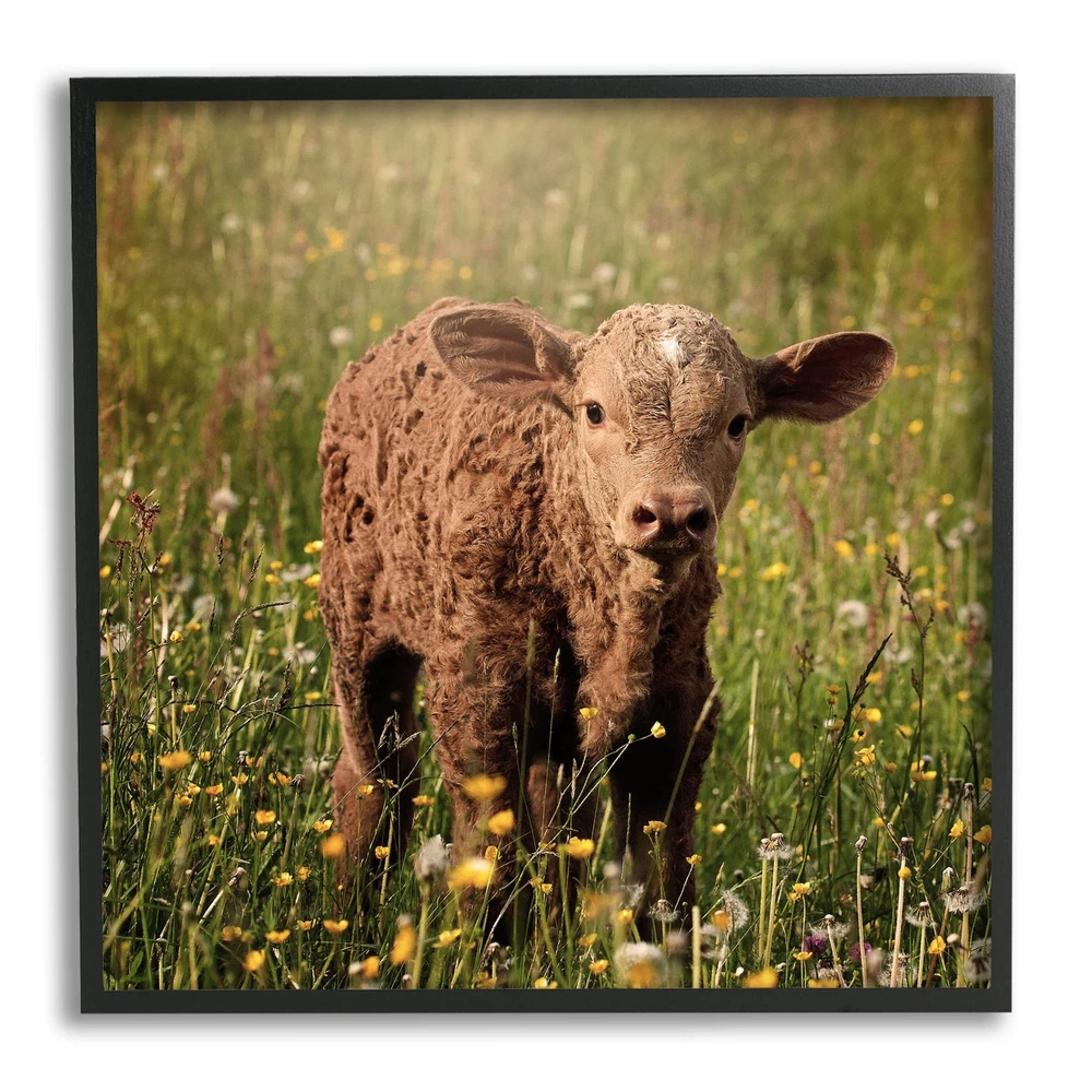 Dimensions: 17 x 1.5 x 17 Framed Wall Art is Ready to Hang - No Installation or Hardware Needed. For Easy Set Up Lean or Layer Artwork on Shelf or Against Wall. Our giclée prints are carefully mounted on a durable MDF backing, and then perfectly finished in a 1.5 inch thick woodgrain frame. Mounted frame colors include black, gray farmhouse and white. Made In USA. Artwork Relates To: Calf; Cow; Cattle; Mammal; Animal, Flowers, Meadow Design by Daphne Polselli