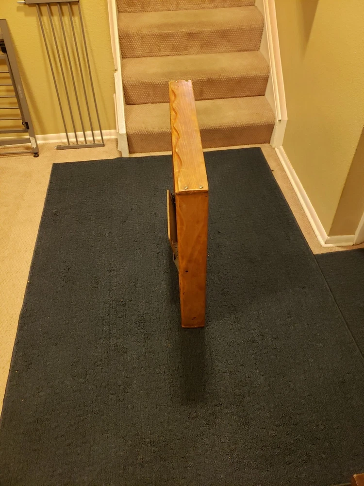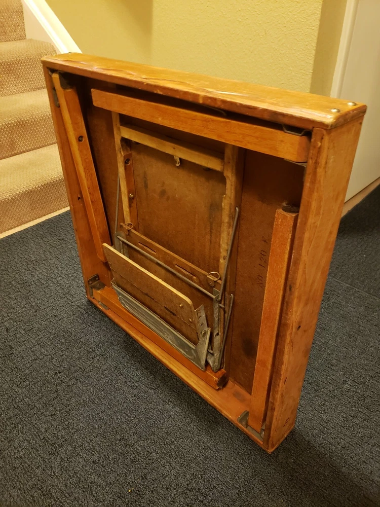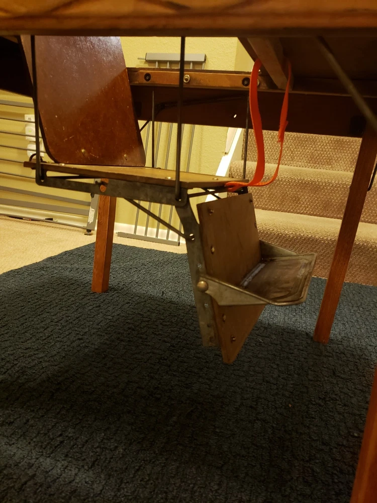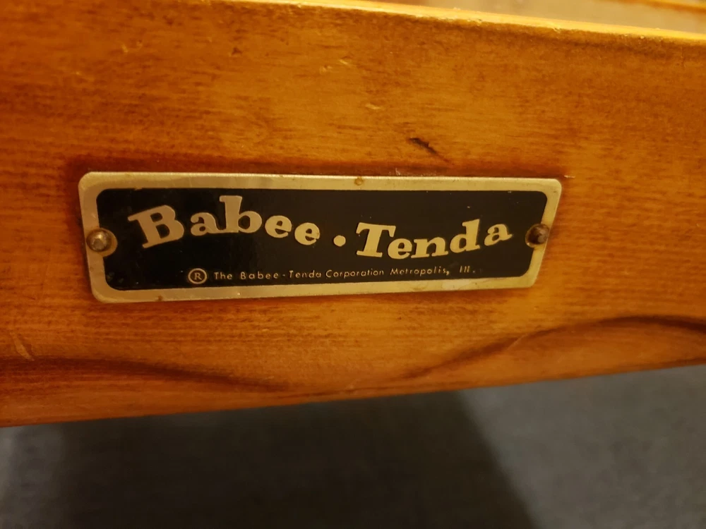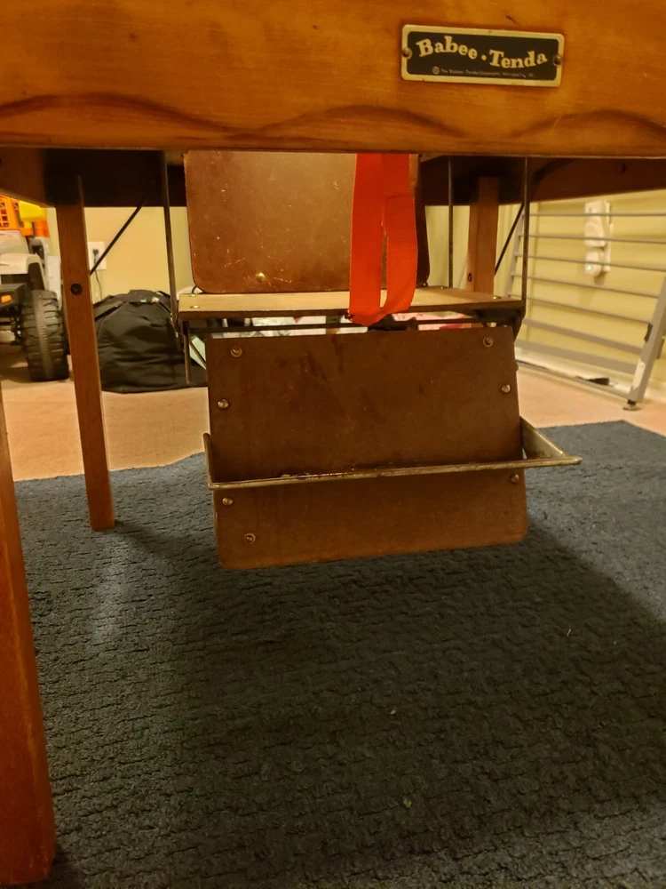 Vintage Babee Tenda infant table, "high chair", feeding table. Collapsible like a folding table. Built-in seat with fold out foot plate. Everything works fine. Solid wood with metal hardware. No plastic parts. I did replace the center strap with a new orange one. Originally had wheels but those are gone. Super cool multi functional table. Good for feeding, cutting hair, drawing, arts and crafts etc.