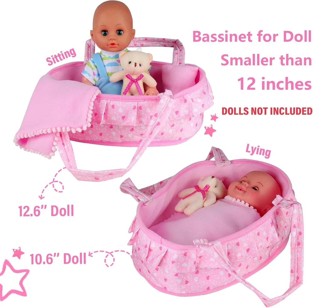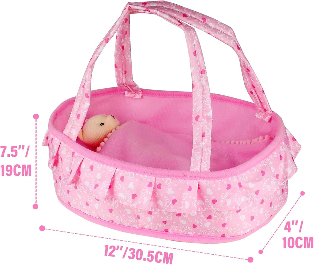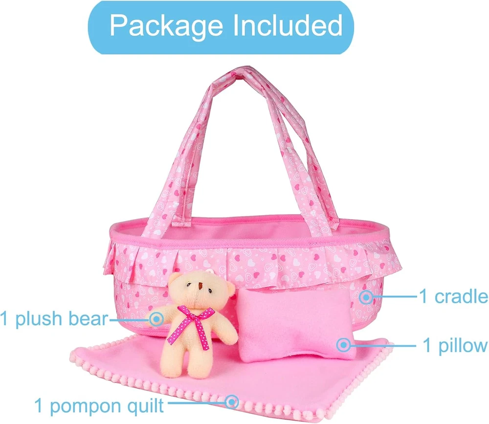 Store New Arrivals Add to Favorite View Feedback Contact Baby Doll Cradle Bassinet Carry Bag with Soft Pillow, Quilt & Bear for 8-12 Inch Dolls Baby Doll Cradle Bassinet Carry Bag with Soft Pillow, Quilt & Bear for 8-12 Inch Dolls Product Description Baby Doll Cradle Bassinet Playset – Portable Doll Bed with Accessories Introduce your little one to the world of imaginative play with this Baby Doll Cradle Bassinet . Designed for 8-12 inch dolls , this adorable cradle doubles as a portable doll carrier and cozy doll bed , offering everything needed for pretend play. Complete with a soft pillow , quilt , and a cute bear , this set provides a safe, comfortable space for baby dolls to rest, sleep, and travel. Features Portable & Versatile : This doll cradle bassinet can easily be used as both a bed and carrying bag , perfect for on-the-go play. Complete Accessories : Includes a soft pillow , cozy quilt , and a cute bear , ensuring your baby dolls are comfortable and content. Ideal Size : Fits dolls sized 8 to 12 inches , making it suitable for various types of smaller baby dolls. Encourages Pretend Play : Perfect for young children to engage in imaginative play , teaching them nurturing and caring behaviors. High-Quality Materials : Crafted with soft, child-safe fabrics to ensure a gentle touch for dolls and easy cleaning for parents. Cute & Practical Design : The soft, inviting design makes this set a great addition to any toy collection, while the carrying handle allows for easy portability. Specifications Set Includes : 1 Baby Doll Bassinet, 1 Soft Pillow, 1 Quilt, 1 Bear Doll Compatibility : Fits 8-12 inch dolls Materials : Soft fabric and plush materials for comfort Color : Multi-color (including soft pastel hues) Recommended Age : Suitable for children aged 3+ years Possible FAQs What size dolls does this cradle fit? This cradle is designed for 8-12 inch dolls , such as smaller baby dolls and alive baby dolls . Is the cradle portable? Yes, the cradle functions as a portable doll carrier , complete with a carrying handle for easy transport. What accessories come with the cradle? The set includes a soft pillow , a cozy quilt , and a cute bear , ensuring your dolls have everything they need for comfort. Can this cradle be used for different types of dolls? Yes, this cradle fits smaller dolls ranging from 8 to 12 inches , including many popular baby doll brands. Is this cradle machine washable? The materials are generally easy to clean , and the fabric can be wiped down with a damp cloth for maintenance. What age group is this cradle suitable for? This cradle is recommended for children aged 3 years and up , perfect for those who enjoy pretend play . Does the cradle have a firm or soft base? The cradle has a soft, cushioned base to ensure your baby dolls rest comfortably. Is the cradle collapsible or foldable for storage? While not collapsible, the lightweight design makes it easy to store when not in use. Can the accessories be used with other dolls? Yes, the pillow, quilt , and bear can be used with other 8-12 inch dolls and accessories. Is this cradle suitable for boys or girls? This cradle is suitable for both boys and girls , as it encourages nurturing and creative play for any child. Item Weight 3.52 ounces Product Dimensions 6 x 3 x 0.5 inches Manufacturer recommended age 3 years and up PRODUCT DIMENSIONS : 3.0 inches x 6.0 inches x 0.5 inches. Weight: 3.52 oz About Us Welcome to Perishey, your premier destination for high-quality products at unbeatable prices. Our commitment to excellence ensures that you receive top-notch service and premium items across a variety of categories. Our professional customer support team is always ready to assist you with any inquiries or needs, ensuring a seamless shopping experience. We take pride in serving you and strive to bring a smile to your face with our exceptional service and products. Visit our eBay store to explore our full range of offerings and discover the great deals we have in store for you. Thank you for choosing Laelegencia. Payment policy We have eBay Managed Payments, allowing you to pay with any payment method that eBay accepts. Please ensure that your shipping addresses are accurate. Immediate payment is required before we can send out your package. Shipping policy We are always working hard to ensure your package arrives as soon as possible. Please understand that some factors like weather, high postal traffic, and the performance of shipping companies are outside of our control. In most cases, your package will arrive before due time as it is a high priority for us. If there are any unexpected delays, please let us know and we will take care of it immediately. We have multiple locations in the US; residents of these states will be charged tax according to the state they reside in. Tax information is available at checkout. Returns We are committed to your happiness. That’s why we offer a 30-Day Return Policy on items that you are not completely satisfied with. You have the option for a refund or an exchange of the item. No returns are available on items shipped outside of the USA.