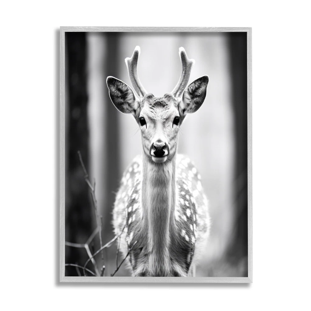 Add dimension to any room with our textured Framed Giclee Artwork. Our framed artwork is securely mounted into a 1.5-inch thick wood grain frame and ready to hang. Frames are available in three alluring styles: black, gray farmhouse and white. In addition, you should check out our oversized options if you want a statement piece. Wall Art is made in the USA. Framed Giclee Sizes Include Standard: 11 x 1.5 x 14 Large: 16 x 1.5 x 20 Oversized: 24 x 1.5 x 30 Wall Art is Ready to Hang with Hardware Free Hanging. No installation required. For Easy Set Up Lean or Layer Artwork on Shelf or Against Wall. Our giclée prints are carefully mounted on a durable MDF backing, and then perfectly finished in a 1.5 inch thick woodgrain frame. Mounted frame colors include black, gray farmhouse and white. Made In USA. Artwork Relates To: Animal, Deer, Mammal, Wildlife, Elk, Antler, Fawn, Monochrome Design by Ray Powers