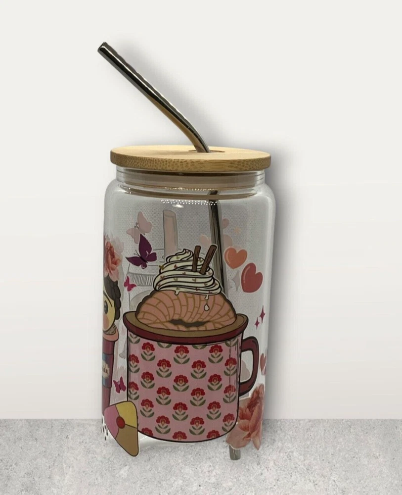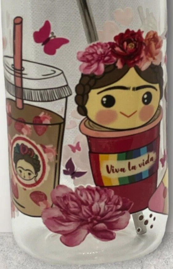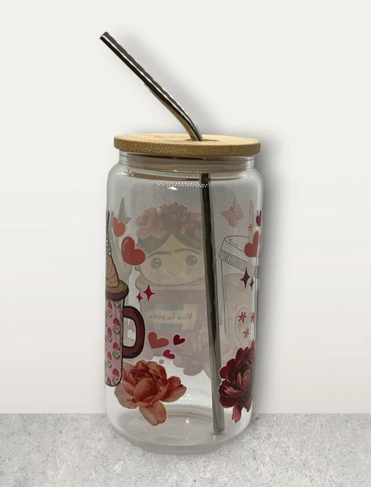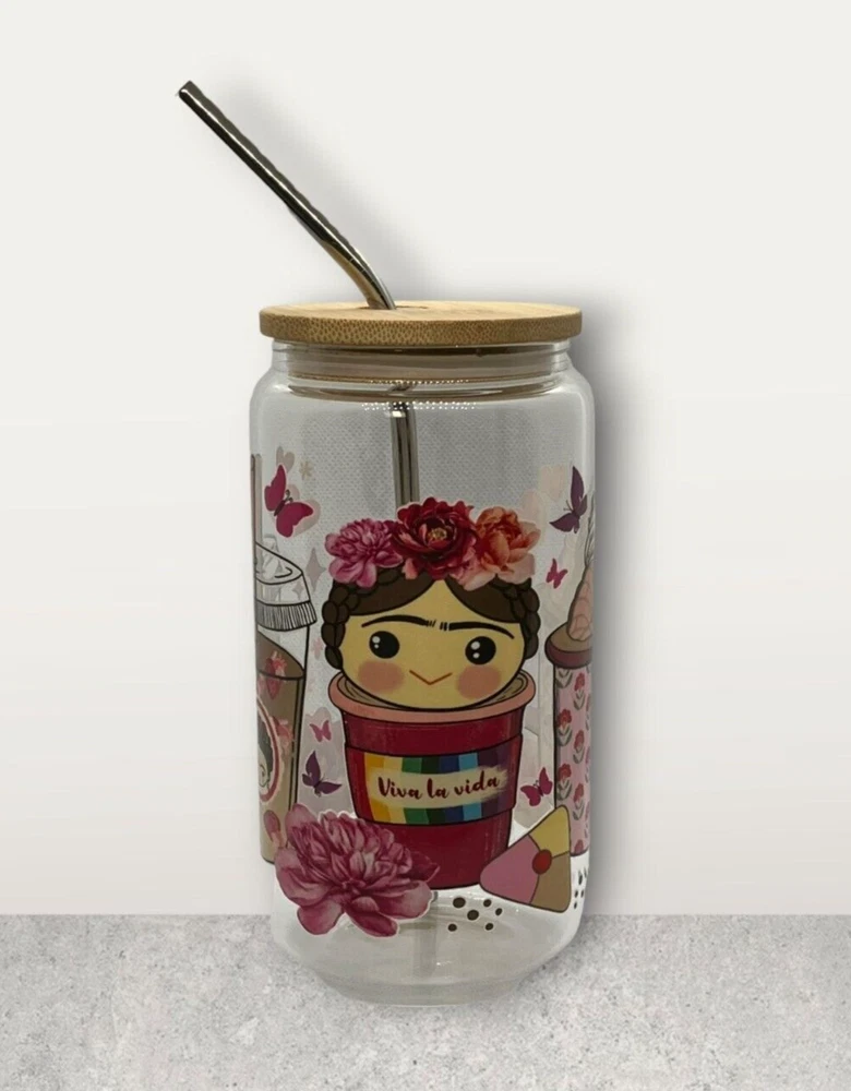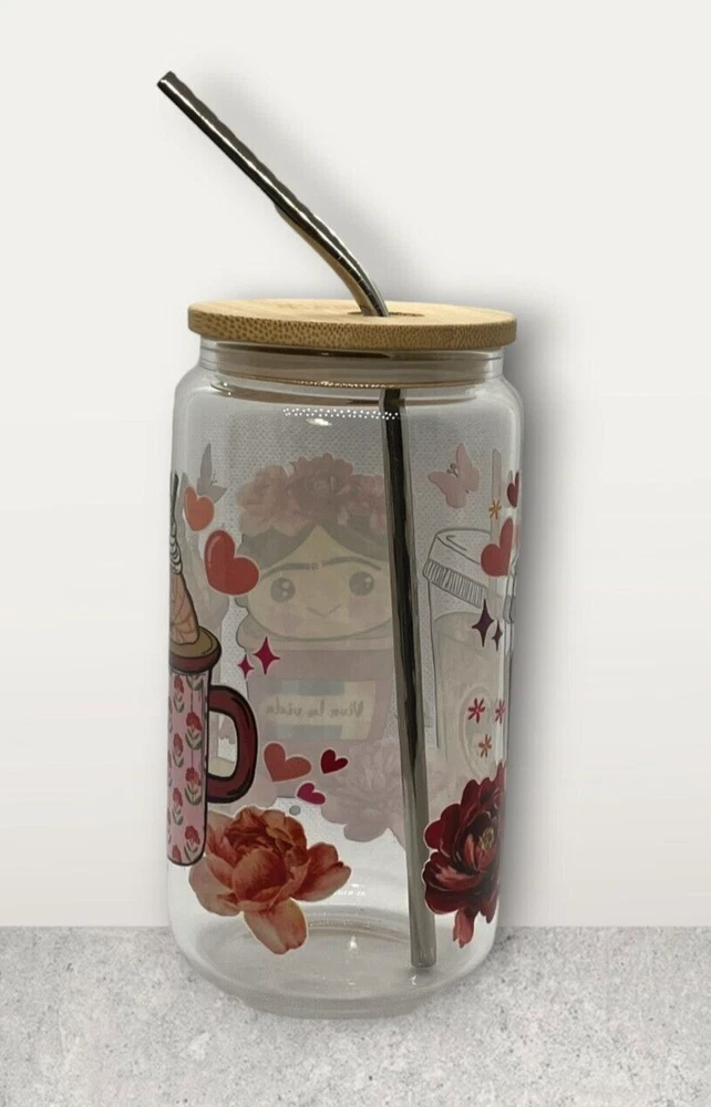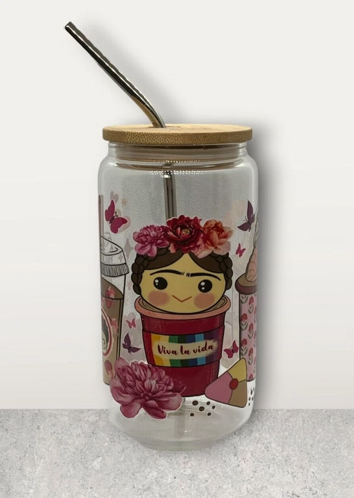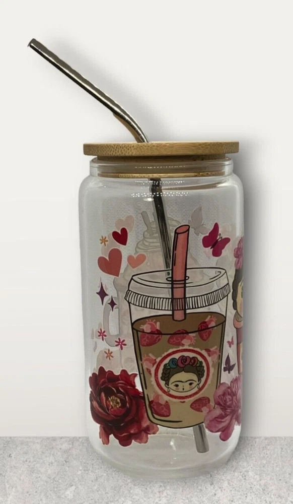 Enhance your drinking experience with this beautiful Frida 16oz glass can tumbler that comes with a bamboo lid, metal straw, and features a magnificent Frida character design. The tumbler is perfect for different drinks such as iced coffee, iced tea, or beer, and has a 3-inch width and 6-inch height. The tumbler is built with high-quality glass and bamboo material and can hold up to 16oz of your favorite drink. This three-piece tumbler set is perfect for teens, boys, girls, adults, and kids, and is designed to be eco-friendly. The tumbler features a modern style with a round and straight shape, and it is ideal for use in homes, gardens, and kitchen dining. Hand wash is recommended for care instructions.